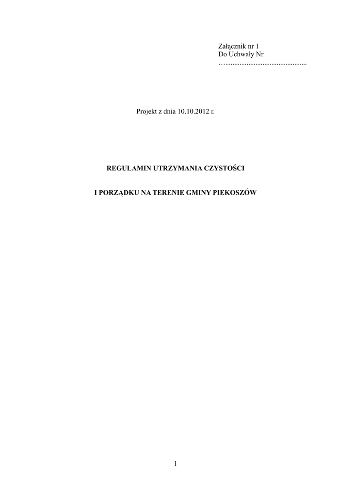 Załącznik nr 1 Do Uchwały Nr ….............................................. Projekt z dnia 10.10.2012 r. REGULAMIN UTRZYMANIA CZYSTOŚCI I PORZĄDKU NA TERENIE GMINY PIEKOSZÓW 1 ROZDZIAŁ 1 Postanowienia ogólne §1 Określa się szczegółowe zasady utrzymania czystości i porządku na terenie gminy Piekoszów, w szczególności dotyczące: 1. Wymagań w zakresie utrzymania czystości i porządku na terenie nieruchomości obejmujących: 1) prowadzenie we wskazanym zakresie selektywnego zbierania i odbierania odpadów komunalnych: tworzywa sztucznego, butelek plastikowych, szkła i odpadów opakowaniowych ze szkła, metalu, papieru; 2) prowadzenie selektywnego zbierania i odbierania odpadów komunalnych ulegających biodegradacji a także odpadów zielonych z ogrodów i parków; 3) prowadzenie selektywnego zbierania i odbierania powstających w gospodarstwach domowych i przekazywanych do punktu: przeterminowanych leków i chemikaliów, zużytych baterii i akumulatorów, zużytego sprzętu elektrycznego i elektronicznego, mebli i innych odpadów wielkogabarytowych, odpadów budowlano-remontowych i rozbiórkowych, zużytych opon, tekstyliów; 4) uprzątanie błota, śniegu, lodu i innych zanieczyszczeń z części nieruchomości służących do użytku publicznego; 5) mycie i naprawy pojazdów samochodowych poza myjniami i warsztatami naprawczymi. 2. Rodzaju i minimalnej pojemności pojemników przeznaczonych do zbierania odpadów komunalnych na terenie nieruchomości oraz na drogach publicznych, warunków rozmieszczania tych pojemników i ich utrzymania w odpowiednim stanie sanitarnym, porządkowym i technicznym. 3. Częstotliwości i sposobu pozbywania się odpadów komunalnych i nieczystości ciekłych z terenu nieruchomości oraz terenów przeznaczonych do użytku publicznego. 4. Zasad w zakresie prowadzenia selektywnego zbierania i odbierania odpadów. 5. Innych wymagań wynikających z Wojewódzkiego Planu Gospodarki Odpadami. 6. Obowiązków osób utrzymujących zwierzęta domowe, mających na celu ochronę przed zagrożeniem lub uciążliwością dla ludzi. 7. Wymagań odnośnie utrzymywania zwierząt gospodarskich na terenach wyłączonych z produkcji rolniczej. 8. Wyznaczania obszarów podlegających obowiązkowej deratyzacji i terminów jej przeprowadzania. §2 Ilekroć w niniejszym Regulaminie mowa jest o: 1) właścicielach nieruchomości – należy przez to rozumieć właścicieli nieruchomości w rozumieniu art. 2 ust. 1 pkt 4 ustawy z dnia 13 września 1996 r. o utrzymaniu czystości i porządku w gminach (Dz. U. z 2012 r., Nr 391); 2) selektywnym zbieraniu – należy przez to rozumieć selektywne zbieranie zgodnie z art. 3 ust. 2 pkt 5 ustawy o utrzymaniu czystości i porządku w gminach; 3) punkcie selektywnego zbierania odpadów – należy przez to rozumieć punkt selektywnego zbierania odpadów w myśl art. 3 ust. 2 pkt 6 ustawy z dnia 13 września 1996 r. o utrzymaniu czystości i porządku w gminach (Dz. U. z 2012 r., Nr 391); 4) odpadach komunalnych – należy przez to rozumieć odpady komunalne zgodnie z zapisem art. 3 ust. 3 pkt 4 ustawy z dnia 27 kwietnia 2001 r. o odpadach (Dz. U. z 2010 r., Nr 185, poz. 1243); 5) odpadach wielkogabarytowych – należy przez to rozumieć odpady wielkogabarytowe w myśl ustawy z dnia 27 kwietnia 2001 r. o odpadach (Dz. U. 2010 r. Nr 185 poz. 1243, z póź. zm.); 6) odpadach zielonych – należy przez to rozumieć odpady zielone zgodnie z treścią art. 3 ust. 3 pkt 2 8b ustawy z dnia 27 kwietnia 2001 r. o odpadach (Dz. U. z 2010 r., Nr 185, poz. 1243); 7) mieszkańcu – należy przez to rozumieć osobę fizyczną mającą na terenie gminy miejsce zamieszkania w rozumieniu przyjętym w art. 2d rozporządzenia WE 763/2008; 8) pojemnikach – należy przez to rozumieć także worek. ROZDZIAŁ 2 Wymagania w zakresie utrzymania czystości i porządku na terenie nieruchomości §3 Właściciele nieruchomości zapewniają utrzymanie czystości i porządku na terenie nieruchomości poprzez: 1. Wyposażenie nieruchomości w opisane w niniejszym Regulaminie w Rozdziale 3 pojemniki służące do zbierania odpadów komunalnych oraz utrzymywanie tych urządzeń w odpowiednim stanie sanitarnym, porządkowym i technicznym. 2. Selektywne zbieranie następujących rodzajów odpadów: 1) niesegregowanych (zmieszanych) odpadów komunalnych; 2) przeterminowanych leków i chemikaliów; 3) zużytych baterii i akumulatorów; 4) zużytego sprzętu elektrycznego i elektronicznego; 5) mebli i innych odpadów wielkogabarytowych; 6) odpadów budowlanych i rozbiórkowych; 7) zużytych opon; 8) odpadów zielonych; 9) papieru i tektury; 10) szkła bezbarwnego i kolorowego; 11) tworzywa sztucznego typu PET; 12) tworzywa sztucznego typu plastik przemysłowo-gospodarczy; 13) metal; - i przekazywania ich przedsiębiorcy odbierającemu odpady komunalne, w sposób opisany w niniejszym Regulaminie. 3. Zbieranie odpadów nie podlegających selekcji do pojemników o wielkości i liczbie uzależnionej od liczby mieszkańców nieruchomości w sposób opisany w niniejszym Regulaminie. 4. Przekazywanie odpadów zebranych selektywnie i pozostałych zmieszanych przedsiębiorcy w terminach wyznaczonych harmonogramem dostarczanym właścicielom nieruchomości. 5. Wydzielanie przeterminowanych leków ze strumienia odpadów komunalnych i przekazywanie ich do specjalistycznych pojemników znajdujących się w aptekach na terenie Gminy Piekoszów lub do gminnego punktu selektywnej zbiórki odpadów. 6. Wydzielanie zużytych baterii i akumulatorów ze strumienia odpadów komunalnych i przekazywanie ich do specjalistycznych pojemników znajdujących się w gminnym punkcie selektywnej zbiórki odpadów lub w szkołach i świetlicach. 7. Gromadzenie odpadów budowlanych w specjalistycznych pojemnikach lub kontenerach, uniemożliwiających pylenie. 8. Uprzątanie przez właścicieli nieruchomości, niezwłocznie po opadach: błota, śniegu, lodu z powierzchni chodników, p