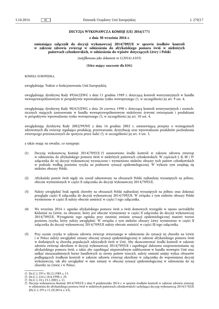 5.10.2016 Dziennik Urzędowy Unii Europejskiej PL L 270/17 DECYZJA WYKONAWCZA KOMISJI (UE) 2016/1771 z dnia 30 września 2016 r. zmieniająca załącznik do decyzji wykonawczej 2014/709/UE w sprawie środków kontroli w zakresie zdrowia zwierząt w odniesieniu do afrykańskiego pomoru świń w niektórych państwach członkowskich, w odniesieniu do wpisów dotyczących Litwy i Polski (notyfikowana jako dokument nr C(2016) 6103) (Tekst mający znaczenie dla EOG) KOMISJA EUROPEJSKA, uwzględniając Traktat o funkcjonowaniu Unii Europejskiej, uwzględniając dyrektywę Rady 89/662/EWG z dnia 11 grudnia 1989 r. dotyczącą kontroli weterynaryjnych w handlu wewnątrzwspólnotowym w perspektywie wprowadzenia rynku wewnętrznego (1), w szczególności jej art. 9 ust. 4, uwzględniając dyrektywę Rady 90/425/EWG z dnia 26 czerwca 1990 r. dotyczącą kontroli weterynaryjnych i zootech nicznych mających zastosowanie w handlu wewnątrzwspólnotowym niektórymi żywymi zwierzętami i produktami w perspektywie wprowadzenia rynku wewnętrznego (2), w szczególności jej art. 10 ust. 4, uwzględniając dyrektywę Rady 2002/99/WE z dnia 16 grudnia 2002 r. ustanawiającą przepisy o wymaganiach zdrowotnych dla zwierząt regulujące produkcję, przetwarzanie, dystrybucję oraz wprowadzanie produktów pochodzenia zwierzęcego przeznaczonych do spożycia przez ludzi (3), w szczególności jej art. 4 ust. 3, a także mając na uwadze, co następuje: (1) Decyzją wykonawczą Komisji 2014/709/UE (4) ustanowiono środki kontroli w zakresie zdrowia zwierząt w odniesieniu do afrykańskiego pomoru świń w niektórych państwach członkowskich. W częściach I, II, III i IV załącznika do tej decyzji wykonawczej wyznaczono i wymieniono niektóre obszary tych państw członkowskich w podziale według poziomu ryzyka na podstawie sytuacji epidemiologicznej. W wykazie tym znajdują się niektóre obszary Polski. (2) Afrykański pomór świń nigdy nie został odnotowany na obszarach Polski najbardziej wysuniętych na północ, obecnie wymienionych w części II załącznika do decyzji wykonawczej 2014/709/UE. (3) Należy uwzględnić brak ognisk choroby na obszarach Polski najbardziej wysuniętych na północ oraz dokonać przeglądu części II załącznika do decyzji wykonawczej 2014/709/UE. W związku z tym niektóre obszary Polski wymienione w części II należy obecnie umieścić w części I tego załącznika. (4) We wrześniu 2016 r. ognisko afrykańskiego pomoru świń u świń domowych wystąpiło w rajono savivaldybė Kėdainiai na Litwie, na obszarze, który jest obecnie wymieniony w części II załącznika do decyzji wykonawczej 2014/709/UE. Wystąpienie tego ogniska przy ostatniej zmianie sytuacji epidemiologicznej stanowi wzrost poziomu ryzyka, który należy uwzględnić. W związku z tym niektóre obszary Litwy wymienione w części II załącznika do decyzji wykonawczej 2014/709/UE należy obecnie umieścić w części III tego załącznika. (5) Przy ocenie ryzyka w zakresie zdrowia zwierząt stwarzanego w odniesieniu do sytuacji tej choroby na Litwie i w Polsce należy uwzględnić zmiany obecnej sytuacji epidemiologicznej w zakresie afrykańskiego pomoru świń w dotkniętych tą chorobą populacjach zdziczałych świń w Unii. Aby skoncentrować środki kontroli w zakresie zdrowia zwierząt określone w decyzji wykonawczej 2014/709/UE i zapobiegać dalszemu rozprzestrzenianiu się afrykańskiego pomoru świń, a także aby zapobiegać niepotrzebnym zakłóceniom w handlu wewnątrz Unii oraz unikać nieuzasadnionych barier handlowych ze strony państw trzecich, należy zmienić unijny wykaz obszarów podlegających środkom kontroli w zakresie zdrowia zwierząt określony w załączniku do wspomnianej decyzji wykonawczej, tak aby uwzględnić w nim zmiany w obecnej sytuacji epidemiologicznej w odniesieniu do tej choroby na Litwie i w Polsce. (1) (2) (3) (4) Dz.U. L 395 z 30.12.1989, s. 13. Dz.U. L 224 z 18.8.1990, s. 29. Dz.U. L 18 z 23.1.2003, s. 11. Decyzja wykonawcza Komisji 2014/709/UE z dnia 9 października 2014 r. w sprawie środków kontroli w zakresie zdrowia zwierząt w odniesieniu do afrykańskiego pomoru świń w niektórych państwach członkowskich i uchylająca decyzję wykonawczą 2014/178/UE (Dz.U. L 295 z 11.10.2014, s. 63). L 270/18 PL Dziennik Urzędowy Unii Europejskiej 5.10.2016 (6) Należy zatem odpowiednio zmienić załącznik do decyzji wykonawczej 2014/709/UE. (7) Środki przewidziane w niniejszej decyzji są zgodne z opinią Stałego Komitetu ds. Roślin, Zwierząt, Żywności i Pasz, PRZYJMUJE NINIEJSZĄ DECYZJĘ: Artykuł 1 Załącznik do decyzji wykonawczej 2014/709/UE zastępuje się tekstem znajdującym się w załączniku do niniejszej decyzji. Artykuł 2 Niniejsza decyzja skierowana jest do państw członkowskich. Sporządzono w Brukseli dnia 30 września 2016 r. W imieniu Komisji Vytenis ANDRIUKAITIS Członek Komisji 5.10.2016 PL Dziennik Urzędowy Unii Europejskiej L 270/19 ZAŁĄCZNIK „ZAŁĄCZNIK CZĘŚĆ I 1. Estonia Następujące obszary Estonii: — maakond Hiiumaa. 2. Łotwa Następujące obszary Łotwy: — w novads Bauskas – pagasti Īslīces, Gailīšu, Brunavas i Ceraukstes, — w novads Dobeles – pagasti Bikstu, Zebrenes, Annenieku, Naudītes, Penkules, Auru i Krimūnu, Dobeles, Berzes, część pagasts Jaunbērzes położona na zachód od drogi P98 i pilsēta Dobele, — w novads Jelgavas – pagasti Glūdas, Svētes, Platones, Vircavas, Jaunsvirlaukas, Zaļenieku, Vilces, Lielplatones, Elejas i Sesavas, — w novads Kandavas – pagasti Vānes i Matkules, — w novads Talsu – pagasti Lubes, Īves, Valdgales, Ģibuļu, Lībagu, Laidzes, Ārlavas, Abavas, pilsētas Sabile, Talsi, Stende i Valdemārpils, — novads Brocēnu, — novads Dundagas, — novads Jaunpils, — novads Rojas, — novads Rundāles, — novads Stopiņu, — novads Tērvetes, — pilsēta Bauska, — republikas pilsēta Jelgava, — republikas pilsēta Jūrmala. 3. Litw