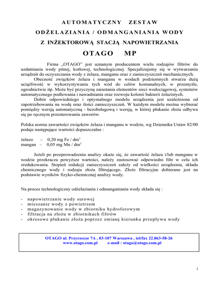 AUTOMATYCZNY ZESTAW ODŻELAZIANIA / ODMANGANIANIA WODY Z INŻEKTOROWĄ STACJĄ NAPOWIETRZANIA O TAG O MP Firma „OTAGO” jest uznanym producentem wielu rodzajów filtrów do uzdatniania wody pitnej, kotłowej, technologicznej. Specjalizujemy się w wytwarzaniu urządzeń do oczyszczania wody z żelaza, manganu oraz z zanieczyszczeń mechanicznych. Obecność związków żelaza i manganu w wodach podziemnych stwarza dużą uciążliwość w wykorzystywaniu tych wód do celów komunalnych, w przemyśle, ogrodnictwie itp. Może być przyczyną zarastania elementów sieci wodociągowej, systemów automatycznego podlewania i nawadniania oraz rozwoju kolonii bakterii żelazistych. Dobór odpowiedniego i optymalnego modelu urządzenia jest uzależniona od zapotrzebowania na wodę oraz ilości zanieczyszczeń. W każdym modelu można wybierać pomiędzy wersją automatyczną - bezobsługową i wersją, w której płukanie złoża odbywa się po ręcznym przesterowaniu zaworów. Polska norma zawartości związków żelaza i manganu w wodzie, wg Dziennika Ustaw 82/00 podaje następujące wartości dopuszczalne : żelazo – 0,20 mg Fe / dm3 mangan – 0,05 mg Mn / dm3 Jeżeli po przeprowadzeniu analizy okaże się, że zawartość żelaza i/lub manganu w wodzie przekracza powyższe wartości, należy zastosować odpowiedni filtr w celu ich zredukowania. Stopień redukcji zanieczyszczeń zależy od wielkości urządzenia, składu chemicznego wody i rodzaju złoża filtrującego. Złoże filtracyjne dobierane jest na podstawie wyników fizyko-chemicznej analizy wody. Na proces technologiczny odżelaziania i odmanganiania wody składa się : - napowietrzanie wody surowej mieszanie wody z powietrzem magazynowanie wody w zbiorniku hydroforowym filtracja na złożu w zbiornikach filtrów okresowe płukanie złoża poprzez zmianę kierunku przepływu wody OTAGO ul. Przyrzecze 7A , 03-107 Warszawa , tel/fax 22.863-58-26 www.otago.com.pl e-mail : [email protected] 1 Parametry 1 zbiornika filtru serii MP MP-2 MP-3,5 MP-5,5 MP-9 średnica wejście/wyjście 1” lub 1¼” 1” , 1¼” lub 1½” 1¼” lub 1½” 1½” lub 2” objętość zbiornika filtracyjnego 150 dm3 300 dm3 500 dm3 1000 dm3 objętość złoża filtracyjnego 110 dm3 220 dm3 340 dm3 750 dm3 masa pustego zbiornika 55 kg 80 kg 150 kg 270 kg masa zbiornika ze złożem ~ 275 kg ~ 520 kg ~ 750 kg ~ 1550 kg wymiary zbiornika h1 h2 d L ~ 155 cm ~ 165 cm ~ 45 cm ~ 60 cm ~ 160 cm ~ 170 cm ~ 55 cm ~ 90 cm ~ 190 cm ~ 205 cm ~ 70 cm ~ 110 cm ~ 195 cm ~ 210 cm ~ 90 cm ~ 125 cm ciśnienie robocze 1,8 6 atm. 1,8 6 atm. 1,8 6 atm. 1,8 6 atm. 2 m3/h 3,5 m3/h 5,5 m3/h 9 m3/h 2 m3/h . ilość zbiorników 3,5 m3/h . ilość zbiorników 5,5 m3/h . ilość zbiorników 9 m3/h . ilość zbiorników h2 filtr h1 max. przepływ przy pracy ciągłej (1 filtr) lub przy zestawie połączonym szeregowo max. przepływ przy pracy ciągłej, zestaw połączony równolegle d L 2 SYSTEM UZDATNIANIA WODY Na proces technologiczny odżelaziania i odmanganiania wody składa się : napowietrzanie wody surowej mieszanie i magazynowanie wody filtracja na złożu w zbiornikach filtrów okresowe płukanie złoża poprzez zmianę kierunku przepływu wody W skład stacji uzdatniania wody wchodzą : 1. pompa wody inżektorowa stacja napowietrzania wody wspomagana pompą zbiornik mieszacza wodno-powietrznego z odpowietrznikiem zbiornik hydroforowy z wodowskazem zestaw zbiorników ze złożem filtrującym INŻEKTOROWA STACJA NAPOWIETRZANIA WODY Jest to urządzenie służące do napowietrzania wody w procesie jej oczyszczania z żelaza i manganu. Jego działanie oparte jest na właściwościach zwężek Venturiego, które wskutek odpowiednio dobranego przewężenia wywołują podciśnienie w dyszy, czego efektem jest zasysanie powietrza przez zawór zwrotny. Konsekwencją silnego przewężenia przekroju jest spadek parametrów przepływu nawet o 30%. W celu skompensowania strat zamontowano wspomagającą pompę wodną, która załącza się jednocześnie z pompą zasadniczą. Równolegle z ciągiem: pompa – zwężka zastosowany jest układ obejściowy z zaworem, który umożliwia odłączenie i ominięcie stacji. Efektem napowietrzenia wody jest przemiana związków żelaza łatwo rozpuszczalnych w wodzie, w związki żelaza trudno rozpuszczalne, które po wytrąceniu mogą zostać zatrzymane na złożu filtracyjnym. 2. MIESZACZ WODNO – POWIETRZNY Mieszacz wodno-powietrzny służy do napowietrzania wody uzdatnianej w celu ułatwienia wytrącenia związków żelaza, a także do odgazowania – usuwania CO2, H2S oraz lotnych związków organicznych. Mieszacze stanowią ważny element instalacji uzdatniania wody. Napowietrzanie i mieszanie wody prowadzi się w celu utlenienia rozpuszczonych w niej jonów Fe (II) do Fe (III) oraz Mn (II) do Mn (IV). Wytrącone związki żelaza i manganu można następnie oddzielić od wody w procesie filtracji. Mieszacz przystosowany jest do instalowania przed baterią odżelaziaczy lub również przed baterią odmanganiaczy przy filtracji dwustponiowej. 3 3. ZBIORNIK HYDROFOROWY Do współpracy z odżelaziaczem lub odmanganiaczem należy zastosować zbiornik hydroforowy z poduszką powietrzną, sposób podłączenia hydroforu musi być zgodny z następującymi zaleceniami : 4. wodę do zbiornika należy doprowadzić przez otwór górny wskazane jest zastosowanie na wlocie do zbiornika dyszy rozpryskowej. Dodatkowo miesza ona wodę z powietrzem zawartym w zbiorniku hydroforowym w otworze dolnym zbiornika należy zamontować zawór spustowy MONTAŻ ZBIORNIKA ZE ZŁOŻEM FILTRACYJNYM Zbiorniki filtrów należy zainstalować w sieci hydraulicznej zgodnie z załączonym schematem. Po zainstalowaniu zbiorników należy : - odłączyć orurowanie - odkręcić właz górny z dyszą wlotową - wlać przez górny otwór wodę (ok. 1/3 objętości zbiornika filtru) - wsypać przez górny otwór złoże filtracyjne, rozpoczynając od największej granulacji, a k