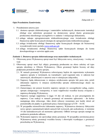 Załącznik nr 1 Opis Przedmiotu Zamówienia. 1. Przedmiotem umowy jest: 1.1. dostawa sprzętu elektronicznego i materiałów technicznych, dostarczenie instrukcji obsługi oraz udzielenie gwarancji na dostarczony sprzęt (karty gwarancyjne producenta) określonego szczegółowo w zadaniu 1 niniejszego dokumentu; 1.2. usługa zakupu oprogramowania telekonferencyjnego oraz świadczenia obsługi finansowej opłat licencyjnych dostępu do oprogramowania telekonferencyjnego; 1.3. usługa świadczenia obsługi finansowej opłat licencyjnych dostępu do biznesowej wyszukiwarki treści portalu www.web.gov.pl; 1.4. usługa świadczenia obsługi finansowej opłat licencyjnych dostępu do konta deweloperskiego w serwisie apple.com. Zadanie 1. Dostawa sprzętu elektronicznego oraz materiałów technicznych 1. Oferowany przez Wykonawcę sprzęt musi być fabrycznie nowy, nieużywany i wolny od wad. 2. Oferowany sprzęt musi być objęty gwarancją producenta na okres zależny od typu sprzętu określony w Ofercie Wykonawcy. Okres gwarancji będzie liczony od daty podpisania protokołu odbioru sprzętu. 2.1. W ramach gwarancji Wykonawca zobowiązany będzie do zapewnienia wykonania naprawy sprzętu w terminach, na warunkach i pod rygorami min. w zakresie kar umownych, określonymi w umowie oraz w niniejszym załączniku, 2.2. Naprawy będą dokonywane w miejscu użytkowania sprzętu lub poza nim, jeżeli dokonanie naprawy w miejscu użytkownika sprzętu elektronicznego okaże się niemożliwe, 2.3. Zamawiający nie ponosi kosztów naprawy sprzętu (w szczególności usług, części, sprzętu zastępczego i transportu), w razie wątpliwości wszelkie koszty związane z naprawą obciążają Wykonawcę, 2.4. Naprawa nastąpi najpóźniej w ciągu 14 dni od reakcji, to jest przystąpienia do naprawy. Czas reakcji w ramach gwarancji od momentu zgłoszenia – do końca następnego dnia roboczego. Jako dzień roboczy rozumiany jest każdy dzień od poniedziałku do piątku w godzinach pracy Zamawiającego tj 8:30 – 16:30. 2.5. W przypadku niemożliwości dokonania naprawy, Wykonawca dostarczy fabrycznie nowy sprzęt o parametrach takich samych lub wyższych, jak uszkodzony, w terminie 14 dni kalendarzowych od momentu zgłoszenia. Odbiór nowego sprzętu nastąpi na podstawie protokołu odbioru, 2.6. Wykonanie naprawy nie spowoduje utraty gwarancji. W przypadku zawinionej przez Wykonawcę utraty gwarancji wszelkie koszty i obowiązki wynikające z gwarancji przechodzą na Wykonawcę. Strona 1 z 7 3. 2.7. Rozbudowa sprzętu przez pracowników Zamawiającego nie spowoduje utraty gwarancji na pozostałe elementy. Wszystkie oferowane urządzenia elektryczne muszą być oznaczone znakiem CE. 4. Sprzęt zostanie dostarczony w dwóch etapach opisanych poniżej: 4.1. Etap I dostawy sprzętu i materiałów technicznych Zamawiający dopuszcza użycie innych elementów zamówienia jednak o parametrach identycznych lub nie gorszych niż posiadają elementy wymienione w poniższym wykazie sprzętu i materiałów technicznych. Tabela 1. Wykaz sprzętu i materiałów technicznych dostarczanego w ramach etapu I L.p Nazwa . Ilość 1 Słuchawki Sennheiser HD 380 Pro 1 Minimalny okres gwarancji (miesiące) 24 2 Kabel XLR męski – żeński długość 20m, końcówki metalowe, przewód ekranowany z miedzi beztlenowej, miękki nawijany na bęben. 2 12 3 Kabel HDMI z wtykami A - C (Standard HDMI - Mini HDMI) – długość 3 m 2 12 4 Dysk SSD - OCZ Revo3 X2 PCIE 480GB 1,5GB/s 230k IOPs 1 24 5 Panelowa lampa światła stałego - oświetlenie jarzeniowe z płynną regulacją mocy wraz z pokrowcem i statywem: 6 świetlówek 55W 5400K zasilanie 230V 2 24 6 Akumulatory AAA GP 1000 mAh 6 6 7 Akumulatory AA GP 2700mAh 30 6 8 Przejściówka display port (wtyczka) - HDMI (gniazdo) 2 12 9 Pilot do prezentacji bezprzewodowy radiowy USB ze wskaźnikiem laserowym 2 24 Strona 2 z 7 L.p Nazwa . 10 Statyw fotograficzny Velbon DF-61 Ilość 1 Minimalny okres gwarancji (miesiące) 24 4.2. Etap II dostawy sprzętu i materiałów technicznych Zamawiający dopuszcza użycie innych elementów zamówienia jednak o parametrach identycznych lub nie gorszych niż posiadają elementy wymienione w poniższym wykazie sprzętu i materiałów technicznych. Tabela 2. Wykaz sprzętu i materiałów technicznych dostarczanego w ramach etapu II L.p. Nazwa Ilość 1 PATTEX Taśma klejąca POWER TAPE 50x25mb srebrna 10 Minimalny okres gwarancji (miesiące) 6 2 Zestaw audio do kamery nadajnik ręczny + odbiornik nakamerowy Sennheiser ew135-p-g3 2 24 3 Żarówka 230V 650W GX6,35 BVM P1/13 OSRAM 6 n/d 4 System komunikacji walkie-talkie wraz ze słuchawkami Motorola TLKR T80 EXTREME (2 szt w zestawie z słuchawkomikrofonami, klipsami do paska, ładowarką, akumulatorami) z walizką 2 24 5 Słuchawko-mikrofon do Motoroli TLKR T80 w kolorze cielistym (zapewniający dyskrecję użytkowania) 1 24 6 Przejściówka mini Jack - Jack stereo 4 n/d 7 Taśma rzepowa dwustronna do spinania kabli - rolka 25m szer. 25mm czarna 1 n/d 8 Klej cyjanoakrylowy - tubka 2g. 5 n/d Strona 3 z 7 Ilość L.p. Nazwa 9 Zestaw narzędzi, 75 szt., zestaw w walizce zawierający co najmniej: 1 Minimalny okres gwarancji (miesiące) n/d 6 śrubokrętów precyzyjnych (krzyżakowe 0x50, 00X50, 000x50; płaskie 3,0 x50, 2,5 x50 , 2,0 x50); 1x obcinak boczny 110 mm 1x szczypce elektroniczne 125 mm 1x uchwyt z grzechotką do śrub i bitów 18x wkładek kluczy nasadowych 1/ 4 ", (1/4 ", 3/16 ", 5/32 ", 9/32 ", 5/16 ", 11/32 ", 3/8 ", 15/32 ", 1/2 ", 13mm, 12mm, 11 mm, 10mm, 9mm, 8mm, 7mm, 6mm, 5mm) 1x adapter do wkładek 4x taśma z bitami (co najmniej: 5x Allen – Metryczne: 2, 3 , 4, 5 , 6; 5x Allen - calowe , 3 /32 " , 1/ 8" , 5/32 " , 3/16" , 1/4 "; 4x kwadratowe S0, S1 , S2, S3; 4x do 3 skrzydłowej śruby , 1, 2 , 3, 4; 2x do krzyżakowych śrub , 8, 10; 7x do śrub z rowkiem : 1/8 ", 3 /16" , 1/4 " , 4mm , 5mm , 6mm , 7mm 2 x Pozidriv: # 1 , # 2; 4x Phillips : 0 # , 1 # , 2 # , 3 #) 2x końcówk