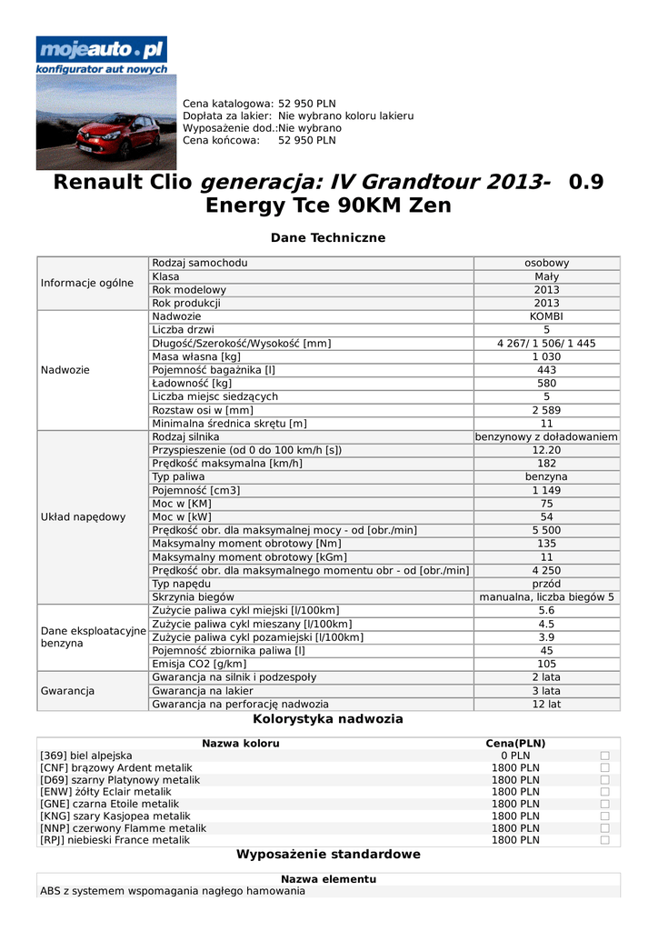 Cena katalogowa: 52 950 PLN Dopłata za lakier: Nie wybrano koloru lakieru Wyposażenie dod.:Nie wybrano Cena końcowa: 52 950 PLN Renault Clio generacja: IV Grandtour 2013- 0.9 Energy Tce 90KM Zen Dane Techniczne Rodzaj samochodu osobowy Klasa Mały Informacje ogólne Rok modelowy 2013 Rok produkcji 2013 Nadwozie KOMBI Liczba drzwi 5 Długość/Szerokość/Wysokość [mm] 4 267/ 1 506/ 1 445 Masa własna [kg] 1 030 Nadwozie Pojemność bagażnika [l] 443 Ładowność [kg] 580 Liczba miejsc siedzących 5 Rozstaw osi w [mm] 2 589 Minimalna średnica skrętu [m] 11 Rodzaj silnika benzynowy z doładowaniem Przyspieszenie (od 0 do 100 km/h [s]) 12.20 Prędkość maksymalna [km/h] 182 Typ paliwa benzyna Pojemność [cm3] 1 149 Moc w [KM] 75 Układ napędowy Moc w [kW] 54 Prędkość obr. dla maksymalnej mocy - od [obr./min] 5 500 Maksymalny moment obrotowy [Nm] 135 Maksymalny moment obrotowy [kGm] 11 Prędkość obr. dla maksymalnego momentu obr - od [obr./min] 4 250 Typ napędu przód Skrzynia biegów manualna, liczba biegów 5 Zużycie paliwa cykl miejski [l/100km] 5.6 Zużycie paliwa cykl mieszany [l/100km] 4.5 Dane eksploatacyjne Zużycie paliwa cykl pozamiejski [l/100km] 3.9 benzyna Pojemność zbiornika paliwa [l] 45 Emisja CO2 [g/km] 105 Gwarancja na silnik i podzespoły 2 lata Gwarancja Gwarancja na lakier 3 lata Gwarancja na perforację nadwozia 12 lat Kolorystyka nadwozia Nazwa koloru [369] biel alpejska [CNF] brązowy Ardent metalik [D69] szarny Platynowy metalik [ENW] żółty Eclair metalik [GNE] czarna Etoile metalik [KNG] szary Kasjopea metalik [NNP] czerwony Flamme metalik [RPJ] niebieski France metalik Wyposażenie standardowe Nazwa elementu ABS z systemem wspomagania nagłego hamowania Cena(PLN) 0 PLN 1800 PLN 1800 PLN 1800 PLN 1800 PLN 1800 PLN 1800 PLN 1800 PLN automatyczne włączanie tylnej wycieraczki podczas cofania autostradowy tryb pracy kierunkowskazów boczne listwy ochronne i listwa zderzaka tylnego w kolorze czarnym o ziarnistej fakturze boczne poduszki powietrzne chromowane relingi dachowe chromowane wstawki: w górnej, ozdobnej listwie chłodnicy, w bocznych listwach ochronnych drzwi oraz w listwie tylnego zderzaka dezaktywacja poduszki powietrznej pasażera z przodu elektryczne, zmienne wspomaganie układu kierowniczego fotel kierowcy z regulacją wysokości górna listwa ozdobna chłodnicy w kolorze lśniącej czerni z chromowanym logo Renault instalacja do montażu radioodtwarzacza karta Renault sterująca centralnym zamkiem i służąca do uruchomienia auta (zamiast kluczyka) kierownica z regulacją wysokości i głębokości komputer pokładowy lusterka boczne składane elektrycznie, podgrzewane, z czujnikiem temperatury zewnętrznej Media NAV: multimedialny system z ekranem dotykowym 7", nawigacją, radioodtwarzaczem 4x20W, Bluetooth, gniazdem USB i jack obramowania nawiewów w kolorze lśniącej czerni obudowa lusterek bocznych w kolorze nadwozia osłona przeciwsłoneczna po stronie pasażera bez lusterka osłona przeciwsłoneczna z zamykanym lusterkiem po stronie kierowcy przednie pasy bezpieczeństwa z regulacją wysokości, ogranicznikiem napięcia i napinaczem przednie poduszki powietrzne kierowcy i pasażera przednie zewnętrzne klamki drzwi w kolorze nadwozia regulator - ogranicznik prędkości stalowe obręcze kół 15", wzór Caraibes sygnał niezapiętych pasów bezpieczeństwa (na wszystkich miejscach) system dynamicznej kontroli toru jazdy (ESC) z funkcją zapobiegania poślizgowi kół pędnych przy ruszaniu (ASR) system mocowania fotelików dla dzieci Isofix na bocznych miejscach z tyłu i miejsca pasażera z przodu (tyłem do kierunku jazdy) system Renault Bass Reflex system wspomagania ruszania pod górę (Hill Start Assist) szyby przednie regulowane elektrycznie światła do jazdy dziennej z diodami LED tapicerka czarno-szara Fortunate tonacja grafitowa wnętrza tylna kanapa dzielona w układzie 1/3-2/3 (oparcie) z 3 zagłówkami z regulacją wysokości tylne pasy bezpieczeństwa: 3-punktowe, z ogranicznikami napięcia na bocznych miejscach tylne zewnętrzne klamki drzwi ukryte przy tylnym słupku tylny spojler dachowy uchwyt po stronie pasażera z przodu i na dwóch bocznych miejscach z tyłu wewnętrzne klamki drzwi chromowane wskaźnik zmiany biegów wycieraczki przednie o zmiennej częstotliwości pracy zagłówki przednie z regulacją wysokości zderzak przedni i tylny w kolorze nadwozia zespół wskaźników analogowo-cyfrowych zestaw do naprawy opon Wyposażenie dodatkowe Lista wyposażenia dodatkowego [PERP01] ozdobne elementy wnętrza w kolorze lśniącej czerni [PERP02] ozdobne elementy wnętrza w kolorze kości słoniowej [PERP03] ozdobne elementy wnętrza w kolorze czerwonym [PERP06] ozdobne elementy wnętrza w kolorze niebieskim [PERP07] ozdobne elementy wnętrza z motywem elegant [PERP09] ozdobne elementy wnętrza z motywem sport [PERP10] ozdobne elementy wnętrza z motywem trendy [PERS01] Pakiet look w kolorze lśniącej czerni z chromowanymi elementami; tylko z [REPNTC] [PERS02] Pakiet look w kolorze lśniącej czerni z elementami czerwonymi; tylko z [REPNTC]; niedostępne z [RPJ], [CNF], [ENW] [PERS03] Pakiet look w kolorze lśniącej czerni z elementami czarnymi; tylko z [REPNTC] [PERS04] Pakiet look w kolorze lśniącej czerni z elementami w kolorze kości słoniowej; tylko z [REPNTC]; niedostępny z [369], [KNG], [D69], [ENW] [PERS06] Pakiet look w kolorze lśniącej czerni z elementami niebieskimi; tylko z [REPNTC]; niedostępny z [NNP], [CNF], [ENW] [PK98B8] System Fleet Asset Management z funkcją EKO [PK98J8] Pakiet alize (klimatyzacja manualna, światła przeciwmgłowe) [PK98J9] Pakiet alize plus (klimatyzacja manualna, światła przeciwmgłowe, system wspomagania parkowania tyłem) 600 600 600 600 600 600 600 800 Cena PLN PLN PLN PLN PLN PLN PLN PLN 800 PLN 800 PLN 800 PLN 800 PLN 850 PLN 2200 PLN 2800 PLN [PKPC24] Pakiet look trendy red (ozdobne elementy wnętrza w kolorze czerwonym, pakiet look w kolorze lśni