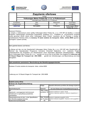 Zapytanie ofertowe Anfrage Volkswagen Motor Polska Sp. z o.o. w Polkowicach Volkswagen Motor Polska Sp. z o.o. in Polkowice Nr zapytania Data Miejscowość Zamawiający Anfragenummer Datum Ort Auftraggeber 62047449 18.12.2013 Polkowice Volkswagen Motor Polska Sp. z o.o. Szanowni Państwo, w związku z realizowanym przez spółkę Volkswagen Motor Polska Sp. z o.o. (VW MP lub Spółka), w ramach Programu Operacyjnego Innowacyjna Gospodarka, Działanie 4.5.1., Projektem pt. „Uruchomienie produkcji nowej generacji silnika diesla przez Volkswagen Motor Polska” zwracamy się do Państwa z prośbą o przedstawienie Państwa oferty na dostawę 10 sztuk wózków do transportu bloku silnika MDB zgodnie z wymogami i opisem poniżej. Sehr geehrte Damen und Herren, im Bezug auf das von der Gesellschaft Volkswagen Motor Polska Sp. z o.o. (VW MP oder Gesellschaft) im Rahmen des Operationellen Programms Innovative Wirtschaft Maβnahme 4.5.1 realisierte Projekt. „Inbetriebnahme der Produktion von Dieselmotoren neuer Generation (Modularer Dieselbaukasten – MDB) durch Volkswagen Motor Polska Sp. z o.o .” wenden wir uns an Sie mit der Bitte, Ihre Angebot für Lieferung von 10 Stueck Wagen für Transport der ZKG MDB , gemäß der Anforderungen und Beschreibung wie unten abzugeben. Opis przedmiotu zamówienia / Beschreibung des Bestellungsgegenstandes Dostawa 10 sztuk wózków do transportu bloku silnika MDB Lieferung von 10 Stueck Wagen für Transport der ZKG MDB Kryteria oceny oferty Kriterien der Angebotsbeurteilung Opis (K) Beschreibung (K) K1 Zgodność z wymaganiami technicznymi określonymi w specyfikacji przedmiotu zamówienia Ȕbereinstimmung mit der, in der Spezifikation des Bestellungsgegenstandes bestimmteTechnikqualität Waga Sposób obliczenia punktów dla danego kryterium Gewicht Art Und Weise der Punktzahlberechnung für jedes Kriterium Max. liczba Kryterium spełnione w całości: 40 pkt. punktów: 40 Kryterium częściowo spełnione / kryterium niespełnione: 0 pkt. Max. Anzahl Kryterium vollständig ausgefüllt: 40 Pkt. der Punkten: Kryterium teilweise ausgefüllt: / Kryterium nicht ausgefüllt: 0 Pkt. 40 K2 Termin dostawy wskazany przez VWMP Max. liczba Zgodność z terminem dostawy wymaganym przez punktów: 30 Zamawiającego: 30 pkt. Częściowa lub całlkowita niezgodność z terminem dostawy wymaganym przez Zamawiającego: 0 pkt. Liefertermin, der vom Auftraggeber erfordert wird Max. Anzahl Übereinstimmung mit dem vom Auftraggeber erfordern der Punkten: Liefertermin: 30 Pkt. Teilweise Übereinstimmung und Unstimmigkeit mit dem vom 30 Auftraggeber erfordern Liefertermin: 0 Pkt. cena najniższa ---------------------------------------- x 30 = liczba punktów cena zadeklarowana przez Oferenta K3 Cena Max. liczba punktów: 30 Preis Max. Anzahl niedrigste Preis der Punkten: --------------------------------------------- x 30= Punktzahl 30 von dem Anbieter vorgeschalagener Preis Miejsce realizacji zamówienia / Ort der Bestellungsrealisierung Siedziba Volkswagen Motor Polska Sp z o. o.: ul. Strefowa 1, 59-101 Polkowice Termin zakończenia prac / Bertiebliche Übergabe TK 05 /2014 / KW 05/2014 Najważniejsze informacje dotyczące sposobu, terminu oraz miejsca składania ofert Die wichtigste Anmerkungen bezüglich der Art und Weise, Frist, sowie des Orts der Angebotsabgabe − Oferta powinna zostać złożona w formie pisemnej i zaadresowana na Volkswagen Motor Polska Sp. z o.o. z siedzibą w Polkowicach, ul. Strefowa 1, 59-101 Polkowice; _ Oferta powinna zostać złożona w terminie do dnia 07.01.2014 r.; − Każda oferta powinna wskazywać termin ważności. − Das Angebot soll im Schriftform eingerichtet werden und an Volkswagen Motor Polska Sp. z o.o. mit Sitz in Polkowice, ul. Strefowa 1, 59-101 Polkowice adressiert werden; _ Das Angebot soll bis zum 07.01.2014 r. abgegeben werden; − Jedes Angebot sollte auf ihre Geltungsdauer hinweisen. Inne istotne postanowienia / uwagi Andere relevante Bestimmungen / Anmerkungen − Zamawiający zastrzega sobie możliwość negocjowania Ofert. O terminie ew. negocjacji Oferenci zostaną poinformowani w odpowiednim czasie; − Der Auftraggeber behält sich das Recht vor, die Angeboten verhandeln zu können. Vom Termin der ev. Verhandlung werden die Anbieter in der ensprechenden Frist benachrichtigt; Osoba do kontaktu ze strony Zamawiającego Anprechpartner seitens des Auftraggebers Małgorzata Kruk, Specjalista ds. Handlu Zagranicznego i Zakupów Dawid Odrobina, Planowanie E-mail Telefon Adres [email protected] + 48 76 848 3264 Volkswagen Motor Polska Sp zoo ul. Strefowa 1, 59-101 Polkowice [email protected] + 48 76 8483945 Volkswagen Motor Polska Sp zoo ul. Strefowa 1, 59-101 Polkowice 1. Obowiązuje „Instrukcja organizacyjna nr 17 „Procedura zamówień w ramach projektu Uruchomienie produkcji nowej generacji silnika diesla (MDB – Modularer Dieselbaukasten) przez Volkswagen Motor Polska” („Instrukcja organizacyjna nr 17”), która stanowi integralną część niniejszego zapytania ofertowego. 2. Obowiązują Ogólne Warunki Zakupów VWMP. 3. Obowiązuje szczegółowa specyfikacja przedmiotu zamówienia (Lastenheft). Zusätzliche Bestimmungen: 1. Es gilt die Organisationsanweisung Nr 17 „Das Bestellungsverfahren im Rahmen des Projekts Inbetriebnahme der Produktion von Dieselmotoren neuer Generation (Modularer Dieselbaukasten – MDB) durch Volkswagen Motor Polska Sp. z o.o .“ („Organisationsanweisung Nr 17 ), die der integrale Teil dieser Angebotsanfrage ist. 2. Es gelten die allgemeine Verkaufsbedingungen von VWMP. 3. Es gilt die detaillierte Spezifikation des Gegenstandes der Bestellung (Lastenheft).