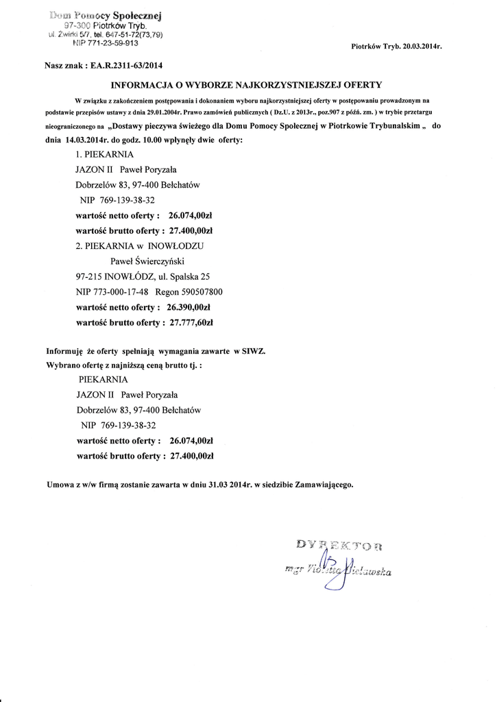 .il.i rlt F*xxt*ey §połeczmej 37-30C Piotrkór Tryb ,*.i Żwir*i §/7. tel. 647-51_72(73,79) L"łF] 771-23_5s§,l3 Piotrków Tryb. 20.03.2014r. Nasz znak : EA.R2311-63|ż014 INT,ORMACJA O WYBORZE NAJKORZY§TIYIEJSZEJ OF,ERTY W ałiązku z zakończeniem postępowania i dokonaniem wyboru najkorzystniejszcj oferĘ w postępowaniu prowadzonym na podstawie przepisów ustawy z dnia 29.01.2004r. Prawo zamówień publicznych (Dz.U. z20l3r., poz.901 z późń. zm.\ w trybie przetaĘu nieograniczonego na ,rDo§tawy pieczywa świeżegodla Domu Pomocy Społecznej w Piotrkowie Trybunalskim dnia 14.03.2014r. do godz. 1. 10.00 wpłynęłydwie ofeńy: PIEKARNIA JAZON II Paweł Dobrzelów 83, NIP Poryzńa Bełchatów 97 -400 769_139-38-32 wańośó netto oferty z 26.074,00zł wańośćbrutto oferty : 27.400rD0zl 2. PIEKARNIA W INOWŁODZU Paweł Świerczyński }7-}IiINOWŁODZ, ul. Spalska 25 NIP 773-000-17-48 Regon 590507800 wańośćnetto oferty z 26.390,00zł wańośćbrutto oferĘ z 27.777160zł Informuję że oferĘ spelniają wymagania zawarte w SIWZ. Wybrano ofeńę z najnższą ceną brutto tj. : PIEKARNIA JAZON II Paweł Dobrzelów 83, NIP Poryzńa 97 -400 769-139-38-32 wartośćnetto oferĘ Bełchatów z 26.074,00zł wańośćbrutto oferty z 27.400,00zł Umowa z w/w firmą zostanie zawarta w dniu 31.03 2014r. w siedzibie Zamawiającego. ,, do
