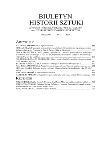 BIULETYN HISTORII SZTUKI Kwartalnik wydawany przez INSTYTUT SZTUKI PAN oraz STOWARZYSZENIE HISTORYKÓW SZTUKI ROK LXXVI 2014 NR 4 ARTYKU£Y JOANNA M. SOSNOWSKA, Wprowadzenie............................................................................. 581 MARIA GO£¥B, Transgresje wczesnej twórczoci Józefa Che³moñskiego. O przedstawieniach kobiet w obrazach z Pracowni w Hotelu Europejskim w Warszawie......................................... 583 ELIZA PTASZYÑSKA, Wilki, panny i grajkowie Analiza porównawcza polskiego malarstwa monachijskiego w XIX w. na przyk³adzie twórczoci Józefa Che³moñskiego i Alfreda Wierusz-Kowalskiego....................................................................................................... 597 AGNIESZKA ROSALES RODRIGUEZ, Malarz ziemi. Józef Che³moñski w krêgu europejskich tendencji pejza¿u.............................................................................................................. 615 TADEUSZ MATUSZCZAK, Che³moñski w ksiêgach handlowych Goupil & Cie.................... 637 JOANNA M. SOSNOWSKA, Józefa Che³moñskiego Droga ku abstrakcji........................... 655 MICHA£ HAAKE, Cz³owiek wród zwierz¹t. Obrazy Józefa Che³moñskiego z lat 90. XIX wieku........................................................................................................................................... 667 WALDEMAR OKOÑ, Che³moñski i socrealizm....................................................................... 691 KAZIMIERZ MARDOÑ, Niepublikowane archiwalia dotycz¹ce Józefa Che³moñskiego... 703 RECENZJE JERZY MIZIO£EK, Ikar i Anio³y. Wystawa dzie³ Igora Mitoraja na Campo Santo w Pizie...... 711 JERZY ¯ELAZOWSKI: Delphine Burlot, Fabriquer l’antique. Les contrefaçons de peinture murale antique au XVIIIe siècle, Naples 2012........................................................................... 721 ANNA WIERZBICKA, Mistrzowie École de Paris ....................................................................... 729 BULLETIN OF ART HISTORY A quarterly published by the INSTITUTE OF ART HISTORY OF THE POLISH ACADEMY OF SCIENCES (IS-PAN) in conjunction with the ART HISTORIANS SOCIETY YEAR LXXVI ARTICLES 2014 No. 4 JOANNA M. SOSNOWSKA, Preface..................................................................................... MARIA GO£¥B, Transgressions of Józef Che³moñskis Early Oeuvre. On Representations of Women in the Paintings from the Europejski Hotels Studio in Warsaw............................... ELIZA PTASZYÑSKA, Wolves, Ladies, and Folk Musicians Comparative Analysis of Polish Munich Painting in the 19th Century on the Example of Józef Che³moñskis and Alfred Wierusz-Kowalskis Oeuvre........................................................................................................... AGNIESZKA ROSALES RODRIGUEZ, Painter of the Land. Józef Che³moñski within European Tendencies in Landscape Painting............................................................................. TADEUSZ MATUSZCZAK, Che³moñski in Goupil & Cie Stock Books.................................. JOANNA M. SOSNOWSKA, Józef Che³moñskis Way Towards Abstraction.......................... MICHA£ HAAKE, Man Amidst Animals. Józef Che³moñskis Paintings from the 1890s........... WALDEMAR OKOÑ, Che³moñski and Socialist Realism......................................................... KAZIMIERZ MARDOÑ, Unpublished archival materials on Józef Che³moñski.................... 581 583 597 615 637 655 667 691 703 REVIEWS JERZY MIZIO£EK, Icarus and Angels. Exhibition of Igor Mitorajs Works on Campo Santo in Pisa......................................................................................................................................... 711 JERZY ¯ELAZOWSKI: Delphine Burlot, Fabriquer l’antique. Les contrefaçons de peinture murale antique au XVIIIe siècle, Naples 2012........................................................................... 721 ANNA WIERZBICKA, Masters of École de Paris ................................................................. 729