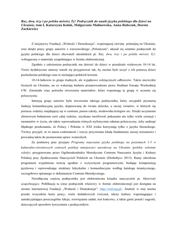 Raz, dwa, trzy i po polsku mówisz Ty! Podręcznik do nauki języka polskiego dla dzieci na Ukrainie, tom I, Katarzyna Kołak, Małgorzata Malinowska, Anna Rabczuk, Dorota Zackiewicz Z inicjatywy Fundacji „Wolność i Demokracja”, wspierającej oświatę polonijną na Ukrainie, oraz dzięki pracy grupy autorów z warszawskiego „Polonicum”, ukazał się ostatnio podręcznik do języka polskiego dla dzieci obywateli ukraińskich pt. Raz, dwa, trzy i po polsku mówisz Ty!, wzbogacony o materiały uzupełniające w formie elektronicznej. Zgodnie z założeniem podręcznik ma dotrzeć do dzieci w przedziale wiekowym 10-14 lat. Treści dydaktyczne autorzy starali się przygotować tak, by można było uczyć z ich pomocą dzieci pochodzenia polskiego oraz te niemające polskich korzeni. 10-14-latkowie to grupa trudnych, ale wyjątkowo wdzięcznych odbiorców. Także niezwykle licznych na Ukrainie, na co wskazują badania przeprowadzone przez Studium Europy Wschodniej UW. Zaistniała więc potrzeba stworzenia materiałów, które wspomogą tę grupę w uczeniu się polszczyzny. Intencją grupy autorów było stworzenie takiego podręcznika, który uwypukli prymarną funkcję komunikacyjną języka, dopasowaną do świata dziecka, a raczej światów, w których się porusza: rodziny znajdującej się w centrum, potem szkoły, środowiska kolegów etc. Dzięki uczynieniu zbiorowym bohaterem serii całej rodziny, uzyskano możliwość pokazania nie tylko wielu sytuacji i momentów w życiu, ale także wprowadzania różnych stylistycznie odmian polszczyzny, żeby uniknąć błędnego przekonania, że Polacy i Polonia w XXI wieku korzystają tylko z języka literackiego. Twórcy przyjęli, że to nasza codzienność i rzeczy przyziemne kładą fundamenty naszej tożsamości i prowadzą także do poznawania spraw wzniosłych. Za podstawę prac przyjęto Programy nauczania języka polskiego na poziomach 1-5 w kulturalno-oświatowych centrach polskiej mniejszości narodowej na Ukrainie (polskie sobotnie szkoły), przygotowane przez Ogólnoukraińskie Metodyczne Centrum Nauczania Języka i Kultury Polskiej przy Zjednoczeniu Nauczycieli Polskich na Ukrainie (Drohobycz 2013). Ramy określone programem wypełniono treścią zgodnie z wytycznymi programowymi, budując kompetencję językową i wprowadzając struktury leksykalne i komunikacyjne według katalogu tematycznego, szczegółowo opisanego w dokumencie Centrum Metodycznego. Nieodłączną częścią podręcznika jest elektroniczna książka nauczyciela pt. Materiały uzupełniające. Publikacja ta (oraz podręcznik właściwy w formie elektronicznej) jest dostępna na stronie internetowej Fundacji „Wolność i Demokracja”: http://wid.org.pl/. Znaleźć w niej można przede wszystkim karty pracy, wiele dodatkowych ćwiczeń, teksty kultury wspomagające i uatrakcyjniające poszczególne lekcje, rozwiązania zadań, test końcowy, a także garść porad i sugestii, dotyczących sposobów korzystania z podręczników.