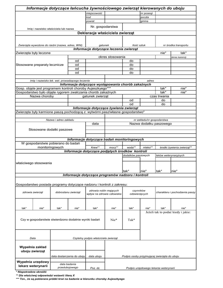Informacje dotyczące łańcucha żywnościowego zwierząt kierowanych do uboju miejscowość nr posesji kod poczta powiat gmina Nr. gospodarstwa Imię i nazwisko właściciela lub nazwa Deklaracje właściciela zwierząt Zwierzęta wywożone do rzeźni (nazwa, adres, WNI) gatunek Ilość sztuk nr środka transportu Informacje dotyczące leczenia zwierząt Zwierzęta były leczone nie* okres stosowania od od od od Stosowane preparaty lecznicze tak* okres karencji do do do do imię i nazwisko lek. wet. prowadzącego leczenie adres Informacje dotyczące występowania chorób zakaźnych Gosp. objęte jest programem kontroli choroby Aujeszkyego*** tak* Gospodarstwo było objęte rygorem zwalczania chorób zakaźnych tak* Nazwa choroby gatunek zwierząt czas trwania od do od do Informacje dotyczące żywienia zwierząt Zwierzęta były karmione paszą pochodzącą z: wytwórni pasz/własne gospodarstwo* Nazwa i adres zakładu nie* nie* nr zakładu/nr gospodarstwa data Nazwa dodatku paszowego Stosowane dodatki paszowe Informacje dotyczące badań monitoringowych W gospodarstwie pobierano do badań Krew** mocz** woda** mleko** monitoringowych Informacje dotyczące podjętych środków kontroli dodatków paszowych środki żywienia zwierząt** leków weterynaryjnych właściwego stosowania tak* nie* Informacje dotyczące programów nadzoru i kontroli tak* nie* Gospodarstwo posiada programy dotyczące nadzoru i kontroli z zakresu: zdrowia zwierząt tak* nie* dobrostanu zwierząt tak* nie* zdrowia roślin mających wpływ na zdrowie człowieka tak* nie* czynników odzwierzęcych tak* nie* charakteru i pochodzenia paszy tak* nie* Jeżeli tak to podać kiedy i jakie: Czy w gospodarstwie stwierdzono dodatnie wyniki badań Data Nie* Tak* Czytelny podpis właściciela zwierząt Wypełnia zakład uboju zwierząt data dostarczenia do uboju Wypełnia urzędowy lekarz weterynarii data badania przedubojowego data uboju Podpis osoby przyjmującej zwierzęta do uboju Poz. dz. Podpis urzędowego lekarza weterynarii * Niepotrzebne skreślić ** Dla właściwej odpowiedzi wstawić literę X *** Tzn., że są pobierane próbki krwi na badanie w kierunku choroby Aujeszkyego