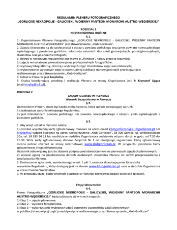 REGULAMIN PLENERU FOTOGRAFICZNEGO „GORLICKIE NEKROPOLIE - GALICYJSKI, WOJENNY PANTEON MONARCHII AUSTRO-WĘGIERSKIEJ” ROZDZIAŁ 1 POSTANOWIENIA OGÓLNE § 1. 1. Organizatorem Pleneru Fotograficznego „GORLICKIE NEKROPOLIE - GALICYJSKI, WOJENNY PANTEON MONARCHII AUSTRO-WĘGIERSKIEJ” jest Stowarzyszenie „Klub Gorliczan”. 2. Zajęcia skierowane są do społeczności z obszaru powiatu gorlickiego oraz gmin powiatu nowosądeckiego sąsiadującego z powiatem gorlickim: młodzieży ostatnich klas szkół gimnazjalnych, ponadgimnazjalnych, studentów oraz pasjonatów fotografii. 3. Ilekroć w niniejszym Regulaminie jest mowa o „Plenerze”, należy przez to rozumieć: 1) zajęcia warsztatowe, prowadzone przez profesjonalnych fotografików; 2) wystawę fotograficzną, złożoną z wybranych zdjęć Uczestników zajęć warsztatowych; 3) wykorzystanie wybranych zdjęć w ewentualnej publikacji stanowiącej część przedsięwzięcia realizowanego przez Stowarzyszenie „Klub Gorliczan”. 4. Udział w Plenerze jest bezpłatny. 5. Osobą koordynującą przebieg i realizację Pleneru ze strony Organizatora jest P. Krzysztof Ligęza (mail:[email protected]). ROZDZIAŁ 2 ZASADY UDZIAŁU W PLENERZE Warunki Uczestnictwa w Plenerze § 2. Uczestnikiem Pleneru może być każda osoba fizyczna, która spełnia następujące warunki: 1) zaakceptuje warunki niniejszego Regulaminu, 2) jest mieszkańcem powiatu gorlickiego lub powiatu nowosądeckiego z obszaru gmin sąsiadujących z powiatem gorlickim. § 3. 1. Aby wziąć udział w Plenerze należy: 1) przesłać wypełnioną kartę zgłoszeniową: mailowo na adres email [email protected] lub krzylig@o2 tudzież listownie na adres: Stowarzyszenie „Klub Gorliczan”, 38-300 Gorlice, ul. Wróblewskiego 10a, tel. 18 353 56 18 lub osobiście w siedzibie Organizatora codziennie od pon. do pt. w godz. od 7.30 do 15.30. Wzór karty zgłoszeniowej stanowi Załącznik Nr 1 do niniejszego regulaminu. Kartę zgłoszeniową można pobrać również ze strony internetowej www.klubgorliczan.pl. W przypadku przesłania karty zgłoszeniowej drogą elektroniczną Uczestnik zobowiązany jest do złożenia podpisu pod oświadczeniem na pierwszych zajęciach plenerowych; 2) wyrazić zgodę na przetwarzanie danych osobowych Uczestnika Pleneru do celów przeprowadzenia i zrealizowania Pleneru. 2. Dostarczenie zgłoszenia, wymienionego w ust. 1 pkt 1, oznacza akceptację przez Uczestnika warunków Regulaminu, który dostępny jest na stronie www.klubgorliczan.pl oraz w siedzibie Organizatora w czasie trwania Warsztatów. 3. W przypadku dużej liczby chętnych o udziale w Plenerze decydować będzie kolejność zgłoszeń. Etapy Warsztatów § 4. Plener Fotograficzny „GORLICKIE NEKROPOLIE - GALICYJSKI, WOJENNY PANTEON MONARCHII AUSTRO-WĘGIERSKIEJ” będą odbywały się w trzech etapach: 1) Etap 1 – zajęcia plenerowe, 2) Etap 2 – wystawa fotograficzna, 3) Etap 3 – wykorzystanie wybranych zdjęć autorstwa Uczestników zajęć plenerowych w publikacji stanowiącej część przedsięwzięcia realizowanego przez Stowarzyszenie „Klub Gorliczan”. § 5. 1. Zajęcia plenerowe prowadzone będą przez artystę fotografa, członka ZPAF – Bogdana Konopkę oraz Krzysztofa Ligęzę w dniach 9-11 września 2013. 2. Łączna liczba zajęć związanych z Plenerem oraz poplenerową wystawą wynosi 28 godzin. 3. Pierwsze zajęcia odbędą się 9 września 2013 r. w sali Muzeum Dwory Karwacjanów i Gładyszów w Gorlicach o godz. 17.00. Uczestnicy zostaną poinformowani o szczegółach spotkania. 4. Na zajęcia plenerowe Uczestnicy są zobowiązani przynieść własny sprzęt fotograficzny. Organizator nie zapewnia Uczestnikom aparatów lub urządzeń obrazujących innego rodzaju. 5. W ramach przeglądu portfolio Uczestnicy dostarczą (na koszt własny) prace swojego autorstwa w formie elektronicznej (pliki jpg) oraz w formie odbitek w formacie co najmniej 10x15cm. Na pierwsze zajęcia można przynieść do 15 fotografii swojego autorstwa. 6. Prace przynoszone na zajęcia plenerowe służyć będą jedynie do celów szkoleniowych i zostaną zwrócone Uczestnikom. § 6. 1. Zbiór wybranych prac Uczestników zajęć plenerowych złoży się na wystawę. 2. Wyboru prac na wystawę dokonają Prowadzący zajęcia plenerowe. Fotografie na wystawę wydrukowane zostaną na koszt Organizatora. 3. Termin wystawy zostanie ogłoszony przez Organizatora. § 7. 1. Udział w Plenerze jest jednoznaczny z wyrażeniem zgody na zaprezentowanie prac na Wystawie poplenerowej, a także na wykorzystanie fotografii oraz zamieszczenie imienia i nazwiska autora w publikacji stanowiącej część przedsięwzięcia realizowanego przez Stowarzyszenie „Klub Gorliczan”. 2. Uczestnicy Pleneru z chwilą przekazania fotografii na wystawę udzielą Organizatorowi niewyłącznej, nieodpłatnej licencji na ekspozycję fotografii z ujawnieniem ich autorstwa na wystawach powarsztatowych oraz na opublikowanie fotografii w ew. wydawnictwie lub publikacji elektronicznej. 3. Przekazane na Wystawę fotografie nie mogą naruszać praw osób trzecich. Organizator nie ponosi odpowiedzialności za ewentualne naruszenia praw osób trzecich. ROZDZIAŁ 3 Postanowienia końcowe § 8. 1. Niniejszy Regulamin jest jedynym dokumentem określającym przebieg, realizację oraz warunki uczestnictwa w Plenerze. 2. Wszelkie decyzje Organizatora są wiążące i ostateczne. 3. Organizator zastrzega sobie prawo do zmiany niniejszego Regulaminu w każdym czasie bez podania przyczyny, poprzez zamieszczenie odpowiedniej informacji na stronie internetowej www.klubgorliczan.pl Zmieniony Regulamin wchodzi w życie z chwilą jego opublikowania na stronie internetowej www.klubgorliczan.pl. Zmiany Regulaminu nie mogą rodzić skutków ani roszczeń finansowych dla Uczestników Pleneru. 4. Organizator nie ponosi odpowiedzialności za podanie przez Uczestnika nieprawdziwych lub niewłaściwych danych osobowych. 5. W przypadku zmiany danych,