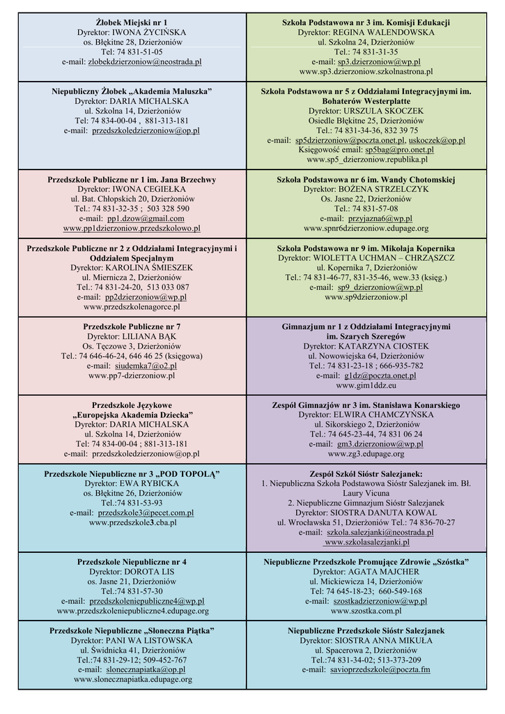 Żłobek Miejski nr 1 Dyrektor: IWONA ŻYCIŃSKA os. Błękitne 28, Dzierżoniów Tel: 74 831-51-05 e-mail: [email protected] Szkoła Podstawowa nr 3 im. Komisji Edukacji Dyrektor: REGINA WALENDOWSKA ul. Szkolna 24, Dzierżoniów Tel.: 74 831-31-35 e-mail: [email protected] www.sp3.dzierzoniow.szkolnastrona.pl Niepubliczny Żłobek „Akademia Maluszka” Dyrektor: DARIA MICHALSKA ul. Szkolna 14, Dzierżoniów Tel: 74 834-00-04 , 881-313-181 e-mail: [email protected] Szkoła Podstawowa nr 5 z Oddziałami Integracyjnymi im. Bohaterów Westerplatte Dyrektor: URSZULA SKOCZEK Osiedle Błękitne 25, Dzierżoniów Tel.: 74 831-34-36, 832 39 75 e-mail: [email protected], [email protected] Księgowość email: [email protected] www.sp5_dzierzoniow.republika.pl Przedszkole Publiczne nr 1 im. Jana Brzechwy Dyrektor: IWONA CEGIEŁKA ul. Bat. Chłopskich 20, Dzierżoniów Tel.: 74 831-32-35 ; 503 328 590 e-mail: [email protected] www.pp1dzierzoniow.przedszkolowo.pl Szkoła Podstawowa nr 6 im. Wandy Chotomskiej Dyrektor: BOŻENA STRZELCZYK Os. Jasne 22, Dzierżoniów Tel.: 74 831-57-08 e-mail: [email protected] www.spnr6dzierzoniow.edupage.org Przedszkole Publiczne nr 2 z Oddziałami Integracyjnymi i Oddziałem Specjalnym Dyrektor: KAROLINA ŚMIESZEK ul. Miernicza 2, Dzierżoniów Tel.: 74 831-24-20, 513 033 087 e-mail: [email protected] www.przedszkolenagorce.pl Szkoła Podstawowa nr 9 im. Mikołaja Kopernika Dyrektor: WIOLETTA UCHMAN – CHRZĄSZCZ ul. Kopernika 7, Dzierżoniów Tel.: 74 831-46-77, 831-35-46, wew.33 (księg.) e-mail: [email protected] www.sp9dzierzoniow.pl Przedszkole Publiczne nr 7 Dyrektor: LILIANA BĄK Os. Tęczowe 3, Dzierżoniów Tel.: 74 646-46-24, 646 46 25 (księgowa) e-mail: [email protected] www.pp7-dzierzoniow.pl Gimnazjum nr 1 z Oddziałami Integracyjnymi im. Szarych Szeregów Dyrektor: KATARZYNA CIOSTEK ul. Nowowiejska 64, Dzierżoniów Tel.: 74 831-23-18 ; 666-935-782 e-mail: [email protected] www.gim1ddz.eu Przedszkole Językowe „Europejska Akademia Dziecka” Dyrektor: DARIA MICHALSKA ul. Szkolna 14, Dzierżoniów Tel: 74 834-00-04 ; 881-313-181 e-mail: [email protected] Zespół Gimnazjów nr 3 im. Stanisława Konarskiego Dyrektor: ELWIRA CHAMCZYŃSKA ul. Sikorskiego 2, Dzierżoniów Tel.: 74 645-23-44, 74 831 06 24 e-mail: [email protected] www.zg3.edupage.org Przedszkole Niepubliczne nr 3 „POD TOPOLĄ” Dyrektor: EWA RYBICKA os. Błękitne 26, Dzierżoniów Tel.:74 831-53-93 e-mail: [email protected] www.przedszkole3.cba.pl Zespół Szkół Sióstr Salezjanek: 1. Niepubliczna Szkoła Podstawowa Sióstr Salezjanek im. Bł. Laury Vicuna 2. Niepubliczne Gimnazjum Sióstr Salezjanek Dyrektor: SIOSTRA DANUTA KOWAL ul. Wrocławska 51, Dzierżoniów Tel.: 74 836-70-27 e-mail: [email protected] www.szkolasalezjanki.pl Przedszkole Niepubliczne nr 4 Dyrektor: DOROTA LIS os. Jasne 21, Dzierżoniów Tel.:74 831-57-30 e-mail: [email protected] www.przedszkoleniepubliczne4.edupage.org Niepubliczne Przedszkole Promujące Zdrowie „Szóstka” Dyrektor: AGATA MAJCHER ul. Mickiewicza 14, Dzierżoniów Tel: 74 645-18-23; 660-549-168 e-mail: [email protected] www.szostka.com.pl Przedszkole Niepubliczne „Słoneczna Piątka” Dyrektor: PANI WA LISTOWSKA ul. Świdnicka 41, Dzierżoniów Tel.:74 831-29-12; 509-452-767 e-mail: [email protected] www.slonecznapiatka.edupage.org Niepubliczne Przedszkole Sióstr Salezjanek Dyrektor: SIOSTRA ANNA MIKUŁA ul. Spacerowa 2, Dzierżoniów Tel.:74 831-34-02; 513-373-209 e-mail: [email protected]