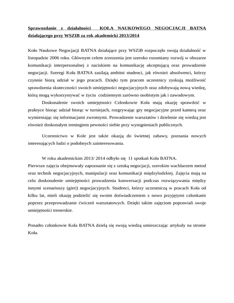 Sprawozdanie z działalności KOŁA NAUKOWEGO NEGOCJACJI BATNA działającego przy WSZIB za rok akademicki 2013/2014 Koło Naukowe Negocjacji BATNA działające przy WSZiB rozpoczęło swoją działalność w listopadzie 2006 roku. Głównym celem zrzeszenia jest szeroko rozumiany rozwój w obszarze komunikacji interpersonalnej z naciskiem na komunikację akceptującą oraz prowadzenie negocjacji. Szeregi Koła BATNA zasilają ambitni studenci, jak również absolwenci, którzy czynnie biorą udział w jego pracach. Dzięki tym pracom uczestnicy zyskują możliwość sprawdzenia skuteczności swoich umiejętności negocjacyjnych oraz zdobywają nową wiedzę, którą mogą wykorzystywać w życiu codziennym zarówno osobistym jak i zawodowym. Doskonalenie swoich umiejętności Członkowie Koła mają okazję sprawdzić w praktyce biorąc udział biorąc w turniejach, rozgrywając gry negocjacyjne przed kamerą oraz wymieniając się informacjami zwrotnymi. Prowadzenie warsztatów i dzielenie się wiedzą jest również doskonałym treningiem pewności siebie przy wystąpieniach publicznych. Uczestnictwo w Kole jest także okazją do świetnej zabawy, poznania nowych interesujących ludzi o podobnych zainteresowania. W roku akademickim 2013/ 2014 odbyło się 11 spotkań Koła BATNA. Pierwsze zajęcia obejmowały zapoznanie się z sztuką negocjacji, szerokim wachlarzem metod oraz technik negocjacyjnych, manipulacji oraz komunikacji międzyludzkiej. Zajęcia mają na celu doskonalenie umiejętności prowadzenia konwersacji podczas rozwiązywania między innymi scenariuszy (gier|) negocjacyjnych. Studenci, którzy uczestniczą w pracach Koła od kilku lat, mieli okazję podzielić się swoim doświadczeniem z nowo przyjętymi członkami poprzez przeprowadzanie ćwiczeń warsztatowych. Dzięki takim zajęciom poprawiali swoje umiejętności trenerskie. Ponadto członkowie Koła BATNA dzielą się swoją wiedzą umieszczając artykuły na stronie Koła. Szczegółowy wykaz tematów realizowanych przez koło: W roku akademickim 2013/2014 Koło BATNA poza aktywnością wewnętrzną brało udział w projektach dla szerszego grona odbiorców. Jednym z większych pierwszych projektów Koła BATNA była współorganizacja z Akademią Dobrego Startu „AKADOS” spotkania z zawodowym negocjatorem biznesowym Krzysztofem Sarneckim, które odbyło się 2 kwietnia 2014r. W spotkaniu uczestniczyło ponad 180 studentów z wiodących uczelni krakowskich (m. in. UJ, AGH, UEK, UR, UP, POLITECHNIKA, WSZiB, AK i inne,). Uczestnicy w czasie czterogodzinnego spotkania edukacyjnego mieli okazję zaznajomić się z arkanami komunikacji nieantagonizującej, poznać podstawowe zasady którymi kieruje się człowiek podczas podejmowania wszelkich decyzji związanych nie tylko z negocjacjami ale także występujących zarówno w życiu codziennym jak i biznesowym. Spotkanie z „prezentacji-wykładu” przerodziło się w burzliwą dyskusję. Pan Sarnecki z chęcią odpowiadał na zadawane pytania i praktycznie objaśniał mechanizmy, które działają na rozmówców w czasie naturalnej komunikacji jak i podczas negocjacji. W trakcie spotkania uczestnicy z biernych słuchaczy stali się zaangażowanymi uczestnikami biorąc czynny udział w prezentowanych scenkach i aktywnym zadawaniu pytań. W dniach 6 i 7 marca 2014 roku Koło BATNA podjęło się także współorganizacji Dni Otwartych Uczelni podczas, których członkowie Koła prowadzili warsztaty edukacyjne. Pierwszy warsztat obejmował tematykę poszukiwania pracy i odbył się pod hasłem " Moje pierwsze C.V, czyli jak otworzyć sobie drzwi do kariery zawodowej". Zarys warsztatu był interesujący i bardzo życiowy. Obejmował nie tylko wiedzę merytoryczną, ale również ćwiczenia praktyczne, gdzie uczestnicy budowali swój pozytywny wizerunek. Głównym celem warsztatu było udzielenie wskazówek co powinno zawierać poprawnie napisane C.V, aby było ono na tyle "atrakcyjne" dla potencjalnego pracodawcy, by uzyskać zaproszenie na kolejny etap rekrutacji,czyli - rozmowę kwalifikacyjną. Ćwiczenia praktyczne, tak zostały dobrane, aby uczestnicy w ramach ich wykonywania odkryli w sobie w szczególności swoje mocne strony, talenty oraz umiejętności, które nabyli podczas dotychczasowej edukacji. Kolejne zajęcia to "Warsztat z negocjacji. Podstawy negocjacji. Pierwsze stracie". Cieszył się on ogromną popularnością. Szkolenie obejmowało 1,5 godzinny nauki połączonej z dobrą zabawą. W ciągu tego czasu uczestnicy mogli zapoznać się z podstawowymi informacjami z zakresu negocjacji, czyli czym są negocjacje, jakie wyróżniani etapy oraz poznali kilka podstawowych technik negocjacyjnych. Uczestnicy mieli szansę przećwiczyć techniki w symulacyjnych grach i scenkach negocjacyjnych. Grupy świetnie wpasowały się w "przypisane" role i wykorzystując zdobytą wiedzę - negocjowali określone w scenariuszach cele. Oprócz zajęć prowadzonych w murach WSZiB p. Magdalena Knapik – Woch uczestniczka Koła BATNA przeprowadziła warsztaty dla licealistów w szkołach: - 19.10.2013 w Zespole Szkół Zawodowych w Wieliczce trzy godzinny warsztat o temacie: "Komunikacja bez słów, czyli tajemniczy świat gestów. Komunikacja niewerbalna." dla uczniów z IV klas. Młodzież podczas zajęć była pełna pozytywnego nastawienia i chęci zdobywania nowej wiedzy. Podczas zajęć zaprezentowano prezentacje multimedialną (mini wykład) oraz ćwiczenia praktyczne mające na celu przybliżenie uczestnikom szkolenia komunikacji niewerbalnej. Uczestnicy poznali podstawowe pojęcia związane z tematem, obrazowo zobaczyli czym różni się otwarty i zamknięty język ciała, znaczenie gestów ciała w życiu oraz w kulturze międzynarodowej. Spotkanie przebiegło w miłej i sympatycznej atmosferze, gdzie wszyscy dobrze się bawili, a przy okazji nauczyli się czegoś nowego. - 19.11.2013 również w Zespole Szkół Zawodowych w Wieliczce im. Edwarda Dembowskiego
