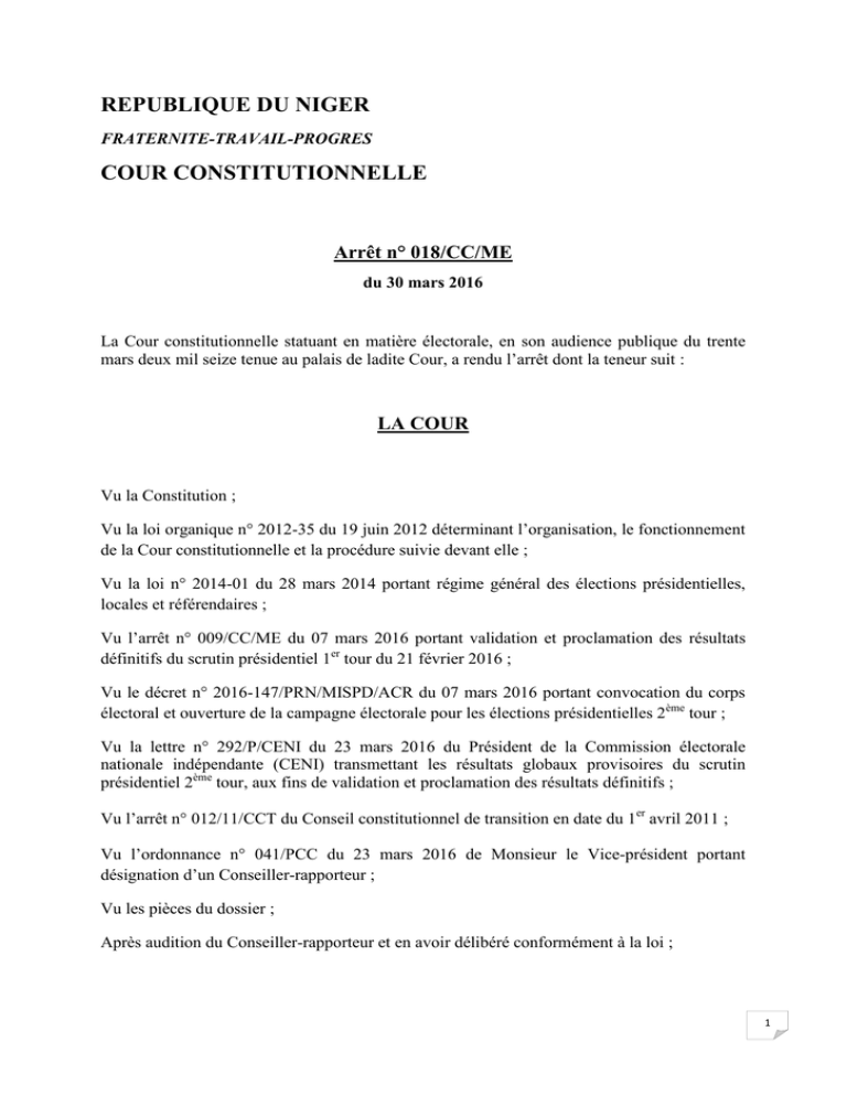 REPUBLIQUE DU NIGER FRATERNITE-TRAVAIL-PROGRES COUR CONSTITUTIONNELLE Arrêt n° 018/CC/ME du 30 mars 2016 La Cour constitutionnelle statuant en matière électorale, en son audience publique du trente mars deux mil seize tenue au palais de ladite Cour, a rendu l’arrêt dont la teneur suit : LA COUR Vu la Constitution ; Vu la loi organique n° 2012-35 du 19 juin 2012 déterminant l’organisation, le fonctionnement de la Cour constitutionnelle et la procédure suivie devant elle ; Vu la loi n° 2014-01 du 28 mars 2014 portant régime général des élections présidentielles, locales et référendaires ; Vu l’arrêt n° 009/CC/ME du 07 mars 2016 portant validation et proclamation des résultats définitifs du scrutin présidentiel 1er tour du 21 février 2016 ; Vu le décret n° 2016-147/PRN/MISPD/ACR du 07 mars 2016 portant convocation du corps électoral et ouverture de la campagne électorale pour les élections présidentielles 2ème tour ; Vu la lettre n° 292/P/CENI du 23 mars 2016 du Président de la Commission électorale nationale indépendante (CENI) transmettant les résultats globaux provisoires du scrutin présidentiel 2ème tour, aux fins de validation et proclamation des résultats définitifs ; Vu l’arrêt n° 012/11/CCT du Conseil constitutionnel de transition en date du 1er avril 2011 ; Vu l’ordonnance n° 041/PCC du 23 mars 2016 de Monsieur le Vice-président portant désignation d’un Conseiller-rapporteur ; Vu les pièces du dossier ; Après audition du Conseiller-rapporteur et en avoir délibéré conformément à la loi ; 1 EN LA FORME Considérant que par lettre n° 292 /P/CENI en date du 23 mars 2016, enregistrée au greffe de la Cour le même jour sous le n° 44/greffe/ordre, le Président de la Commission électorale nationale indépendante (CENI) a saisi la Cour aux fins de valider et proclamer les résultats définitifs du scrutin présidentiel 2ème tour du 20 mars 2016 ; Considérant qu’aux termes de l’article 120 alinéa 1 de la Constitution, «La Cour constitutionnelle est la juridiction compétente en matière constitutionnelle et électorale.» ; Que l’article 127 de la Constitution dispose que « La Cour constitutionnelle contrôle la régularité des élections présidentielles et législatives. Elle examine les réclamations, statue sur le contentieux des élections présidentielles et législatives et proclame les résultats des scrutins… » ; Considérant qu’il ressort de l’article 87 de la loi n° 2014-01 du 28 mars 2014 portant régime général des élections présidentielles, locales et référendaires que la CENI procède à la proclamation et à la diffusion des résultats provisoires des élections et les transmet immédiatement à la Cour constitutionnelle pour validation ; Considérant que l’article 36 de la loi organique n° 2012-35 du 19 juin 2012 déterminant l’organisation, le fonctionnement de la Cour constitutionnelle et la procédure suivie devant elle, dispose que la Cour constitutionnelle contrôle la régularité, la transparence et la sincérité des élections présidentielles et proclame les résultats définitifs des élections ; Qu’aux termes de l’article 37 de la loi précitée la Cour proclame les résultats définitifs du scrutin présidentiel dans les quinze (15) jours à compter de la réception des résultats globaux provisoires accompagnés des procès-verbaux transmis par la Commission électorale nationale indépendante (CENI) ; Considérant qu’il résulte de l’article 48 de la même loi que le candidat déclaré élu demeure en fonction jusqu’à ce qu’il soit définitivement statué sur les réclamations ; Considérant qu’au regard des dispositions sus-rapportées, la requête est recevable et la Cour compétente pour statuer ; AU FOND Considérant que la CENI a joint à sa requête les pièces suivantes : 1°) Des colis contenant les procès-verbaux dressés au niveau des différents bureaux de vote et les tableaux de recensement des votes, empaquetés par commune et commission diplomatique ou consulaire ; 2°) Une (01) chemise contenant les fax des résultats globaux provisoires de l’élection présidentielle 2ème tour par commune ou commission diplomatique ou consulaire, transmis à la Commission électorale nationale indépendante (CENI) par les différentes commissions régionales des élections et les commissions diplomatiques ou consulaires ; 2 3°) Une (01) chemise contenant les résultats globaux provisoires de l’élection présidentielle 2ème tour par commune et commission diplomatique ou consulaire, traités par la cellule informatique de la CENI et diffusée par la Commission électorale nationale indépendante ; Considérant qu’il résulte des documents ainsi produits par la CENI ce qui suit : Nombre de bureaux de vote ………………………………………………………. 25.792 Nombre de bureaux de vote parvenus………………………………………………25.711 Nombre d’inscrits………………………………………………………………...7.581.540 Nombre d’inscrits votants ………………………………………………………4.360.787 Votants sur liste additive…………………………………………………………...172.480 Nombre total de votants …………………………………………………………4.533.267 Bulletins blancs ou nuls ……………………………………………………………94.625 Suffrages exprimés valables……………………………………………………….4.438.642 Taux de participation ………………………………………………………………...59,79 % Taux d’abstention……………………………………………………………………..40,21 % REPARTITION DES VOIX PAR CANDIDAT PARTI POLITIQUE NOM DU CANDIDAT MODEN FA LUMANA AFRICA HAMA AMADOU PNDS TARAYYA ISSOUFOU MAHAMADOU TOTAL NBRE DE VOIX POURCENTAGE 333 1