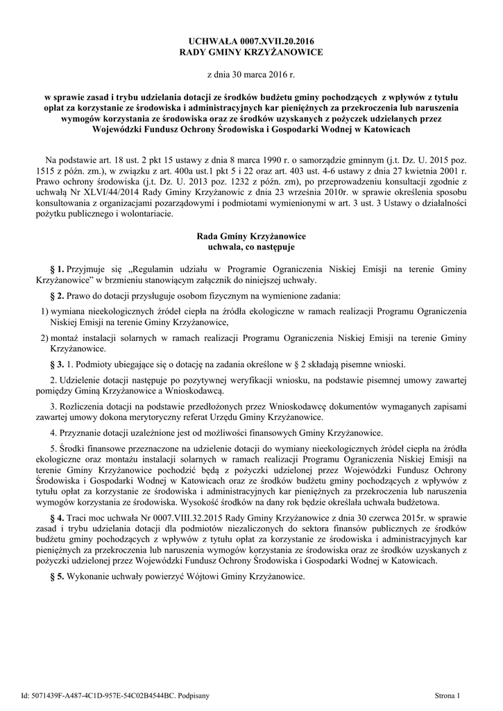 UCHWAŁA 0007.XVII.20.2016 RADY GMINY KRZYŻANOWICE z dnia 30 marca 2016 r. w sprawie zasad i trybu udzielania dotacji ze środków budżetu gminy pochodzących z wpływów z tytułu opłat za korzystanie ze środowiska i administracyjnych kar pieniężnych za przekroczenia lub naruszenia wymogów korzystania ze środowiska oraz ze środków uzyskanych z pożyczek udzielanych przez Wojewódzki Fundusz Ochrony Środowiska i Gospodarki Wodnej w Katowicach Na podstawie art. 18 ust. 2 pkt 15 ustawy z dnia 8 marca 1990 r. o samorządzie gminnym (j.t. Dz. U. 2015 poz. 1515 z późn. zm.), w związku z art. 400a ust.1 pkt 5 i 22 oraz art. 403 ust. 4-6 ustawy z dnia 27 kwietnia 2001 r. Prawo ochrony środowiska (j.t. Dz. U. 2013 poz. 1232 z późn. zm), po przeprowadzeniu konsultacji zgodnie z uchwałą Nr XLVI/44/2014 Rady Gminy Krzyżanowic z dnia 23 września 2010r. w sprawie określenia sposobu konsultowania z organizacjami pozarządowymi i podmiotami wymienionymi w art. 3 ust. 3 Ustawy o działalności pożytku publicznego i wolontariacie. Rada Gminy Krzyżanowice uchwala, co następuje § 1. Przyjmuje się „Regulamin udziału w Programie Ograniczenia Niskiej Emisji na terenie Gminy Krzyżanowice” w brzmieniu stanowiącym załącznik do niniejszej uchwały. § 2. Prawo do dotacji przysługuje osobom fizycznym na wymienione zadania: 1) wymiana nieekologicznych źródeł ciepła na źródła ekologiczne w ramach realizacji Programu Ograniczenia Niskiej Emisji na terenie Gminy Krzyżanowice, 2) montaż instalacji solarnych w ramach realizacji Programu Ograniczenia Niskiej Emisji na terenie Gminy Krzyżanowice. § 3. 1. Podmioty ubiegające się o dotację na zadania określone w § 2 składają pisemne wnioski. 2. Udzielenie dotacji następuje po pozytywnej weryfikacji wniosku, na podstawie pisemnej umowy zawartej pomiędzy Gminą Krzyżanowice a Wnioskodawcą. 3. Rozliczenia dotacji na podstawie przedłożonych przez Wnioskodawcę dokumentów wymaganych zapisami zawartej umowy dokona merytoryczny referat Urzędu Gminy Krzyżanowice. 4. Przyznanie dotacji uzależnione jest od możliwości finansowych Gminy Krzyżanowice. 5. Środki finansowe przeznaczone na udzielenie dotacji do wymiany nieekologicznych źródeł ciepła na źródła ekologiczne oraz montażu instalacji solarnych w ramach realizacji Programu Ograniczenia Niskiej Emisji na terenie Gminy Krzyżanowice pochodzić będą z pożyczki udzielonej przez Wojewódzki Fundusz Ochrony Środowiska i Gospodarki Wodnej w Katowicach oraz ze środków budżetu gminy pochodzących z wpływów z tytułu opłat za korzystanie ze środowiska i administracyjnych kar pieniężnych za przekroczenia lub naruszenia wymogów korzystania ze środowiska. Wysokość środków na dany rok będzie określała uchwała budżetowa. § 4. Traci moc uchwała Nr 0007.VIII.32.2015 Rady Gminy Krzyżanowice z dnia 30 czerwca 2015r. w sprawie zasad i trybu udzielania dotacji dla podmiotów niezaliczonych do sektora finansów publicznych ze środków budżetu gminy pochodzących z wpływów z tytułu opłat za korzystanie ze środowiska i administracyjnych kar pieniężnych za przekroczenia lub naruszenia wymogów korzystania ze środowiska oraz ze środków uzyskanych z pożyczki udzielonej przez Wojewódzki Fundusz Ochrony Środowiska i Gospodarki Wodnej w Katowicach. § 5. Wykonanie uchwały powierzyć Wójtowi Gminy Krzyżanowice. Id: 5071439F-A487-4C1D-957E-54C02B4544BC. Podpisany Strona 1 § 6. Uchwała wchodzi w życie po upływie 14 dni od daty ogłoszenia w Dzienniku Urzędowym Województwa Śląskiego. Przewodniczący Rady Gminy Brunon Chrzibek Id: 5071439F-A487-4C1D-957E-54C02B4544BC. Podpisany Strona 2 Załącznik do Uchwały Nr 0007.XVII.20.2016 Rady Gminy Krzyżanowice z dnia 30 marca 2016 r. Regulamin udziału w Programie ograniczenia niskiej emisji na terenie Gminy Krzyżanowice § 1. Definicje Ilekroć w Regulaminie jest mowa o: 1. Programie - rozumie się przez to Program Ograniczenia Niskiej Emisji na terenie Gminy Krzyżanowice na lata 2015-2017 zatwierdzony uchwałą Rady Gminy Krzyżanowice Nr 0007.II.18.2014 z dnia 22 grudnia 2014 roku. 2. Urzędzie - rozumie się przez to Urząd Gminy Krzyżanowice. 3. Operatorze - rozumie się przez to wybrany przez Urząd podmiot posiadający wszelkie upoważnienia do realizacji Programu. 4. Inwestorze - rozumie się przez to osobę fizyczną posiadającą tytuł prawny do budynku mieszkalnego albo nieruchomości zabudowanej budynkiem mieszkalnym zlokalizowanej na terenie Gminy Krzyżanowice 5. Wykonawcy - rozumie się przez to firmę zarejestrowaną u Operatora, dokonującą wymiany źródła ciepła/ montażu instalacji solarnej. 6. Dostawcy – rozumie się przez to producenta/pośrednika dostarczającego nowe źródło ciepła. 7. Starym źródle ciepła – rozumie się przez to nieekologiczny kocioł lub piec węglowy. 8. Nowym źródle ciepła – rozumie się przez to ekologiczny kocioł gazowy, węglowy retortowy, i inne czyste technologie pod warunkiem wykazania efektu ekologicznego dopuszczone przez Operatora. 9. Instalacji solarnej - rozumie się przez to instalację zawierającą kolektory słoneczne umożliwiającą wykorzystanie energii słonecznej na potrzeby c.w.u. lub jako wspomaganie c.o. 10. Budynku mieszkalnym – rozumie się przez to budynek, w którym przynajmniej 70% powierzchni stanowi część mieszkalna i nie więcej niż 30% część usługowa lub inna. § 2. Program 1. Celem Programu jest zmniejszenie ilości zanieczyszczeń emitowanych do powietrza z procesów spalania paliw stałych oraz wyeliminowanie możliwości spalania odpadów w paleniskach domowych w budynkach mieszkalnych jednorodzinnych zlokalizowanych na terenie Gminy Krzyżanowice. 2. Program przewiduje wymianęźródeł ciepła oraz montaż instalacji solarnychw budynkach jednorodzinnych na terenie Gminy Krzyżanowice, maksymalnie do wysokości środków pochodzących z pożyczki Wojewódzkiego Funduszu Ochrony 