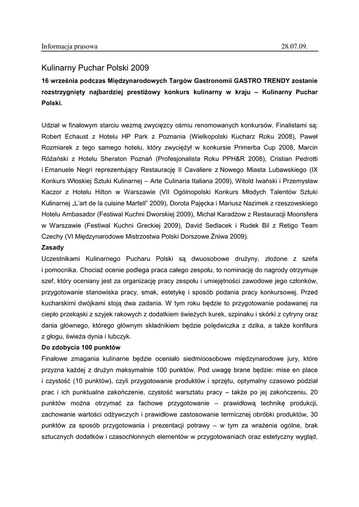 Informacja prasowa 28.07.09. Kulinarny Puchar Polski 2009 16 września podczas Międzynarodowych Targów Gastronomii GASTRO TRENDY zostanie rozstrzygnięty najbardziej prestiŜowy konkurs kulinarny w kraju – Kulinarny Puchar Polski. Udział w finałowym starciu wezmą zwycięzcy ośmiu renomowanych konkursów. Finalistami są: Robert Echaust z Hotelu HP Park z Poznania (Wielkopolski Kucharz Roku 2008), Paweł Rozmiarek z tego samego hotelu, który zwycięŜył w konkursie Primerba Cup 2008, Marcin RóŜański z Hotelu Sheraton Poznań (Profesjonalista Roku PPH&R 2008), Cristian Pedrotti i Emanuele Negri reprezentujący Restaurację Il Cavaliere z Nowego Miasta Lubawskiego (IX Konkurs Włoskiej Sztuki Kulinarnej – Arte Culinaria Italiana 2009), Witold Iwański i Przemysław Kaczor z Hotelu Hilton w Warszawie (VII Ogólnopolski Konkurs Młodych Talentów Sztuki Kulinarnej „L’art de la cuisine Martell” 2009), Dorota Pajęcka i Mariusz Nazimek z rzeszowskiego Hotelu Ambasador (Festiwal Kuchni Dworskiej 2009), Michał KaradŜow z Restauracji Moonsfera w Warszawie (Festiwal Kuchni Greckiej 2009), David Sedlacek i Rudek Bil z Retigo Team Czechy (VI Międzynarodowe Mistrzostwa Polski Dorszowe śniwa 2009). Zasady Uczestnikami Kulinarnego Pucharu Polski są dwuosobowe druŜyny, złoŜone z szefa i pomocnika. ChociaŜ ocenie podlega praca całego zespołu, to nominację do nagrody otrzymuje szef, który oceniany jest za organizację pracy zespołu i umiejętności zawodowe jego członków, przygotowanie stanowiska pracy, smak, estetykę i sposób podania pracy konkursowej. Przed kucharskimi dwójkami stoją dwa zadania. W tym roku będzie to przygotowanie podawanej na ciepło przekąski z szyjek rakowych z dodatkiem świeŜych kurek, szpinaku i skórki z cytryny oraz dania głównego, którego głównym składnikiem będzie polędwiczka z dzika, a takŜe konfitura z głogu, świeŜa dynia i lubczyk. Do zdobycia 100 punktów Finałowe zmagania kulinarne będzie oceniało siedmioosobowe międzynarodowe jury, które przyzna kaŜdej z druŜyn maksymalnie 100 punktów. Pod uwagę brane będzie: mise en place i czystość (10 punktów), czyli przygotowanie produktów i sprzętu, optymalny czasowo podział prac i ich punktualne zakończenie, czystość warsztatu pracy – takŜe po jej zakończeniu, 20 punktów moŜna otrzymać za fachowe przygotowanie – prawidłową technikę produkcji, zachowanie wartości odŜywczych i prawidłowe zastosowanie termicznej obróbki produktów, 30 punktów za sposób przygotowania i prezentacji potrawy – w tym za wraŜenia ogólne, brak sztucznych dodatków i czasochłonnych elementów w przygotowaniach oraz estetyczny wygląd, Informacja prasowa 28.07.09. a 40 punktów za smak potrawy – oceniany jako smak własny produktu, zestawienie smakowe produktów, prawidłowy dobór dodatków i doprawienie zachowujące smak własny surowca. Zabronione jest stosowanie sztucznych czy przygotowanych wcześniej dekoracji i dodatków, gotowych farszów i sosów (fond, majonez i ketchup są dopuszczalne jako podstawa), a takŜe uformowanych zawczasu elementów mięsa, warzyw, ciast lub ryb. Całemu przedsięwzięciu przyglądać się będą obserwatorzy z Europejskiego Stowarzyszenia Kucharzy Euro-Toques Polska, Ogólnopolskiego Stowarzyszenia Szefów Kuchni i Cukierni oraz Klubu Szefów Kuchni, które to stowarzyszenia objęły honorowy patronat nad Kulinarnym Pucharem Polski 2009. Nagrody Zwycięzca Kulinarnego Pucharu Polski 2009 otrzymuje wysoką nagrodę pienięŜną i moŜliwość wyjazdu na szkolenie do prestiŜowego Instytutu Paula Bocuse w Lyonie. Przede wszystkim jednak, konkurs jest szansą na zaprezentowanie swoich umiejętności dla kucharzy, którzy są na początku swojej drogi zawodowej a jednocześnie są świadomi swojego duŜego potencjału. Konkurs jest przepustką do szybkiej kariery i dalszego rozwijania swych umiejętności w najlepszych restauracjach europejskich. 16 września, pawilon 7 – przestrzeń specjalna, godz. 10.00-15.00 Organizatorzy konkursu: Wielkopolska Izba Gastronomii, Międzynarodowe Targi Poznańskie Patroni honorowi: Klub Szefów Kuchni, Europejskie Stowarzyszenie Kucharzy Euro-Toques, Ogólnopolskie Stowarzyszenie Szefów Kuchni i Cukierni Patroni medialni: Gastrona.pl, Restaurator, Poradnik Restauratora, Przegląd Gastronomiczny Sponsor strategiczny: Unilever Foodsolutions