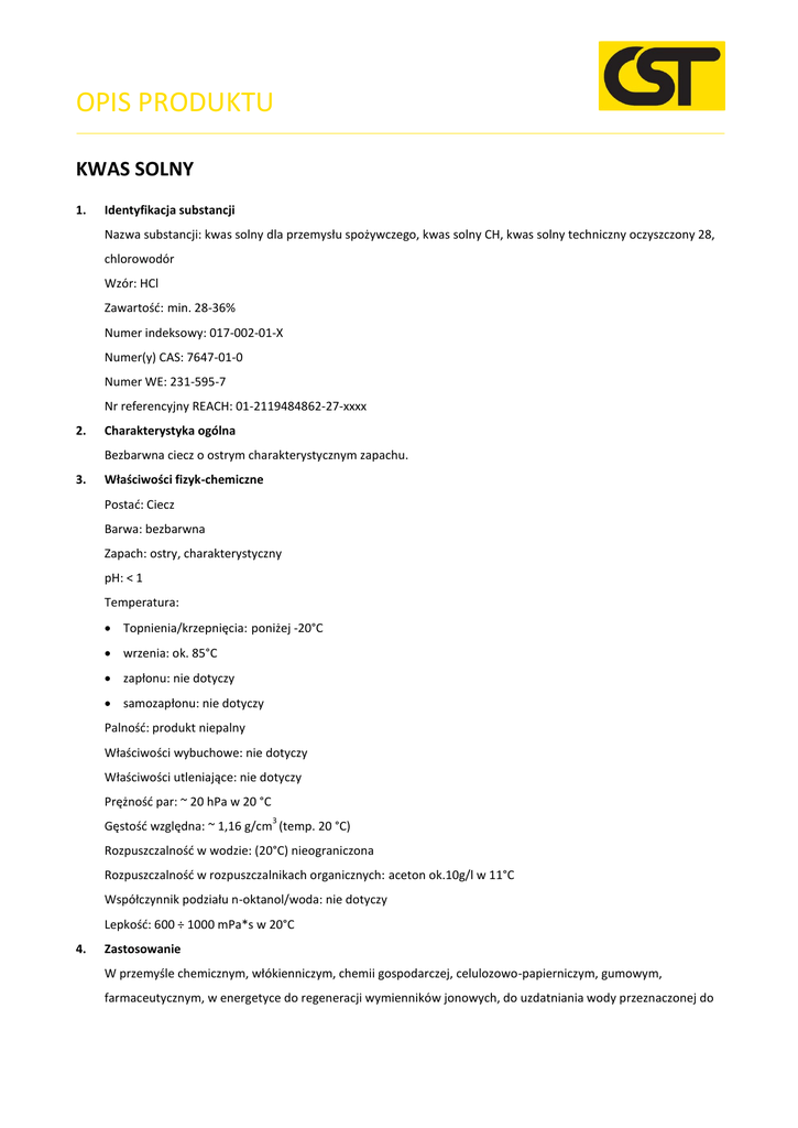 OPIS PRODUKTU KWAS SOLNY 1. Identyfikacja substancji Nazwa substancji: kwas solny dla przemysłu spożywczego, kwas solny CH, kwas solny techniczny oczyszczony 28, chlorowodór Wzór: HCl Zawartość: min. 28-36% Numer indeksowy: 017-002-01-X Numer(y) CAS: 7647-01-0 Numer WE: 231-595-7 Nr referencyjny REACH: 01-2119484862-27-xxxx 2. Charakterystyka ogólna Bezbarwna ciecz o ostrym charakterystycznym zapachu. 3. Właściwości fizyk-chemiczne Postać: Ciecz Barwa: bezbarwna Zapach: ostry, charakterystyczny pH: < 1 Temperatura: Topnienia/krzepnięcia: poniżej -20°C wrzenia: ok. 85°C zapłonu: nie dotyczy samozapłonu: nie dotyczy Palność: produkt niepalny Właściwości wybuchowe: nie dotyczy Właściwości utleniające: nie dotyczy Prężność par: ~ 20 hPa w 20 °C 3 Gęstość względna: ~ 1,16 g/cm (temp. 20 °C) Rozpuszczalność w wodzie: (20°C) nieograniczona Rozpuszczalność w rozpuszczalnikach organicznych: aceton ok.10g/l w 11°C Współczynnik podziału n-oktanol/woda: nie dotyczy Lepkość: 600 ÷ 1000 mPa*s w 20°C 4. Zastosowanie W przemyśle chemicznym, włókienniczym, chemii gospodarczej, celulozowo-papierniczym, gumowym, farmaceutycznym, w energetyce do regeneracji wymienników jonowych, do uzdatniania wody przeznaczonej do OPIS PRODUKTU spożycia. Zastosowania zidentyfikowane wraz z opracowanymi scenariuszami narażenia znajdują się w Raporcie Bezpieczeństwa Chemicznego. 5. Zalecenia BHP Zachować szczególne środki ostrożności ze względu na silne własności żrące. Kwas solny reaguje z większością metali z wydzieleniem wodoru. W reakcjach z wieloma związkami wydzielają się silnie toksyczne gazy jak siarkowodór, cyjanowodór, arsenowodór czy chlor. Unikać kontaktu ze skórą i oczami oraz narażenia dróg oddechowych. Zabezpieczyć przed dostępem osób postronnych. 6. Transport Specyfikacja dla transportu: Numer UN: 1789 Klasa zagrożenia w transporcie: klasa 8, Grupa pakowania: II Numer rozpoznawczy zagrożenia: 80 Nie wolno stosować opakowań ze stali bez wewnętrznej okładziny gumowej lub plastykowej. 7. Przechowywanie i PPOŻ Przechowywać w szczelnie zamkniętych opakowaniach, zabezpieczonych przed możliwością kontaktu z wilgocią lub kwasami. Nie stosować opakowań z metali kolorowych (aluminium, cyna, cynku). Okres trwałości wynosi 5 lat, licząc od daty produkcji. Po tym okresie może być stosowany jeśli nie zostało naruszone oryginalne opakowanie produktu i po sprawdzeniu zgodności parametrów z wymaganiami technicznymi. Temperatura przechowywania: brak ograniczeń. Wentylacja w pomieszczeniach zamkniętych. Zabezpieczyć przed dostępem osób postronnych. 8. Utylizacja odpadów Nie usuwać do kanalizacji. Nie dopuścić do zanieczyszczenia wód powierzchniowych i gruntowych. Nie składować na składowiskach odpadów obojętnych. Odzysk lub unieszkodliwianie odpadowego produktu przeprowadzić zgodnie z obowiązującymi przepisami w instalacjach lub urządzeniach spełniających określone wymagania (licencjonowane zakłady lub producent). Zgodnie z Dyrektywą Parlamentu Europejskiego i Rady 2008/98/WE z dnia 19 listopada 2008 r. w sprawie odpadów. Zgodnie z Dyrektywą 94/62/WE Parlamentu Europejskiego i Rady z dnia 20 grudnia 1994 r. w sprawie opakowań i odpadów opakowaniowych.