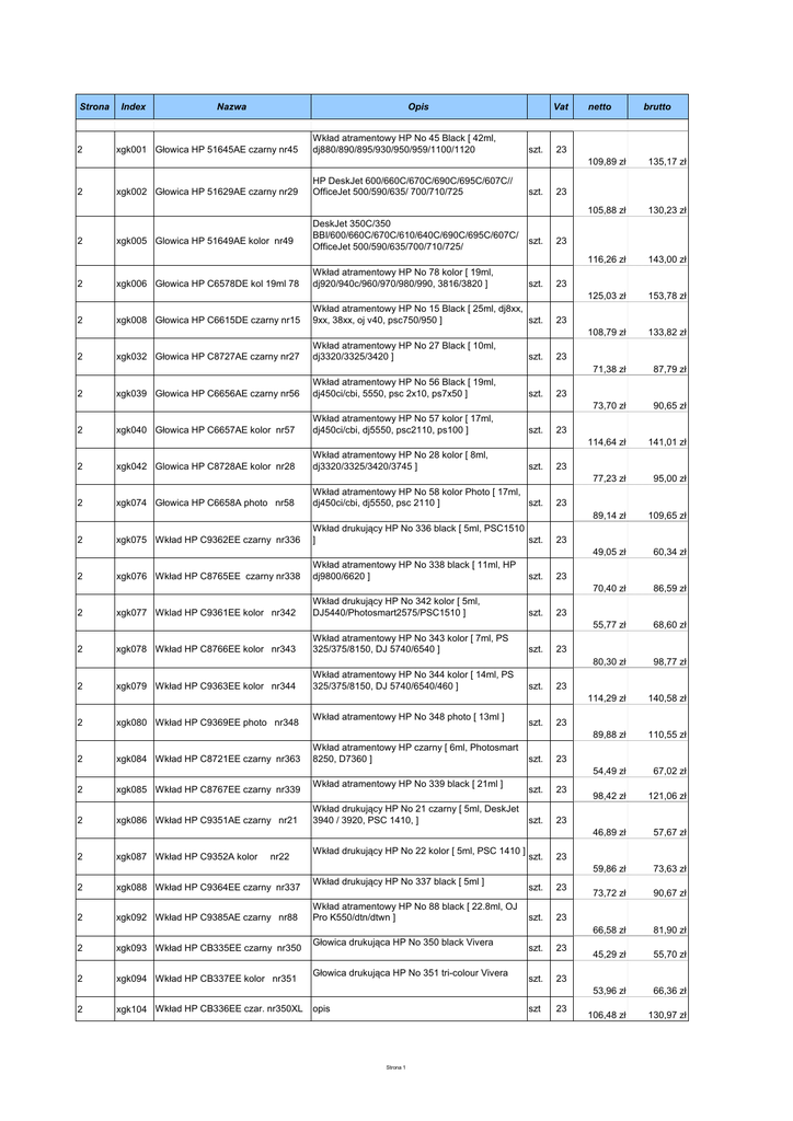 Strona 2 2 2 2 2 2 2 2 2 2 2 2 2 2 2 2 Index Nazwa Opis xgk001 Głowica HP 51645AE czarny nr45 xgk002 Głowica HP 51629AE czarny nr29 xgk005 Glowica HP 51649AE kolor nr49 xgk008 Głowica HP C6615DE czarny nr15 xgk032 Głowica HP C8727AE czarny nr27 Wkład atramentowy HP No 27 Black [ 10ml, dj3320/3325/3420 ] xgk039 Głowica HP C6656AE czarny nr56 Wkład atramentowy HP No 56 Black [ 19ml, dj450ci/cbi, 5550, psc 2x10, ps7x50 ] xgk040 Głowica HP C6657AE kolor nr57 Wkład atramentowy HP No 57 kolor [ 17ml, dj450ci/cbi, dj5550, psc2110, ps100 ] xgk042 Glowica HP C8728AE kolor nr28 Wkład atramentowy HP No 28 kolor [ 8ml, dj3320/3325/3420/3745 ] xgk074 Głowica HP C6658A photo nr58 Wkład atramentowy HP No 58 kolor Photo [ 17ml, dj450ci/cbi, dj5550, psc 2110 ] szt. xgk075 Wkład HP C9362EE czarny nr336 Wkład drukujący HP No 336 black [ 5ml, PSC1510 ] szt. xgk076 Wkład HP C8765EE czarny nr338 Wkład atramentowy HP No 338 black [ 11ml, HP dj9800/6620 ] xgk077 Wklad HP C9361EE kolor nr342 Wkład drukujący HP No 342 kolor [ 5ml, DJ5440/Photosmart2575/PSC1510 ] xgk078 Wkład HP C8766EE kolor nr343 Wkład atramentowy HP No 343 kolor [ 7ml, PS 325/375/8150, DJ 5740/6540 ] xgk079 Wkład HP C9363EE kolor nr344 Wkład atramentowy HP No 344 kolor [ 14ml, PS 325/375/8150, DJ 5740/6540/460 ] xgk080 Wkład HP C9369EE photo nr348 xgk085 Wkład HP C8767EE czarny nr339 xgk086 Wkład HP C9351AE czarny nr21 xgk087 Wkład HP C9352A kolor nr22 xgk088 Wkład HP C9364EE czarny nr337 2 xgk092 Wkład HP C9385AE czarny nr88 2 xgk093 Wkład HP CB335EE czarny nr350 2 xgk094 Wkład HP CB337EE kolor nr351 2 szt. Wkład atramentowy HP No 15 Black [ 25ml, dj8xx, 9xx, 38xx, oj v40, psc750/950 ] szt. 2 2 DeskJet 350C/350 BBI/600/660C/670C/610/640C/690C/695C/607C/ OfficeJet 500/590/635/700/710/725/ szt. xgk006 Głowica HP C6578DE kol 19ml 78 xgk084 Wkład HP C8721EE czarny nr363 2 HP DeskJet 600/660C/670C/690C/695C/607C// OfficeJet 500/590/635/ 700/710/725 szt. Wkład atramentowy HP No 78 kolor [ 19ml, dj920/940c/960/970/980/990, 3816/3820 ] 2 2 Wkład atramentowy HP No 45 Black [ 42ml, dj880/890/895/930/950/959/1100/1120 Vat xgk104 Wkład HP CB336EE czar. nr350XL Wkład atramentowy HP No 348 photo [ 13ml ] Wkład atramentowy HP czarny [ 6ml, Photosmart 8250, D7360 ] Wkład atramentowy HP No 339 black [ 21ml ] Wkład drukujący HP No 21 czarny [ 5ml, DeskJet 3940 / 3920, PSC 1410, ] Wkład drukujący HP No 22 kolor [ 5ml, PSC 1410 ] Wkład drukujący HP No 337 black [ 5ml ] Wkład atramentowy HP No 88 black [ 22.8ml, OJ Pro K550/dtn/dtwn ] Głowica drukująca HP No 350 black Vivera Głowica drukująca HP No 351 tri-colour Vivera opis szt. szt. szt. szt. szt. szt. szt. szt. szt. szt. Strona 1 109,89 zł 135,17 zł 105,88 zł 130,23 zł 116,26 zł 143,00 zł 125,03 zł 153,78 zł 108,79 zł 133,82 zł 71,38 zł 87,79 zł 73,70 zł 90,65 zł 114,64 zł 141,01 zł 77,23 zł 95,00 zł 89,14 zł 109,65 zł 49,05 zł 60,34 zł 70,40 zł 86,59 zł 55,77 zł 68,60 zł 80,30 zł 98,77 zł 114,29 zł 140,58 zł 89,88 zł 110,55 zł 54,49 zł 67,02 zł 98,42 zł 121,06 zł 46,89 zł 57,67 zł 59,86 zł 73,63 zł 73,72 zł 90,67 zł 66,58 zł 81,90 zł 45,29 zł 55,70 zł 53,96 zł 66,36 zł 106,48 zł 130,97 zł 23 23 23 23 23 23 23 23 23 23 23 23 23 23 23 23 szt. 23 szt. 23 23 szt. 23 szt. 23 szt. 23 szt. 23 szt brutto 23 szt. szt. netto 23 Strona Index Nazwa Opis Vat 2 xgk105 Wkład HP CB338EE kolor nr351XL opis szt. 23 2 xgk111 Wklad HP C9351CE czarny nr21XL opis szt 23 2 2 xgk112 Atram. HP C9352C nr.22XL kol xgk114 Wkład HP CB334 czarny nr54 szt. szt 23 23 2 xtk060 Wkład HP C4836AE cyan szt. 23 xtk061 Wkład atramentowy HP No 11 Magenta [ 28ml, Wkład HP C4837AE magenta nr11 cp1700, bij22x0, 2600 ] 2 nr11 opis opis Wkład atramentowy HP No 11 Cyan [ 28ml, cp1700, bij22x0, 2600 ] szt. 2 xtk062 Wkład HP C4838AE yellow nr11 2 xtk107 Tusz HP CC640EE czarny nr300 opis szt. 23 2 xtk108 Tusz HP CC641EE czarny nr300XL opis szt. 23 2 xtk109 Tusz HP CC644EE color nr300XL opis szt 23 2 xtk110 Tusz HP CC643EE kolor opis szt 23 2 xtk111 Wkład HP C8719E czarny nr363XL opis szt. 23 2 xtk112 Wkład HP C8771EE cyan opis szt. 23 2 xtk113 Wkład HP C8772EE magenta nr363 opis szt. 23 2 xtk114 Wkład HP C8773EE yellow nr363 opis szt. 23 2 xtk115 Wkład HP C8774E ligth cyan 363 opis szt. 23 2 xtk116 Wkład HP C8775E light mage 363 opis szt. 23 2 xtk117 Tusz HP CB316EE czarny nr364 opis szt 23 2 xtk118 Wkład HP CB318E cyan opis szt. 23 2 xtk119 Tusz HP CB319E magenta nr364 opis szt. 23 2 xtk120 Tusz HP CB320EE yellow nr364 opis szt. 23 2 xtk124 Głowica HP C4810A czarna nr11 opis szt 23 2 xtk125 Głowica HP C4811A cyan opis szt. 23 2 xtk126 Głowica HP C4812A magenta nr11 opis szt. 23 2 xtk127 Głowica HP C4813A yellow nr11 opis szt. 23 2 xtk128 Wkład HP C9386AE cyan opis szt. 23 2 xtk129 Wkład HP C9387AE magenta nr88 opis szt. 23 2 xtk130 Wkład HP C9388AE yellow nr88 opis szt. 23 2 xtk134 Wkład HP CH561EE czarny nr301 opis szt. 23 2 xtk135 Wkład HP CH562EE kolor nr301 opis szt. 23 2 xtk136 Tusz HP CH563EE czarny nr301XL opis szt. 23 2 xtk137 Wkład HP CH564EE kolor nr301XL opis szt. 23 2 xtk138 Tusz HP CB317EEphoto black364 opis szt. 23 2 xtk139 Tusz HP CD887AE czarny nr.703 opis szt. 23 2 xtk140 Tusz HP CD888AE kolor nr.703 opis szt. 23 2 xtk141 Tusz HP CN692AE czarny nr704 opis szt. 23 2 xtk142 Tusz HP CN693AE kolor opis szt. 23 2 xtk143 Tusz HP CC653AE czarny nr901 opis szt. 23 2 xtk144 Tusz HP CC654AE czarny nr901XL opis szt. 23 nr363 nr364 nr11 nr88 nr704 Strona 2 brutto 112,09 zł 137,87 zł 84,26 zł 79,55 zł 107,45 zł 103,64 zł 97,85 zł 132,17 zł 126,96 zł 156,17 zł 126,97 zł 156,18 zł 126,97 zł 156,18 zł 44,80 zł 55,11 zł 89,16 zł 109,66 zł 103,05 zł 51,99 zł 126,75 zł 63,94 zł 104,89 zł 129,01 zł 36,71 zł 45,16 zł 36,47 zł 44,85 zł 35,43 zł 43,58 zł 36,00 zł 44,29 zł 36,18 zł 44,50 zł 30,31 zł 37,28 zł 25,47 zł 31,32 zł 26,00 zł 31,99 zł 26,00 zł 31,99 zł 118,97 zł 115,20 zł 146,32 zł 141,70