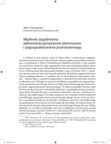 JERZY STELMASIAK Uniwersytet Marii Curie-Skłodowskiej, Lublin Węzłowe zagadnienia administracyjnoprawne planowania i zagospodarowania przestrzennego 1. Wejście w życie ustawy z dnia 27 marca 2003 r. o planowaniu i zagospodarowaniu przestrzennym1 było kolejnym etapem regulacji gospodarki przestrzenią i w przestrzeni w Polsce. Podstawowym środkiem prawnym w tym zakresie jest oczywiście miejscowy plan zagospodarowania przestrzennego będący aktem prawa miejscowego. Jest to jednak specyficzny akt normatywny w świetle dyspozycji art. 94 Konstytucji Rzeczypospolitej Polskiej z dnia 2 kwietnia 1997 r.2, ponieważ zawiera zarówno część opisową, jak i graficzną. Kształtując zagospodarowanie obszaru objętego planem – w praktyce jest to wyodrębniona część gminy (miasta) – określa zakres i sposoby postępowania w sprawach przeznaczenia terenów na określone cele. Dlatego też najwięcej konfliktów w prawidłowym zagospodarowaniu przestrzennym danego terenu wywołuje brak obowiązującego miejscowego planu zagospodarowania przestrzennego. W takim przypadku inwestor musi bowiem uzyskać decyzję o warunkach zabudowy i zagospodarowania przestrzennego, która obejmuje decyzję o warunkach zabudowy i decyzję o lokalizacji inwestycji celu publicznego. O ile plan miejscowy jest swoistym synchronizatorem prawidłowego zagospodarowania przestrzennego danego terenu, o tyle ani decyzja o warunkach zabudowy, ani decyzja o lokalizacji inwestycji celu publicznego nie spełniają tej roli, ponieważ nie pozwalają, jak się wydaje, na wypracowanie zawsze spójnej koncepcji zagospodarowania przestrzennego danego obszaru. Należy pamiętać, że w każdym przypadku musi ona uwzględniać konstytucyjną zasadę zrównoważonego rozwoju w świetle art. 5 Konstytucji RP, oraz art. 5 pkt 50 ustawy z dnia 27 kwietnia 2001 r. – Prawo ochrony środowiska3. 1 Dz.U. Nr 80, poz. 717 ze zm.; zob. też: Z. Niewiadomski, Nowe prawo o planowaniu i zagospodarowaniu przestrzennym. Komentarz, Warszawa 2003, nr 7–120; P. Kwaśniak: Plan miejscowy w systemie zagospodarowania przestrzennego, Warszawa 2008. 2 Dz.U. Nr 78, poz. 483. 3 Dz.U. z 2008 r., Nr 25, poz. 150 ze zm. BOC.indb 684 2009-09-11 11:54:44 Węzłowe zagadnienia administracyjnoprawne 685 2. Analiza linii orzecznictwa sądów administracyjnych w zakresie planowania i zagospodarowania przestrzennego pozwala odróżnić linię orzecznictwa, która dotyczy bezpośrednio kontroli planów miejscowych jako aktów prawa miejscowego, od tych orzeczeń sądów administracyjnych, w których poddane kontroli zostały decyzje o warunkach zabudowy i zagospodarowania przestrzennego. Trzeba bowiem pamiętać, że nadrzędnym celem każdej tego rodzaju kontroli sądów administracyjnych powinno być zabezpieczenie ładu przestrzennego na danym terenie. Z tych względów należy uwzględnić poszczególne zasady ogólne dotyczące planowania i zagospodarowania przestrzennego – oprócz, oczywiście, konstytucyjnej zasady zrównoważonego rozwoju. Jest to w szczególności zasada uwzględniania w planowaniu przestrzennym ustawowo określonych wymagań (np. w zakresie ładu przestrzennego o charakterze zintegrowanym4): wymagań ochrony środowiska, w tym także ochrony przyrody w odniesieniu do obszarów specjalnych o charakterze ekologicznym – w przedmiocie prawnych form ochrony w świetle art. 6 ustawy z dnia 16 kwietnia 2004 roku o ochronie przyrody5, wymagań ochrony dziedzictwa kulturowego i ochrony zabytków, ochrony zdrowia, bezpieczeństwa ludzi i mienia oraz obronności i bezpieczeństwa państwa, a także ochrony prawa własności czy też walorów architektonicznych i krajobrazowych. Podstawową zaletą prawidłowej gospodarki przestrzennej jest bowiem ważenie interesu publicznego wobec ochrony indywidualnego interesu prawnego w procesie zagospodarowania terenów przez inne podmioty. Należy podkreślić, że tylko podmiot, który ma interes prawny lub nałożony obowiązek jest, w świetle art. 28 k.p.a., stroną postępowania administracyjnego dotyczącego np. wydania decyzji o warunkach zabudowy i zagospodarowania terenu. Oczywiście, jeżeli obowiązuje przepis lex specialis, np. art. 44 ustawy z dnia 3 października 2008 r. o udostępnianiu informacji o środowisku i jego ochronie, udziale społeczeństwa w ochronie środowiska oraz o ocenach oddziaływania na środowisko6, to organizacja społeczna, np. o charakterze ekologicznym, może wstąpić do toczącego się postępowania administracyjnego wymagającego udziału społeczeństwa na prawach strony, natomiast przepisu art. 31 § 4 k.p.a. nie stosuje się. 3. Odrębny problem dotyczy realizacji w praktyce zasady wolności zabudowy i zagospodarowania terenu, do którego dany podmiot ma tytuł prawny. W tym zakresie zasługuje na analizę w szczególności zasada tzw. dobrego sąsiedztwa7. Jej podstawowym założeniem jest zależność projektowanej zmiany zagospodarowania danego terenu od dostosowania się do już określonych cech zagospodaro4 T. Marszał, M. Opałło, Współczesne problemy rozwoju regionalnego, Warszawa 1998, s. 180. Dz.U. Nr 92, poz. 880 ze zm. 6 Dz.U. Nr 199, poz. 1227. 7 Planowanie i zagospodarowanie przestrzenne. Komentarz, red. Z. Niewiadomski, Warszawa 2006, s. 491–501. 5 BOC.indb 685 2009-09-11 11:54:44 686 JERZY STELMASIAK wania sąsiedniego terenu, w świetle dyspozycji art. 61, ust. 1 cyt. ustawy o planowaniu i zagospodarowaniu przestrzennym oraz oczywiście zgodnie z dyspozycją art. 64 ust. 3 Konstytucji RP w zakresie ochrony istoty prawa własności. Dlatego też już w wyroku Naczelnego Sądu Administracyjnego w Warszawie z dnia 7 grudnia 2006 r. (sygn. akt II OSK 1440/05) sformułowano prawidłową tezę. Wynika z niej, że realizacja warunku z art. 61 ust. 1 pkt 1 cyt. ustawy z dnia 27 marca 2003 r. o planowaniu i zagospodarowaniu przestrzennym umożliwia dokonanie analizy zabudowy na większym obszarze niż tylko na jednej działce sąsiedniej i