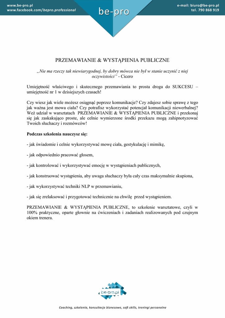 PRZEMAWIANIE & WYSTĄPIENIA PUBLICZNE „Nie ma rzeczy tak niewiarygodnej, by dobry mówca nie był w stanie uczynić z niej oczywistości” - Cicero Umiejętność właściwego i skutecznego przemawiania to prosta droga do SUKCESU – umiejętność nr 1 w dzisiejszych czasach! Czy wiesz jak wiele możesz osiągnąć poprzez komunikacje? Czy zdajesz sobie sprawę z tego jak ważna jest mowa ciała? Czy potrafisz wykorzystać potencjał komunikacji niewerbalnej? Weź udział w warsztatach PRZEMAWIANIE & WYSTĄPIENIA PUBLICZNE i przekonaj się jak zaskakująco proste, ale celnie wymierzone środki przekazu mogą zahipnotyzować Twoich słuchaczy i rozmówców! Podczas szkolenia nauczysz się: - jak świadomie i celnie wykorzystywać mowę ciała, gestykulację i mimikę, - jak odpowiednio pracować głosem, - jak kontrolować i wykorzystywać emocję w wystąpieniach publicznych, - jak konstruować wystąpienia, aby uwaga słuchaczy była cały czas maksymalnie skupiona, - jak wykorzystywać techniki NLP w przemawianiu, - jak się zrelaksować i przygotować technicznie na chwilę przed wystąpieniem. PRZEMAWIANIE & WYSTĄPIENIA PUBLICZNE, to szkolenie warsztatowe, czyli w 100% praktyczne, oparte głownie na ćwiczeniach i zadaniach realizowanych pod czujnym okiem trenera.