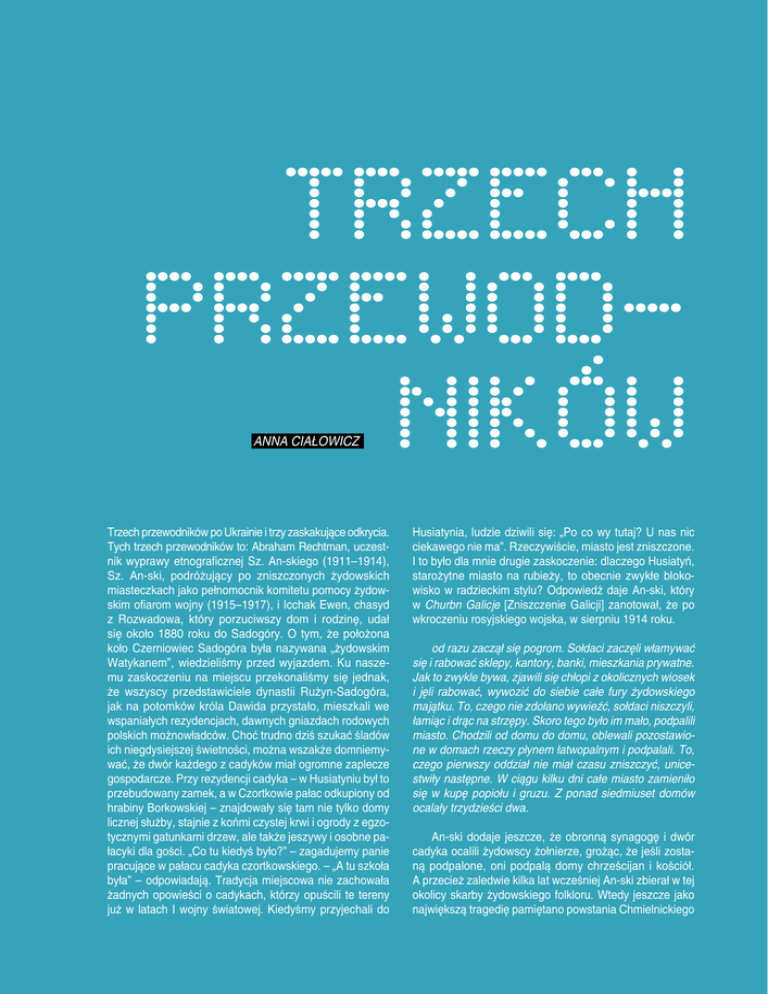 ANNA CIAŁOWICZ Trzech przewodników po Ukrainie i trzy zaskakujące odkrycia. Tych trzech przewodników to: Abraham Rechtman, uczestnik wyprawy etnograficznej Sz. An-skiego (1911–1914), Sz. An-ski, podróżujący po zniszczonych żydowskich miasteczkach jako pełnomocnik komitetu pomocy żydowskim ofiarom wojny (1915–1917), i Icchak Ewen, chasyd z Rozwadowa, który porzuciwszy dom i rodzinę, udał się około 1880 roku do Sadogóry. O tym, że położona koło Czerniowiec Sadogóra była nazywana „żydowskim Watykanem”, wiedzieliśmy przed wyjazdem. Ku naszemu zaskoczeniu na miejscu przekonaliśmy się jednak, że wszyscy przedstawiciele dynastii Rużyn-Sadogóra, jak na potomków króla Dawida przystało, mieszkali we wspaniałych rezydencjach, dawnych gniazdach rodowych polskich możnowładców. Choć trudno dziś szukać śladów ich niegdysiejszej świetności, można wszakże domniemywać, że dwór każdego z cadyków miał ogromne zaplecze gospodarcze. Przy rezydencji cadyka – w Husiatyniu był to przebudowany zamek, a w Czortkowie pałac odkupiony od hrabiny Borkowskiej – znajdowały się tam nie tylko domy licznej służby, stajnie z końmi czystej krwi i ogrody z egzotycznymi gatunkami drzew, ale także jeszywy i osobne pałacyki dla gości. „Co tu kiedyś było?” – zagadujemy panie pracujące w pałacu cadyka czortkowskiego. – „A tu szkoła była” – odpowiadają. Tradycja miejscowa nie zachowała żadnych opowieści o cadykach, którzy opuścili te tereny już w latach I wojny światowej. Kiedyśmy przyjechali do Husiatynia, ludzie dziwili się: „Po co wy tutaj? U nas nic ciekawego nie ma”. Rzeczywiście, miasto jest zniszczone. I to było dla mnie drugie zaskoczenie: dlaczego Husiatyń, starożytne miasto na rubieży, to obecnie zwykłe blokowisko w radzieckim stylu? Odpowiedź daje An-ski, który w Churbn Galicje [Zniszczenie Galicji] zanotował, że po wkroczeniu rosyjskiego wojska, w sierpniu 1914 roku. od razu zaczął się pogrom. Sołdaci zaczęli włamywać się i rabować sklepy, kantory, banki, mieszkania prywatne. Jak to zwykle bywa, zjawili się chłopi z okolicznych wiosek i jęli rabować, wywozić do siebie całe fury żydowskiego majątku. To, czego nie zdołano wywieźć, sołdaci niszczyli, łamiąc i drąc na strzępy. Skoro tego było im mało, podpalili miasto. Chodzili od domu do domu, oblewali pozostawione w domach rzeczy płynem łatwopalnym i podpalali. To, czego pierwszy oddział nie miał czasu zniszczyć, unicestwiły następne. W ciągu kilku dni całe miasto zamieniło się w kupę popiołu i gruzu. Z ponad siedmiuset domów ocalały trzydzieści dwa. An-ski dodaje jeszcze, że obronną synagogę i dwór cadyka ocalili żydowscy żołnierze, grożąc, że jeśli zostaną podpalone, oni podpalą domy chrześcijan i kościół. A przecież zaledwie kilka lat wcześniej An-ski zbierał w tej okolicy skarby żydowskiego folkloru. Wtedy jeszcze jako największą tragedię pamiętano powstania Chmielnickiego 81 KULTURA PROJEKT „DYSKURS PAMIĘCI O KULTURZE CHASYDZKIEJ NA BUKOWINIE” i Iwana Gonty. Myśmy wysłuchali relacji jakże podobnych, lecz odnoszących się do czasów II wojny światowej. Kiedy nagrywaliśmy relacje o przesiedleniach, głodzie, prześladowaniach, mieliśmy wrażenie, że istotnie stąpamy po śladach ekspedycji etnograficznej An-skiego. Nawet i w smutnym sprawozdaniu z wojennej peregrynacji An-ski nie zapomina o wątkach folklorystycznych. Czytamy więc o dwóch listach Baal Szem Towa, ukrytych przez cadyka z Kopyczyniec i cudownie uratowanych przez jednego z jego chasydów. Inny powracający wątek to przechowywana w różnych miejscowościach pamięć o Baal Szem Towie. W Tłustym An-ski zanotował: Może to świadczyć na korzyść teorii, że Baal Szem Tow, twórca chasydyzmu, w ogóle nie istniał. Baal Szem Towów było wielu, a z czasem opowieści o nich zlepiły się w jedną legendę. Pochodzący z Buczacza Szmuel Josef Agnon pisze, że czortkowscy chasydzi w jego mieście w Baal Szem Towa zwyczajnie nie wierzyli. I tu trzecie zaskoczenie: polscy możnowładcy utrzymywali kontakt z różnymi Baal Szemami, a niejaki Grabianka chciał nawet nawracać poddanych na judaizm i ogłosić w swoich włościach powstanie „nowej Jerozolimy”. Ten wątek powinien zainteresować nie tylko badaczy Rękopisu znalezionego w Saragossie... Pewnego razu w wigilię Pesach goje, chcąc oskarżyć Baal Szema o mord rytualny, podrzucili mu zabite dziecko chrześcijańskie. W czasie sederowej wieczerzy goje razem z żołnierzami okrążyli dom. Baal Szem, zauważywszy podrzucone dziecko, ubrał je szybko w żydowskie szatki, na głowę dał myckę i posadził przy stole. Trupek siedział jak żywy. Baal Szem krzyknął na niego: „Bękart! Bujaj się!”, a nieżywe dziecko zaczęło się kolebać nad Hagadą. Goje, wtargnąwszy do domu, szukali wszędzie i nic nie znaleźli. Nie wpadło im, ma się rozumieć, do głowy, że ten chłopczyk, co siedzi przy stole i nad Hagadą się kolebie, jest tym zamordowanym dzieckiem, którego szukają. Potem, jak już odeszli, dziecko znów było martwe i Baal Szem pogrzebał je na podwórku. Projekt „Dyskurs wewnętrznej i zewnętrznej pamięci o kulturze chasydzkiej na Bukowinie” realizuje Fundacja „Zmiana” przy współpracy z czerniowieckim Muzeum Żydów na Bukowinie. Projekt realizowany jest przy wsparciu niemieckiej fundacji "Pamięć, Odpowiedzialność i Przyszłość" oraz Instytutu Historii Stosowanej we Frankfurcie nad Odrą w ramach programu Geschichtswerkstatt Europa. Więcej o projekcie: http://hasidicmemory.net Anna Ciałowicz – etnolożka, edukatorka, redaktorka Biuletynu GWŻ. Autorka książki Wojny chasydów arcyciekawe. Nowy Sącz – Stadogóra 1868–1869.