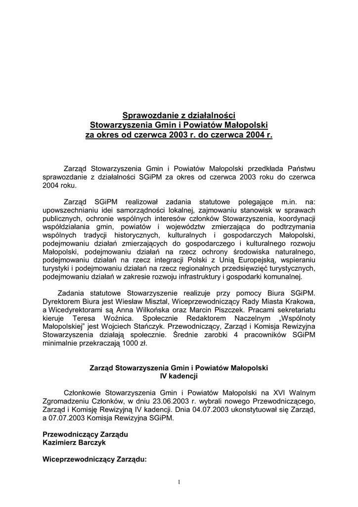 Sprawozdanie z działalności Stowarzyszenia Gmin i Powiatów Małopolski za okres od czerwca 2003 r. do czerwca 2004 r. Zarząd Stowarzyszenia Gmin i Powiatów Małopolski przedkłada Państwu sprawozdanie z działalności SGiPM za okres od czerwca 2003 roku do czerwca 2004 roku. Zarząd SGiPM realizował zadania statutowe polegające m.in. na: upowszechnianiu idei samorządności lokalnej, zajmowaniu stanowisk w sprawach publicznych, ochronie wspólnych interesów członków Stowarzyszenia, koordynacji współdziałania gmin, powiatów i województw zmierzająca do podtrzymania wspólnych tradycji historycznych, kulturalnych i gospodarczych Małopolski, podejmowaniu działań zmierzających do gospodarczego i kulturalnego rozwoju Małopolski, podejmowaniu działań na rzecz ochrony środowiska naturalnego, podejmowaniu działań na rzecz integracji Polski z Unią Europejską, wspieraniu turystyki i podejmowaniu działań na rzecz regionalnych przedsięwzięć turystycznych, podejmowaniu działań w zakresie rozwoju infrastruktury i gospodarki komunalnej. Zadania statutowe Stowarzyszenie realizuje przy pomocy Biura SGiPM. Dyrektorem Biura jest Wiesław Misztal, Wiceprzewodniczący Rady Miasta Krakowa, a Wicedyrektorami są Anna Wilkońska oraz Marcin Piszczek. Pracami sekretariatu kieruje Teresa Woźnica. Społecznie Redaktorem Naczelnym „Wspólnoty Małopolskiej” jest Wojciech Stańczyk. Przewodniczący, Zarząd i Komisja Rewizyjna Stowarzyszenia działają społecznie. Średnie zarobki 4 pracowników SGiPM minimalnie przekraczają 1000 zł. Zarząd Stowarzyszenia Gmin i Powiatów Małopolski IV kadencji Członkowie Stowarzyszenia Gmin i Powiatów Małopolski na XVI Walnym Zgromadzeniu Członków, w dniu 23.06.2003 r. wybrali nowego Przewodniczącego, Zarząd i Komisję Rewizyjną IV kadencji. Dnia 04.07.2003 ukonstytuował się Zarząd, a 07.07.2003 Komisja Rewizyjna SGiPM. Przewodniczący Zarządu Kazimierz Barczyk Wiceprzewodniczący Zarządu: 1 Janusz Sepioł – Marszałek Województwa Małopolskiego – I Wiceprzewodniczący, Mieczysław Bień – Prezydent Tarnowa, Robert Choma – Prezydent Przemyśla (woj. podkarpackie), Kazimierz Fudala - Wójt Rzepiennika Strzyżewskiego, Grzegorz Wawryka – Starosta Brzeski, Członkowie Zarządu: Zofia Bukowiec – Radna Laskowej, Marian Cycoń – Burmistrz Starego Sącza, Marek Fryźlewicz – Burmistrz Nowego Targu, Sekretarz Zarządu, Jan Gładki – Wiceprzewodniczący Rady Miasta Sędziszowa (woj. świętokrzyskie), Skarbnik, Robert Kliś – Wiceprzewodniczący Rady Miasta Żywca (woj. śląskie), Leszek Konarski – Starosta Olkuski, Stanisław Kotarba – Radny Wadowic, Henryk Juszczyk – Zastępca Prezydenta Bielska-Białej (woj. śląskie), Wiesław Misztal – Wiceprzewodniczący Rady Miasta Krakowa, Witold Morawiec – Wójt Olesna, Czesław Orliński – Radny Szczekocin (woj. śląskie), Adam Samborski – Wójt Racławic, Andrzej Saternus – Burmistrz Chełmka, Paweł Zorski – Radny Miasta Krakowa, Komisja Rewizyjna: Przewodnicząca Kazimiera Augustyn – członek Rady Sołeckiej w Sechnej, Członkowie: Jerzy Augustyniak – Przewodniczący Rady Miasta Zatora, Sekretarz Komisji, Kazimierz Olearczyk – Wójt Gminy Bolesław, Zofia Oszacka – Wójt Lanckorony, Stanisław Pankiewicz – Wójt Jasła (woj. podkarpackie), Czesława Rzadkosz – Wójt Łukowicy, Jerzy Szczygieł – Burmistrz Łańcuta (woj. podkarpackie). Komisje w Stowarzyszenia Gmin i Powiatów Małopolski: Komisja Zdrowia, Rodziny i Polityki Społecznej, Komisja Edukacji, Turystyki i Współpracy z zagranicą, Komisja Ochrony Środowiska i Infrastruktury, Komisja Rolnictwa i Rozwoju Obszarów Wiejskich, Komisja Gospodarki Komunalnej, 1. Sprawy organizacyjne SGiPM Stowarzyszenie liczy obecnie 122 członków - gmin i powiatów. Stowarzyszenie stale współpracuje z gminami z obszaru historycznej Małopolski (woj. małopolskie, podkarpackie, świętokrzyskie, część śląskiego i lubelskiego). 2 2. Współpraca z organizacjami samorządowymi i pozarządowymi Istotną rolę w działalności SGiPM odgrywa współpraca ze stowarzyszeniami i związkami gmin i powiatów w ramach Federacji Związków Gmin i Powiatów RP, ogólnopolskiej organizacji samorządowej zrzeszającej swoim działaniem ok. 1000 gmin i powiatów z całej Polski, skupionych w 20 związkach regionalnych. Przewodniczący Stowarzyszenia Kazimierz Barczyk od ośmiu lat pełni również funkcję Przewodniczącego Federacji Związków Gmin i Powiatów RP. Siedzibą Federacji jest Kraków, a biuro FZGiP RP znajduje się przy ul. Mikołajskiej 4 na Małym Rynku. We współpracy z Federacją Stowarzyszenie współorganizowało konferencje, spotkania, kongresy o charakterze ogólnopolskim. Stowarzyszenie współpracuje z Fundacją Rozwoju Samorządności i Prasy Lokalnej, szczególnie w zakresie działalności wydawniczej. Stowarzyszenie Gmin i Powiatów Małopolski wraz z Federacją Związków Gmin i Powiatów RP powołało agendę ds. integracji z Unią Europejską, jaką jest Małopolskie Regionalne Centrum Informacji Europejskiej. Stowarzyszenie współpatronuje działalności jedynego w świecie Muzeum Armii Krajowej w Krakowie, którego organizatorami są samorządy Miasta Krakowa i Województwa Małopolskiego. Przewodniczący Kazimierz Barczyk społecznie pełni funkcję Przewodniczącego Rady Muzeum Armii Krajowej, a Maciej Korkuć, Dyrektor Biura Federacji jest członkiem Rady Muzeum AK. 3. Konferencje, Spotkania, Seminaria, 23 czerwca 2003 XVI Walne Zgromadzenie Delegatów SGiPM z udziałem i wykładem Ministra Jana Kułakowskiego, Człowieka Roku 2002 Federacji Związków Gmin i Powiatów RP pt. „Jaka Polska – jak być w Unii Europejskiej”. Walne poprzedziła Msza Święta odprawiona przez Ks. Kardynała Franciszka Macharskiego w Kaplicy Arcybiskupów Krakowskich – Kuria Metropolitalna przy ul. Franciszkańskiej 3. Miejsce: Sala Obrad Rady Miasta Krakowa, Uczestnicy: 150 os