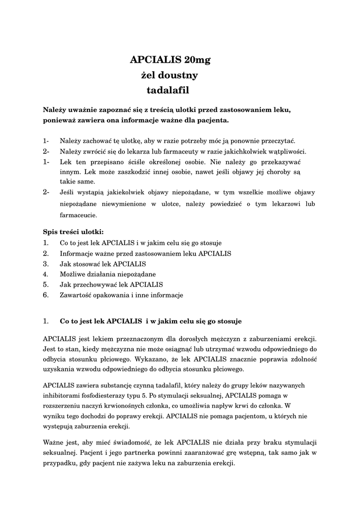APCIALIS 20mg żel doustny tadalafil Należy uważnie zapoznać się z treścią ulotki przed zastosowaniem leku, ponieważ zawiera ona informacje ważne dla pacjenta. 1 Należy zachować tę ulotkę, aby w razie potrzeby móc ją ponownie przeczytać. 2 1 Należy zwrócić się do lekarza lub farmaceuty w razie jakichkolwiek wątpliwości. 2 Jeśli wystąpią jakiekolwiek objawy niepożądane, w tym wszelkie możliwe objawy Lek ten przepisano ściśle określonej osobie. Nie należy go przekazywać innym. Lek może zaszkodzić innej osobie, nawet jeśli objawy jej choroby są takie same. niepożądane niewymienione w ulotce, należy powiedzieć o tym lekarzowi lub farmaceucie. Spis treści ulotki: 1. 2. 3. Co to jest lek APCIALIS i w jakim celu się go stosuje 5. 6. Jak przechowywać lek APCIALIS 4. 1. Informacje ważne przed zastosowaniem leku APCIALIS Jak stosować lek APCIALIS Możliwe działania niepożądane Zawartość opakowania i inne informacje Co to jest lek APCIALIS i w jakim celu się go stosuje APCIALIS jest lekiem przeznaczonym dla dorosłych mężczyzn z zaburzeniami erekcji. Jest to stan, kiedy mężczyzna nie może osiągnąć lub utrzymać wzwodu odpowiedniego do odbycia stosunku płciowego. Wykazano, że lek APCIALIS znacznie poprawia zdolność uzyskania wzwodu odpowiedniego do odbycia stosunku płciowego. APCIALIS zawiera substancję czynną tadalafil, który należy do grupy leków nazywanych inhibitorami fosfodiesterazy typu 5. Po stymulacji seksualnej, APCIALIS pomaga w rozszerzeniu naczyń krwionośnych członka, co umożliwia napływ krwi do członka. W wyniku tego dochodzi do poprawy erekcji. APCIALIS nie pomaga pacjentom, u których nie występują zaburzenia erekcji. Ważne jest, aby mieć świadomość, że lek APCIALIS nie działa przy braku stymulacji seksualnej. Pacjent i jego partnerka powinni zaaranżować grę wstępną, tak samo jak w przypadku, gdy pacjent nie zażywa leku na zaburzenia erekcji. 2. Informacje ważne przed zastosowaniem leku APCIALIS Kiedy nie stosować leku APCIALIS jeśli pacjent ma uczulenie na tadalafil lub którykolwiek z pozostałych składników tego leku 1 jeśli pacjent przyjmuje azotany organiczne w jakiejkolwiek postaci lub inne donory tlenku azotu, np. azotyn amylu. Jest to grupa leków („azotany”) stosowanych w leczeniu dławicy piersiowej („ból w klatce piersiowej”). Wykazano, że lek APCIALIS nasila działanie tych leków. Jeżeli pacjent zażywa azotany w jakiejkolwiek postaci lub nie jest tego pewien, powinien poinformować o tym lekarza. 2 jeśli u pacjenta występuje ciężka choroba serca lub pacjent przebył ostatnio zawał serca. 3 4 jeśli pacjent przebył niedawno udar. Jeżeli u pacjenta występuje niskie ciśnienie krwi lub niekontrolowane wysokie ciśnienie krwi. Ostrzeżenia i środki ostrożności Przed rozpoczęciem stosowania leku APCIALIS należy zwrócić się do lekarza. Należy pamiętać, że aktywność seksualna łączy się z pewnym ryzykiem u pacjentów z chorobami serca, ponieważ stanowi ona dodatkowe obciążenie dla serca. W przypadku występowania problemów z sercem należy poinformować o tym lekarza. Poniżej wymieniono kilka innych przyczyn, z powodu których nie można zastosować leku APCIALIS u pacjenta. Pacjent przed przyjęciem leku powinien poinformować lekarza, jeżeli występuje którykolwiek z poniższych przypadków: 1 niedokrwistość sierpowatokrwinkowa (nieprawidłowy kształt czerwonych krwinek), szpiczak mnogi (nowotwór szpiku kostnego), białaczka (nowotwór komórek krwi), jakiekolwiek zniekształcenie członka, 2 ciężkie choroby wątroby, ciężkie choroby nerek. 3 Nie wiadomo, czy lek APCIALIS jest skuteczny u pacjentów po przebytych zabiegach chirurgicznych w obrębie miednicy lub po radykalnej prostatektomii bez oszczędzania nerwów. Jeśli wystąpi nagłe pogorszenie widzenia lub nagła utrata wzroku, należy przerwać stosowanie leku APCIALIS i niezwłocznie skontaktować się z lekarzem. APCIALIS nie jest przeznaczony do stosowania u kobiet. Dzieci i młodzież APCIALIS nie jest przeznaczony do stosowania u dzieci i młodzieży w wieku poniżej 18 lat. Inne leki i APCIALIS Należy powiedzieć lekarzowi o wszystkich lekach przyjmowanych obecnie lub ostatnio a także o lekach, które pacjent planuje przyjmować. Nie wolno przyjmować leku APCIALIS w przypadku stosowania azotanów. APCIALIS może wpływać na działanie niektórych leków lub inne leki mogą wpływać na działanie leku APCIALIS. Należy powiedzieć lekarzowi lub farmaceucie, jeśli przyjmuje się następujące leki: 1 2 3 4 5 leki blokujące receptory αadrenergiczne (czasami stosowane w leczeniu wysokiego ciśnienia tętniczego krwi i przerostu gruczołu krokowego). inne leki stosowane w leczeniu wysokiego ciśnienia tętniczego krwi. leki, takie jak ketokonazol (stosowany w leczeniu zakażeń grzybiczych) lub inhibitory proteazy stosowane w leczeniu AIDS lub zakażeń wirusem HIV. fenobarbital, fenytoina i karbamazepina (leki przeciwdrgawkowe). ryfampicyna, erytromycyna , klarytromycyna lub itrakonazol. Nie wolno stosować leku APCIALIS jednocześnie z innymi metodami leczenia zaburzeń erekcji. APCIALIS z piciem i alkoholem Informacje dotyczące wpływu alkoholu podane są w punkcie 3. Sok grejpfrutowy może wpływać na skuteczność leku APCIALIS i dlatego spożywając go należy zachować ostrożność. Aby uzyskać więcej informacji należy zwrócić się do lekarza. Płodność Kiedy podawano lek psom, nastąpiło u nich zmniejszenie wytwarzania plemników w jądrach. Zmniejszenie stężenia plemników obserwowano u niektórych mężczyzn. Jest mało prawdopodobne by prowadziło to do bezpłodności. Prowadzenie pojazdów i obsługiwanie maszyn U niektórych mężczyzn zażywających lek APCIALIS podczas badań klinicznych zgłaszano występowanie zawrotów głowy, dlatego należy poznać swoją reakcję na lek, przed podjęciem decyzji o prowadzeniu samochodu lub obsługiw