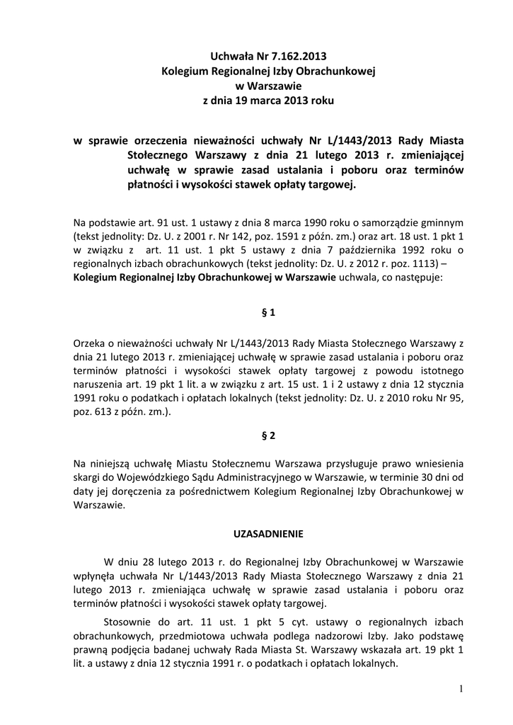 Uchwała Nr 7.162.2013 Kolegium Regionalnej Izby Obrachunkowej w Warszawie z dnia 19 marca 2013 roku w sprawie orzeczenia nieważności uchwały Nr L/1443/2013 Rady Miasta Stołecznego Warszawy z dnia 21 lutego 2013 r. zmieniającej uchwałę w sprawie zasad ustalania i poboru oraz terminów płatności i wysokości stawek opłaty targowej. Na podstawie art. 91 ust. 1 ustawy z dnia 8 marca 1990 roku o samorządzie gminnym (tekst jednolity: Dz. U. z 2001 r. Nr 142, poz. 1591 z późn. zm.) oraz art. 18 ust. 1 pkt 1 w związku z art. 11 ust. 1 pkt 5 ustawy z dnia 7 października 1992 roku o regionalnych izbach obrachunkowych (tekst jednolity: Dz. U. z 2012 r. poz. 1113) – Kolegium Regionalnej Izby Obrachunkowej w Warszawie uchwala, co następuje: §1 Orzeka o nieważności uchwały Nr L/1443/2013 Rady Miasta Stołecznego Warszawy z dnia 21 lutego 2013 r. zmieniającej uchwałę w sprawie zasad ustalania i poboru oraz terminów płatności i wysokości stawek opłaty targowej z powodu istotnego naruszenia art. 19 pkt 1 lit. a w związku z art. 15 ust. 1 i 2 ustawy z dnia 12 stycznia 1991 roku o podatkach i opłatach lokalnych (tekst jednolity: Dz. U. z 2010 roku Nr 95, poz. 613 z późn. zm.). §2 Na niniejszą uchwałę Miastu Stołecznemu Warszawa przysługuje prawo wniesienia skargi do Wojewódzkiego Sądu Administracyjnego w Warszawie, w terminie 30 dni od daty jej doręczenia za pośrednictwem Kolegium Regionalnej Izby Obrachunkowej w Warszawie. UZASADNIENIE W dniu 28 lutego 2013 r. do Regionalnej Izby Obrachunkowej w Warszawie wpłynęła uchwała Nr L/1443/2013 Rady Miasta Stołecznego Warszawy z dnia 21 lutego 2013 r. zmieniająca uchwałę w sprawie zasad ustalania i poboru oraz terminów płatności i wysokości stawek opłaty targowej. Stosownie do art. 11 ust. 1 pkt 5 cyt. ustawy o regionalnych izbach obrachunkowych, przedmiotowa uchwała podlega nadzorowi Izby. Jako podstawę prawną podjęcia badanej uchwały Rada Miasta St. Warszawy wskazała art. 19 pkt 1 lit. a ustawy z dnia 12 stycznia 1991 r. o podatkach i opłatach lokalnych. 1 Badając ww. uchwałę, Kolegium Izby ustaliło, co następuje: Rada Miasta Stołecznego Warszawy zmieniła postanowienia uchwały Nr LII/1600/2009 z dnia 16 kwietnia 2009 r. w sprawie zasad ustalania i poboru oraz terminów płatności i wysokości stawek opłaty targowej m.in., w ten sposób, że w § 5 dodała pkt 5 w brzmieniu cyt.: „5) targowisk jednodniowych – rozumie się przez to targowiska wyznaczone na podstawie uchwał zarządów dzielnic m.st. Warszawy i działające na podstawie nadanych im przez te zarządy regulaminów – w czasie ich funkcjonowania w określonych w regulaminie dniach i godzinach otwarcia” oraz nadała nowe brzmienie załącznikowi Nr 1 do uchwały pn. „Dzienne stawki opłaty targowej na terenie m. st. Warszawy” ustalając w pkt 1 lit. b i c, pkt 2 lit. b i c oraz pkt 3 lit. b i c dzienne stawki przy sprzedaży: a) kwiatów, wieńców, zniczy, świec, grysu w odległości do 500 m od granic cmentarzy; b) kwiatów ciętych”. Kolegium Regionalnej Izby Obrachunkowej w Warszawie zważyło, co następuje: Rada Miasta Stołecznego Warszawy poprzez wprowadzenie w § 5 pkt 5 uchwały definicji „targowiska jednodniowego” przyjęła odmienną niż w ustawie o podatkach i opłatach lokalnych definicję „targowiska” oraz uczyniła to bez delegacji ustawowej. Definicja „targowiska” sformułowana została przez ustawodawcę w art. 15 ust. 2 i 2b ustawy o podatkach i opłatach lokalnych. Stosownie do art. 15 ust. 2 ustawy o podatkach i opłatach lokalnych za „targowiska” uważa się wszelkie miejsca, w których jest prowadzona sprzedaż z wyjątkiem budynków lub ich części (art. 15 ust. 2b). Przepisy te nie przewidują kompetencji dla rad gmin na mocy których byłyby one upoważnione do konstruowania definicji legalnych targowiska. Kompetencje uchwałodawcze rad gmin zostały określone w art. 19 ustawy o podatkach i opłatach lokalnych. W myśl pkt 1 tego przepisu Rada gminy w drodze uchwały określa zasady ustalania i poboru oraz terminów płatności i wysokości stawek opłat określonych w ustawie, a z mocy pkt 2 rada gminy może zarządzić pobór tych opłat w drodze inkasa oraz określić inkasentów i wysokości wynagrodzenia za inkaso. Przez zasady ustalania i poboru opłaty targowej pozostawione do kompetencji rad gmin, należy rozumieć konieczność uregulowania w uchwałach tych elementów konstrukcyjnych opłat, które nie zostały uregulowane w ustawie, a które wynikają z delegacji ustawowej. Stosownie do art. 94 Konstytucji RP organy samorządu terytorialnego oraz terenowe organy administracji rządowej, na podstawie i w granicach upoważnień zawartych w ustawie, stanowią akty prawa miejscowego obowiązujące na obszarze działania tych organów. Zasady i tryb wydawania aktów prawa miejscowego określa ustawa. Wskazuje na to jednoznacznie przepis art. 40 ust. 1 ustawy z dnia 8 marca 1990 roku o samorządzie gminnym (Dz. U. z 2001 r. Nr 142, poz. 1591 ze zm.), który stanowi, że na podstawie 2 upoważnień ustawowych gminie przysługuje prawo stanowienia aktów prawa miejscowego obowiązujących na obszarze gminy. Taki charakter ma przytoczony w podstawie prawnej badanej uchwały art. 19 ust. 1 lit.a ustawy o podatkach i opłatach lokalnych, który nie przewiduje dla rady upoważnienia do określania definicji normatywnej „targowiska”. Postanowienie zawarte w załączniku do badanej uchwały w części dotyczącej ustalenia stawek opłaty targowej od sprzedaży: a) kwiatów, wieńców, zniczy, świec, grysu w odległości do 500 m od granic cmentarzy przy jednoczesnym wyłączeniu tych artykułów z pkt 1a, 2a i 3a załącznika do uchwały powoduje, że sprzedaż tych artykułów w odległości powyżej 500 m od cmentarza nie zostanie objęta opłatą targową, co narusza wprost przepis art. 15 ust. 1 i 2 ustawy o podatkach i opłatach lokalnych, w myśl którego opłat