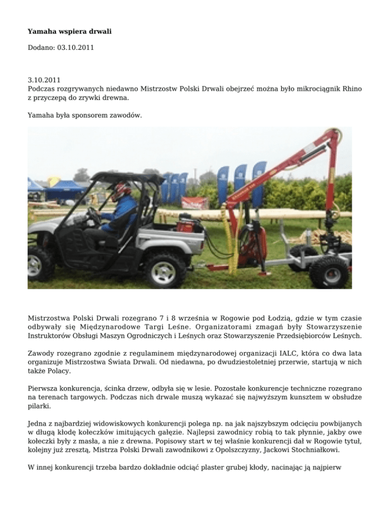 Yamaha wspiera drwali Dodano: 03.10.2011 3.10.2011 Podczas rozgrywanych niedawno Mistrzostw Polski Drwali obejrzeć można było mikrociągnik Rhino z przyczepą do zrywki drewna. Yamaha była sponsorem zawodów. Mistrzostwa Polski Drwali rozegrano 7 i 8 września w Rogowie pod Łodzią, gdzie w tym czasie odbywały się Międzynarodowe Targi Leśne. Organizatorami zmagań były Stowarzyszenie Instruktorów Obsługi Maszyn Ogrodniczych i Leśnych oraz Stowarzyszenie Przedsiębiorców Leśnych. Zawody rozegrano zgodnie z regulaminem międzynarodowej organizacji IALC, która co dwa lata organizuje Mistrzostwa Świata Drwali. Od niedawna, po dwudziestoletniej przerwie, startują w nich także Polacy. Pierwsza konkurencja, ścinka drzew, odbyła się w lesie. Pozostałe konkurencje techniczne rozegrano na terenach targowych. Podczas nich drwale muszą wykazać się najwyższym kunsztem w obsłudze pilarki. Jedna z najbardziej widowiskowych konkurencji polega np. na jak najszybszym odcięciu powbijanych w długą kłodę kołeczków imitujących gałęzie. Najlepsi zawodnicy robią to tak płynnie, jakby owe kołeczki były z masła, a nie z drewna. Popisowy start w tej właśnie konkurencji dał w Rogowie tytuł, kolejny już zresztą, Mistrza Polski Drwali zawodnikowi z Opolszczyzny, Jackowi Stochniałkowi. W innej konkurencji trzeba bardzo dokładnie odciąć plaster grubej kłody, nacinając ją najpierw z dołu, a kończąc cięciem z góry. Oba cięcia muszą się ze sobą dokładnie zejść w środku kłody. Yamaha, która była sponsorem tegorocznej edycji Mistrzostw Polski Drwali udostępniła organizatorom zmagań mikrociągnik Rhino wraz z przyczepą do przewozu drewna. Maszyna była cały czas w gotowości, by wspomóc obsługę zawodów podczas przewożenia kłód wykorzystywanych w kilku konkurencjach. Yamaha Rhino to dwuosobowy czterokołowiec. Wyglądem przypomina auto, ma klatkę bezpieczeństwa z dachem i drzwiami. Dach w Rogowie przydał się szczególnie, niemal przez cały drugi dzień zawodów padało. Skrzynia ładunkowa Rhino ma nośność 181 kg, drwal zmieści tu pilarkę z materiałami pędnymi, siekierę, kliny i inne narzędzia potrzebne do pracy w lesie. Maszyna ma bezstopniową przekładnię, napęd 4x4 i blokadę przedniego dyferencjału. Zarówno z przodu, jak i z tyłu zastosowano niezależny, dwuramienny układ zawieszenia z możliwością regulacji w pięciu pozycjach. Pracują tu także podwójne hydrauliczne tarczowe hamulce. Na targach mikrociągnik miał doczepioną przyczepę do zrywki z żurawiem długości 3,3 m. Goście targów i widzowie mistrzostw z wielkim zainteresowaniem przyglądali się mikrociągnikowi Yamahy. Wielu w pierwszej chwili widziało w nim tylko quada, który daje wielką przyjemność z jazdy. Dopiero gdy dowiadywali się, że Rhino można homologować jako ciągnik rolniczy uświadamiali sobie, jak bardzo pomocny może być podczas pracy w lesie. Niskociśnieniowe opony sprawiają, że maszyna doskonale porusza się nawet w bardzo trudnym, grząskim terenie. Ciśnienie zaledwie 0,25 bara w każdej oponie sprawia, że czterokołowiec wyjeżdża z każdego błota. Do poruszania się mikrociągnikiem Rhino homologowanym jako ciągnik rolniczy wystarczy prawo jazdy kategorii T. Maszyna jest w pełni przystosowana do poruszania się po drogach publicznych. firmylesne.pl tekst i zdjęcia: Yamaha Komentarze (0) Nie dodano jeszcze żadnego komentarza.