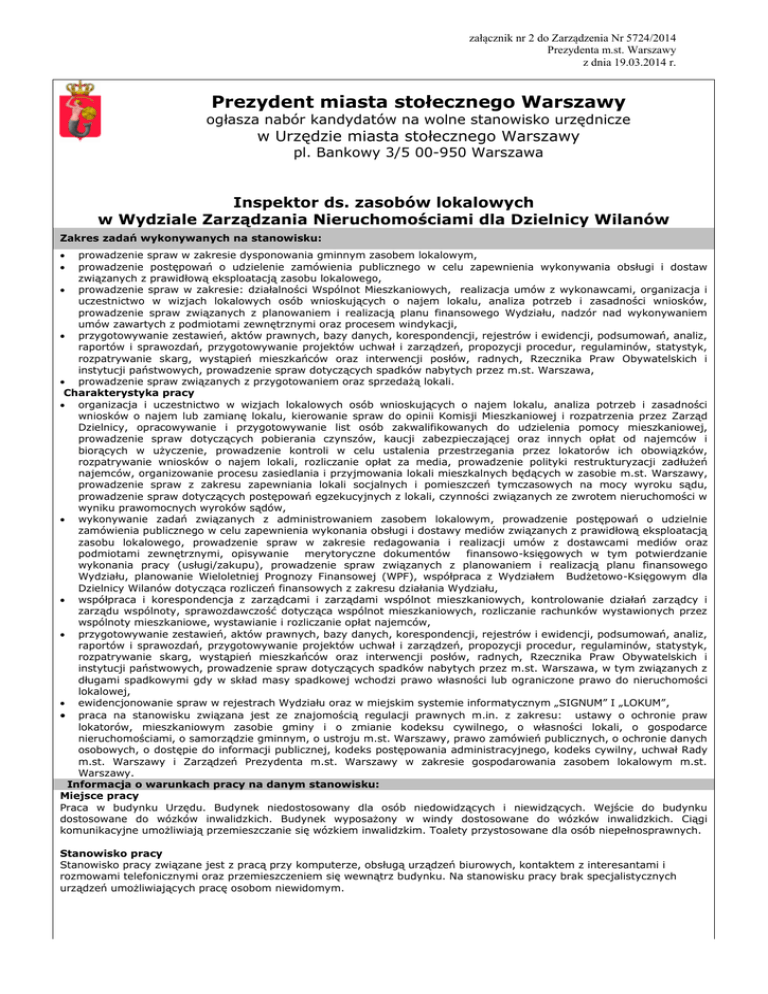 załącznik nr 2 do Zarządzenia Nr 5724/2014 Prezydenta m.st. Warszawy z dnia 19.03.2014 r. Prezydent miasta stołecznego Warszawy ogłasza nabór kandydatów na wolne stanowisko urzędnicze w Urzędzie miasta stołecznego Warszawy pl. Bankowy 3/5 00-950 Warszawa Inspektor ds. zasobów lokalowych w Wydziale Zarządzania Nieruchomościami dla Dzielnicy Wilanów Zakres zadań wykonywanych na stanowisku: prowadzenie spraw w zakresie dysponowania gminnym zasobem lokalowym, prowadzenie postępowań o udzielenie zamówienia publicznego w celu zapewnienia wykonywania obsługi i dostaw związanych z prawidłową eksploatacją zasobu lokalowego, prowadzenie spraw w zakresie: działalności Wspólnot Mieszkaniowych, realizacja umów z wykonawcami, organizacja i uczestnictwo w wizjach lokalowych osób wnioskujących o najem lokalu, analiza potrzeb i zasadności wniosków, prowadzenie spraw związanych z planowaniem i realizacją planu finansowego Wydziału, nadzór nad wykonywaniem umów zawartych z podmiotami zewnętrznymi oraz procesem windykacji, przygotowywanie zestawień, aktów prawnych, bazy danych, korespondencji, rejestrów i ewidencji, podsumowań, analiz, raportów i sprawozdań, przygotowywanie projektów uchwał i zarządzeń, propozycji procedur, regulaminów, statystyk, rozpatrywanie skarg, wystąpień mieszkańców oraz interwencji posłów, radnych, Rzecznika Praw Obywatelskich i instytucji państwowych, prowadzenie spraw dotyczących spadków nabytych przez m.st. Warszawa, prowadzenie spraw związanych z przygotowaniem oraz sprzedażą lokali. Charakterystyka pracy organizacja i uczestnictwo w wizjach lokalowych osób wnioskujących o najem lokalu, analiza potrzeb i zasadności wniosków o najem lub zamianę lokalu, kierowanie spraw do opinii Komisji Mieszkaniowej i rozpatrzenia przez Zarząd Dzielnicy, opracowywanie i przygotowywanie list osób zakwalifikowanych do udzielenia pomocy mieszkaniowej, prowadzenie spraw dotyczących pobierania czynszów, kaucji zabezpieczającej oraz innych opłat od najemców i biorących w użyczenie, prowadzenie kontroli w celu ustalenia przestrzegania przez lokatorów ich obowiązków, rozpatrywanie wniosków o najem lokali, rozliczanie opłat za media, prowadzenie polityki restrukturyzacji zadłużeń najemców, organizowanie procesu zasiedlania i przyjmowania lokali mieszkalnych będących w zasobie m.st. Warszawy, prowadzenie spraw z zakresu zapewniania lokali socjalnych i pomieszczeń tymczasowych na mocy wyroku sądu, prowadzenie spraw dotyczących postępowań egzekucyjnych z lokali, czynności związanych ze zwrotem nieruchomości w wyniku prawomocnych wyroków sądów, wykonywanie zadań związanych z administrowaniem zasobem lokalowym, prowadzenie postępowań o udzielnie zamówienia publicznego w celu zapewnienia wykonania obsługi i dostawy mediów związanych z prawidłową eksploatacją zasobu lokalowego, prowadzenie spraw w zakresie redagowania i realizacji umów z dostawcami mediów oraz podmiotami zewnętrznymi, opisywanie merytoryczne dokumentów finansowo-księgowych w tym potwierdzanie wykonania pracy (usługi/zakupu), prowadzenie spraw związanych z planowaniem i realizacją planu finansowego Wydziału, planowanie Wieloletniej Prognozy Finansowej (WPF), współpraca z Wydziałem Budżetowo-Księgowym dla Dzielnicy Wilanów dotycząca rozliczeń finansowych z zakresu działania Wydziału, współpraca i korespondencja z zarządcami i zarządami wspólnot mieszkaniowych, kontrolowanie działań zarządcy i zarządu wspólnoty, sprawozdawczość dotycząca wspólnot mieszkaniowych, rozliczanie rachunków wystawionych przez wspólnoty mieszkaniowe, wystawianie i rozliczanie opłat najemców, przygotowywanie zestawień, aktów prawnych, bazy danych, korespondencji, rejestrów i ewidencji, podsumowań, analiz, raportów i sprawozdań, przygotowywanie projektów uchwał i zarządzeń, propozycji procedur, regulaminów, statystyk, rozpatrywanie skarg, wystąpień mieszkańców oraz interwencji posłów, radnych, Rzecznika Praw Obywatelskich i instytucji państwowych, prowadzenie spraw dotyczących spadków nabytych przez m.st. Warszawa, w tym związanych z długami spadkowymi gdy w skład masy spadkowej wchodzi prawo własności lub ograniczone prawo do nieruchomości lokalowej, ewidencjonowanie spraw w rejestrach Wydziału oraz w miejskim systemie informatycznym „SIGNUM” I „LOKUM”, praca na stanowisku związana jest ze znajomością regulacji prawnych m.in. z zakresu: ustawy o ochronie praw lokatorów, mieszkaniowym zasobie gminy i o zmianie kodeksu cywilnego, o własności lokali, o gospodarce nieruchomościami, o samorządzie gminnym, o ustroju m.st. Warszawy, prawo zamówień publicznych, o ochronie danych osobowych, o dostępie do informacji publicznej, kodeks postępowania administracyjnego, kodeks cywilny, uchwał Rady m.st. Warszawy i Zarządzeń Prezydenta m.st. Warszawy w zakresie gospodarowania zasobem lokalowym m.st. Warszawy. Informacja o warunkach pracy na danym stanowisku: Miejsce pracy Praca w budynku Urzędu. Budynek niedostosowany dla osób niedowidzących i niewidzących. Wejście do budynku dostosowane do wózków inwalidzkich. Budynek wyposażony w windy dostosowane do wózków inwalidzkich. Ciągi komunikacyjne umożliwiają przemieszczanie się wózkiem inwalidzkim. Toalety przystosowane dla osób niepełnosprawnych. Stanowisko pracy Stanowisko pracy związane jest z pracą przy komputerze, obsługą urządzeń biurowych, kontaktem z interesantami i rozmowami telefonicznymi oraz przemieszczeniem się wewnątrz budynku. Na stanowisku pracy brak specjalistycznych urządzeń umożliwiających pracę osobom niewidomym. Wymagania niezbędne: obywatelstwo polskie (o stanowisko mogą ubiegać się również osoby nie posiadające obywatelstwa polskiego zgodnie z art. 11 ust. 2 i 3 ustawy z dnia 21 listopada 2008 r. o pracownikach samorządowych (Dz. U. Nr 223, poz. 1458 z późn. zm.) 1 , pełna zdolność do c