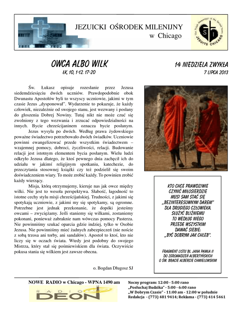 JEZUICKI OŚRODEK MILENIJNY w Chicago owca albo wilk 14 niedziela zwykła Łk, 10, 1-12. 17-20 7 lipca 2013 Św. Łukasz opisuje rozesłanie przez Jezusa siedemdziesięciu dwóch uczniów. Prawdopodobnie obok Dwunastu Apostołów byli to wszyscy uczniowie, jakimi w tym czasie Jezus „dysponował”. Wydarzenie to pokazuje, że każdy człowiek, niezależnie od swojego stanu, jest wezwany i posłany do głoszenia Dobrej Nowiny. Tutaj nikt nie może czuć się zwolniony z tego wezwania i zrzucać odpowiedzialności na innych. Bycie chrześcijaninem oznacza bycie posłanym. Jezus wysyła po dwóch. Według prawa żydowskiego poważne świadectwo potrzebowało dwóch świadków. Uczniowie powinni ewangelizować przede wszystkim świadectwem – wzajemnej pomocy, dobroci, życzliwości, relacji. Budowanie relacji jest istotnym elementem bycia posłanym. Wielu ludzi odkryło Jezusa dlatego, że ktoś pewnego dnia zachęcił ich do udziału w jakimś religijnym spotkaniu, katechezie, do przeczytania stosownej książki czy też podzielił się swoim doświadczeniem wiary. To może zrobić każdy. To powinien zrobić każdy wierzący. Misja, którą otrzymujemy, kieruje nas jak owce między wilki. Nie jest to wesoła perspektywa. Słabość, łagodność to istotne cechy stylu misji chrześcijańskiej. Trudności, z jakimi się spotykają uczniowie, z jakimi my się spotykamy, są ogromne. Potrzebne jest jednak przekonanie, że dopóki jesteśmy owcami – zwyciężamy. Jeśli staniemy się wilkami, zostaniemy pokonani, ponieważ zabraknie nam wówczas pomocy Pasterza. Nie powinniśmy szukać oparcia gdzie indziej, tylko w Osobie Jezusa. Nie powinniśmy mieć żadnych zabezpieczeń (nie noście z sobą trzosa ani torby, ani sandałów). Apostoł to ktoś, kto nie liczy się w oczach świata. Wtedy jest podobny do swojego Mistrza, który stał się pośmiewiskiem dla świata. Oczywiście pokusa stania się wilkiem jest zawsze obecna. kto chce prawdziwie czynić miłosierdzie musi sam stać się ,,bezinteresownym darem" dla drugiego człowieka. Służyć bliźniemu to według niego przede wszystkim dawać siebie: ,,być dobrym jak chleb". Fragment Listu bł. Jana pawła ii do Zgromadzeń Albertyńskich o Św. bracie albercie chmielowskim o. Bogdan Długosz SJ NOWE RADIO w Chicago - WPNA 1490 am Nocny program: 12:00 - 5:00 rano ,,Posłuchaj Budzika” - 5:00 - 6:00 rano ,,W Dobrym Czasie” - 11:00 am - 12:00 w południe Redakcja - (773) 481 9414; Reklama - (773) 414 5461 PORZĄDEKMSZYŚWIĘTYCH Poniedziałek - pi¹tek: 8:00, 18:00, 19:00 (radiowa: WCEV 1450) I piątek miesiąca: 8:00, 19:00, 20:30 Środa: 19:00 - nowenna do Matki Bożej Nieustającej Pomocy Sobota: 8:00, tylko w I sobotę miesiąca o 17:00 dla chorych, 19:00 Niedziela: 8:00 (radiowa), 9:30, 11:00, 13:00, 19:00, 20:30 -=- SpowiedŸ św.: od poniedziałku do soboty - 7:30 i 18:30, w niedzielę - pó³ godziny przed ka¿d¹ Msz¹ Œwiêt¹, w1. pi¹tek miesi¹ca - od 18:30 do 21:00 AdoracjaNajświętszegoSakramentu - od poniedziałku do czwartku - od 18:30do19:00 sobota - od 18:00do19:00 Sanktuarium Najświętszego Serca Pana Jezusa Jezuicki Ośrodek Milenijny 5835 W. Irving Park Rd.; Chicago, IL 60634, Tel. 773 777 7000; fax 773 427 0126 www.jezuici.org e-mail: [email protected] Audycje Radia DEON: Redakcja tel. 773 481 9414; Reklama tel. 773 414 5461 fax 773 283 2425 Biuro czynne: od poniedziałku do piątku: 8:30 - 9:00, 15:30 - 20:30 sobota: 9:30 - 20:30, niedziela: 8:30 - 14:30, 18:30 - 21:30 Biblioteka czynna: sobota: 18:00 - 19:00; niedziela: 10:30 - 14:30; 19:00 - 21:00 Kawiarenka czynna: niedz.: 10:00 - 15:00, 19:00 - 22:30 Sacred Heart Mission House 4105 N. Avers Ave., Chicago, IL 60618 Tel. 773 588 74 76; fax 773 588 65 17 Rektor Sanktuarium i Przełożony Jezuitów o. Stanisław Czarnecki, SJ (773-588-7476 - ext. 224) o. Józef Birecki, SJ (773-777-7000 - ext. 121) o. Mirosław Bożek, SJ (773-588-7476 - ext. 234) o. Jerzy Karpiński, SJ (773-588-7476 - ext. 237) o. Piotr Kochanowicz, SJ (773-588-7476 - ext. 227) br. Adam Poręba, SJ (773-777-7000 - ext. 122) Wszelkie ofiary i donacje prosimy kierowaæ na adres Sanktuarium. Donacje s¹ wolne od podatku i mo¿na je odpisywaæ przy rozliczeniu z IRS. TRANSMISJE RADIOWE I INTERNETOWE w ciągu tygodnia (od poniedziałku do piątku): godz. 19-20, Radio WCEV 1450 (www.wcev1450.com) w niedziele: godz 8-9, Radio WCEV 1450, oraz Polskie Radio Chicago 1030 WNVR (www.polskieradio.com) Codziennie przez całą dobę: Kamera internetowa z Sanktuarium (obraz i dźwięk; używać Internet Explorer): www.jezuici.org - link „Transmisje na żywo” – wpisać jako użytkownik i hasło: 5835 INTENCJE MSZY ŚWIĘTYCH Niedziela,7VII2013 8:00 9:30 11:00 13:00 za Dobroczyńców Jezuickiego Ośrodka Zbiorowa + Łukasz Barabasz + generał Władysław Sikorski, + generał Władysław Anders 19:00 Zbiorowa 20:30 + Klaudia Brdej Poniedziałek,8VII-św. Jana z Dukli 8:00 + + Władysław i Bronisława 18:00 + Tadeusz Poręcki, z prośbą o Miłosierdzie 19:00 Zbiorowa Wtorek,9VII-śś. Męczenników Leona Mangina i towarzyszy 8:00 + Teofil 18:00 + Andrzej Broniec w 1. rocznicę śmierci 19:00 Zbiorowa Środa,10VII 8:00 za Dobroczyńców Jezuickiego Ośrodka Milenijnego 18:00 o błogosławieństwo Boże, dary Ducha Św. dla Lucjana i Teresy Pukszta z rodziną 19:00 Zbiorowa Czwartek,11VII 8:00 o błogosławieństwo Boże, zdrowie i potrzebne łaski dla wnuczki Martyny z okazji urodzin 18:00 + + rodzice Klemens i Anna 19:00 Zbiorowa Piątek,12VII 8:00 o łaskę Miłosierdzia dla Sylwii Krawiec 18:00 + Stanisław Sarna, dziękczynna za otrzymane łaski z prośbą o dalsze Boże błogosławieństwo dla Sebastiana 19:00 Zbiorowa Sobota,13VII-śś. pustelników Andrzeja Świerada i Benedykta 8:00 + Jan Schab w 22. rocznicę śmierci 19:00 Zbiorowa Od poniedziałku do soboty wznawiamy adorację Najświętszego Sakramentu, po Mszy Św. o godz. 18:00 Słuchaj! RadioDeon.com - WPNA 1490 AM - pon.-pt. 12:00 -