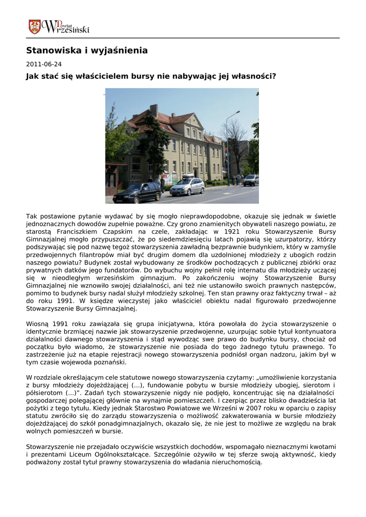 Stanowiska i wyjaśnienia 2011-06-24 Jak stać się właścicielem bursy nie nabywając jej własności? Tak postawione pytanie wydawać by się mogło nieprawdopodobne, okazuje się jednak w świetle jednoznacznych dowodów zupełnie poważne. Czy grono znamienitych obywateli naszego powiatu, ze starostą Franciszkiem Czapskim na czele, zakładając w 1921 roku Stowarzyszenie Bursy Gimnazjalnej mogło przypuszczać, że po siedemdziesięciu latach pojawią się uzurpatorzy, którzy podszywając się pod nazwę tegoż stowarzyszenia zawładną bezprawnie budynkiem, który w zamyśle przedwojennych filantropów miał być drugim domem dla uzdolnionej młodzieży z ubogich rodzin naszego powiatu? Budynek został wybudowany ze środków pochodzących z publicznej zbiórki oraz prywatnych datków jego fundatorów. Do wybuchu wojny pełnił rolę internatu dla młodzieży uczącej się w nieodległym wrzesińskim gimnazjum. Po zakończeniu wojny Stowarzyszenie Bursy Gimnazjalnej nie wznowiło swojej działalności, ani też nie ustanowiło swoich prawnych następców, pomimo to budynek bursy nadal służył młodzieży szkolnej. Ten stan prawny oraz faktyczny trwał – aż do roku 1991. W księdze wieczystej jako właściciel obiektu nadal figurowało przedwojenne Stowarzyszenie Bursy Gimnazjalnej. Wiosną 1991 roku zawiązała się grupa inicjatywna, która powołała do życia stowarzyszenie o identycznie brzmiącej nazwie jak stowarzyszenie przedwojenne, uzurpując sobie tytuł kontynuatora działalności dawnego stowarzyszenia i stąd wywodząc swe prawo do budynku bursy, chociaż od początku było wiadomo, że stowarzyszenie nie posiada do tego żadnego tytułu prawnego. To zastrzeżenie już na etapie rejestracji nowego stowarzyszenia podniósł organ nadzoru, jakim był w tym czasie wojewoda poznański. W rozdziale określającym cele statutowe nowego stowarzyszenia czytamy: „umożliwienie korzystania z bursy młodzieży dojeżdżającej (…), fundowanie pobytu w bursie młodzieży ubogiej, sierotom i półsierotom (…)”. Zadań tych stowarzyszenie nigdy nie podjęło, koncentrując się na działalności gospodarczej polegającej głównie na wynajmie pomieszczeń. I czerpiąc przez blisko dwadzieścia lat pożytki z tego tytułu. Kiedy jednak Starostwo Powiatowe we Wrześni w 2007 roku w oparciu o zapisy statutu zwróciło się do zarządu stowarzyszenia o możliwość zakwaterowania w bursie młodzieży dojeżdżającej do szkół ponadgimnazjalnych, okazało się, że nie jest to możliwe ze względu na brak wolnych pomieszczeń w bursie. Stowarzyszenie nie przejadało oczywiście wszystkich dochodów, wspomagało nieznacznymi kwotami i prezentami Liceum Ogólnokształcące. Szczególnie ożywiło w tej sferze swoją aktywność, kiedy podważony został tytuł prawny stowarzyszenia do władania nieruchomością. Nasuwa się więc pytanie, po co liceum potrzebny jest taki pośrednik. Przecież LO mogłoby samo zawiadywać obiektem, wykorzystywać na swoje potrzeby i czerpać z niego pożytki. Ustawą z dnia 7 września 2007 roku starostowie zostali zobowiązani do ujawnienia w księgach wieczystych prawa własności Skarbu Państwa. Starosta wrzesiński zwrócił się więc do Stowarzyszenia Bursy Gimnazjalnej o przedstawienie tytułu własności nieruchomości, którą od kilkunastu lat stowarzyszenie władało i z której czerpało pożytki. Okazało się, że stowarzyszenie nie posiada żadnego tytułu własności. Starosta wrzesiński jako reprezentant Skarbu Państwa zwrócił się więc do Sądu Rejonowego we Wrześni o stwierdzenie nabycia poprzez zasiedzenie nieruchomości, na której zlokalizowany jest budynek bursy. Od tego momentu następują bezprecedensowe zdarzenia. 24 lipca 2008 roku, kiedy jeden z sędziów SR we Wrześni postanawia o wpisaniu zastrzeżenia do księgi wieczystej bursy o toczącym się postępowaniu o zasiedzenie, drugi z sędziów (równocześnie członek zarządu nowego stowarzyszenia) następnego dnia pośpiesznie dokonuje całkowicie bezprawnego wpisu, z którego ma wynikać, że właścicielem budynku jest nowe, powstałe w 1991 roku, Stowarzyszenie Bursy Gimnazjalnej. Prokuratoria Generalna, która na wniosek starosty przejęła w imieniu Skarbu Państwa prowadzenie tej sprawy, kieruje do Prokuratury Okręgowej w Poznaniu wniosek przeciwko sędziemu, oskarżając go o całkowicie bezprawny wpis do księgi wieczystej. Za to przestępstwo prawomocnym wyrokiem sądowym sędzia zostaje skazany na karę pozbawienia wolności z zawieszeniem wykonania kary oraz wieloletni zakaz wykonywania zawodu. Obecnie postępowanie sądowe zmierzające do ujawnienia w księdze wieczystej prawa własności Skarbu Państwa wkracza w fazę końcową, która doprowadzi ostatecznie do uregulowania stanu prawnego bursy gimnazjalnej. Na kanwie tej sprawy, niestety nie jedynej tego typu, nasuwa się dość smutna refleksja o słabej ochronie ważnych interesów zarówno państwa, jak i społeczności lokalnej. Przykład ten pokazuje, jak łatwo dzisiaj zawładnąć tzw. „majątkiem niczyim”, czyli publicznym o znacznej wartości, czerpać z niego pożytki, czy w końcu sprzedać z zyskiem przy biernej postawie organów państwa bądź samorządów. Nawet w sferze semantycznej akceptujemy eufemistyczne określenia brzydkich uczynków. Zamiast słów najlepiej znamionujących takie postępowanie pojawia się bardziej eleganckie, niczym etykieta zastępcza, określenie „przejęcie nieruchomości”. Chodzi jednak o to samo. Dionizy Jaśniewicz starosta wrzesiński ← Poprzedni wpis Następny wpis →