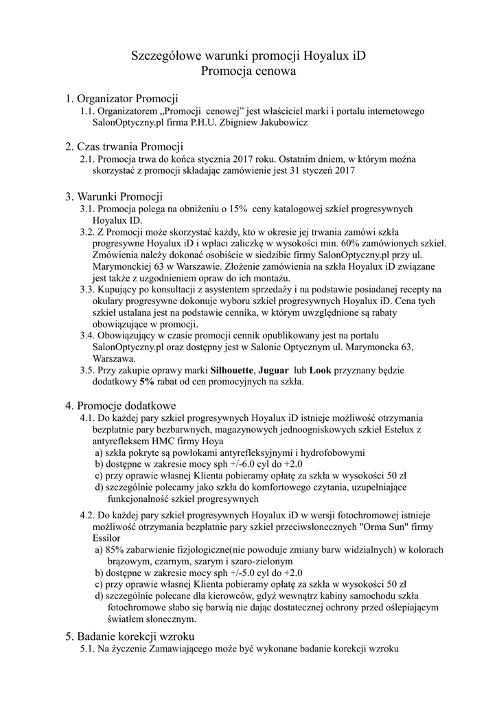 Szczegółowe warunki promocji Hoyalux iD Promocja cenowa 1. Organizator Promocji 1.1. Organizatorem „Promocji cenowej” jest właściciel marki i portalu internetowego SalonOptyczny.pl firma P.H.U. Zbigniew Jakubowicz 2. Czas trwania Promocji 2.1. Promocja trwa do końca stycznia 2017 roku. Ostatnim dniem, w którym można skorzystać z promocji składając zamówienie jest 31 styczeń 2017 3. Warunki Promocji 3.1. Promocja polega na obniżeniu o 15% ceny katalogowej szkieł progresywnych Hoyalux ID. 3.2. Z Promocji może skorzystać każdy, kto w okresie jej trwania zamówi szkła progresywne Hoyalux iD i wpłaci zaliczkę w wysokości min. 60% zamówionych szkieł. Zmówienia należy dokonać osobiście w siedzibie firmy SalonOptyczny.pl przy ul. Marymonckiej 63 w Warszawie. Złożenie zamówienia na szkła Hoyalux iD związane jest także z uzgodnieniem opraw do ich montażu. 3.3. Kupujący po konsultacji z asystentem sprzedaży i na podstawie posiadanej recepty na okulary progresywne dokonuje wyboru szkieł progresywnych Hoyalux iD. Cena tych szkieł ustalana jest na podstawie cennika, w którym uwzględnione są rabaty obowiązujące w promocji. 3.4. Obowiązujący w czasie promocji cennik opublikowany jest na portalu SalonOptyczny.pl oraz dostępny jest w Salonie Optycznym ul. Marymoncka 63, Warszawa. 3.5. Przy zakupie oprawy marki Silhouette, Juguar lub Look przyznany będzie dodatkowy 5% rabat od cen promocyjnych na szkła. 4. Promocje dodatkowe 4.1. Do każdej pary szkieł progresywnych Hoyalux iD istnieje możliwość otrzymania bezpłatnie pary bezbarwnych, magazynowych jednoogniskowych szkieł Estelux z antyrefleksem HMC firmy Hoya a) szkła pokryte są powłokami antyrefleksyjnymi i hydrofobowymi b) dostępne w zakresie mocy sph +/-6.0 cyl do +2.0 c) przy oprawie własnej Klienta pobieramy opłatę za szkła w wysokości 50 zł d) szczególnie polecamy jako szkła do komfortowego czytania, uzupełniające funkcjonalność szkieł progresywnych 4.2. Do każdej pary szkieł progresywnych Hoyalux iD w wersji fotochromowej istnieje możliwość otrzymania bezpłatnie pary szkieł przeciwsłonecznych "Orma Sun" firmy Essilor a) 85% zabarwienie fizjologiczne(nie powoduje zmiany barw widzialnych) w kolorach brązowym, czarnym, szarym i szaro-zielonym b) dostępne w zakresie mocy sph +/-5.0 cyl do +2.0 c) przy oprawie własnej Klienta pobieramy opłatę za szkła w wysokości 50 zł d) szczególnie polecane dla kierowców, gdyż wewnątrz kabiny samochodu szkła fotochromowe słabo się barwią nie dając dostatecznej ochrony przed oślepiającym światłem słonecznym. 5. Badanie korekcji wzroku 5.1. Na życzenie Zamawiającego może być wykonane badanie korekcji wzroku przeprowadzone przez optometrystę lub lekarza okulistę. 5.2. Badanie korekcji wzroku o wartości 90 zł jest refundowane przez firmę SalonOptyczny.pl pod warunkiem zakupu oprawy okularowej, do której zamontowane zostaną szkła Hoyalux iD. Jeśli warunek zakupu oprawy nie jest spełniony koszt wynosi 60 zł. SalonOptyczny.pl Warszawa 05.01.2017