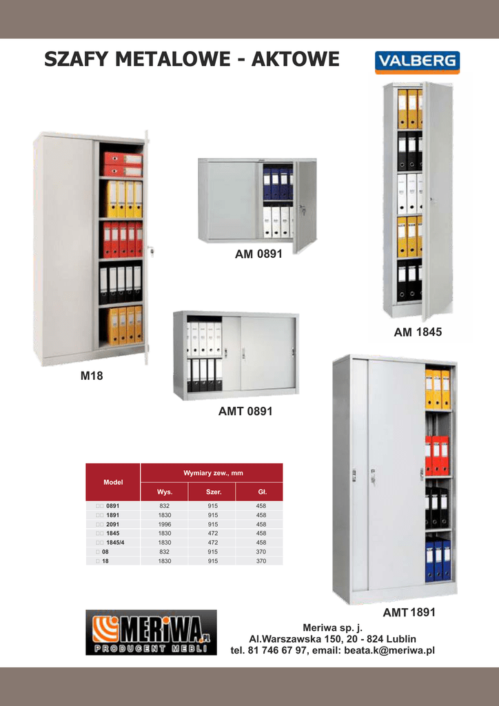 SZAFY METALOWE - AKTOWE SZAFY METALOWE AKTOWE AM 0891 AM 1845 M18 AMT 0891 Wymiary zew., mm Model Wys. Szer. Gł. 458 АМ 0891 832 915 АМ 1891 1830 915 458 АМ 2091 1996 915 458 АМ 1845 1830 472 458 АМ 1845/4 1830 472 458 М 08 832 915 370 М 18 1830 915 370 AMT 1891 Meriwa sp. j. Al.Warszawska 150, 20 - 824 Lublin tel. 81 746 67 97, email: [email protected] SZAFY METALOWE - AKTOWE Symbol BUS/27 BU/4 BU/4.100 Opis modelu Szafa biurowa 27-skrytkowa z drzwiami uchylnymi Szafa biurowa czteropółkowa, z drzwiami uchylnymi Szafa biurowa czteropółkowa, z drzwiami uchylnymi o szer. 100 BUN/1 Nadstawka do szafy biurowej z drzwiami uchylnymi BUN/1.100 Nadstawka do szafy biurowej z drzwiami uchylnymi BU/2 Szafa biurowa dwupółkowa, z drzwiami uchylnymi BU/2.100 Szafa biurowa dwupółkowa, z drzwiami uchylnymi BUS/3 Szafa biurowa trzypółkowa, ze skrytką BUS/3.100 Szafa biurowa trzypółkowa, ze skrytką BU-W/3 Szafa witrynowa,2-dzielna ze szklanymi półkami w części górnej BP/4 Szafa biurowa czteropółkowa, z drzwiami przesuwnymi BPN/1 Nadstawka do szafy biurowej z drzwiami przesuwnymi BP/2 Szafa biurowa dwupółkowa, z drzwiami przesuwnymi BŻ/4 Szafa biurowa czteropółkowa z drzwiami żaluzjowymi BŻN/1 Nadstawka do szafy biurowej z drzwiami żaluzjowymi BŻ/2 Szafa biurowa dwupółkowa z drzwiami żaluzjowymi Wymiary s/g/w 900/452/1800 900/420/1920 1000/420/1920 900/420/500 1000/420/500 900/420/1220 1000/420/1220 900/420/1920 1000/420/1920 900/420/1920 900/420/1920 900/420/500 900/420/1220 1000/420/1920 1000/420/500 1000/420/1220 Meriwa sp. j. Al.Warszawska 150, 20 - 824 Lublin tel. 81 746 67 97, email: [email protected] SZAFY METALOWE - AKTOWE Meriwa sp. j. Al.Warszawska 150, 20 - 824 Lublin tel. 81 746 67 97, email: [email protected]