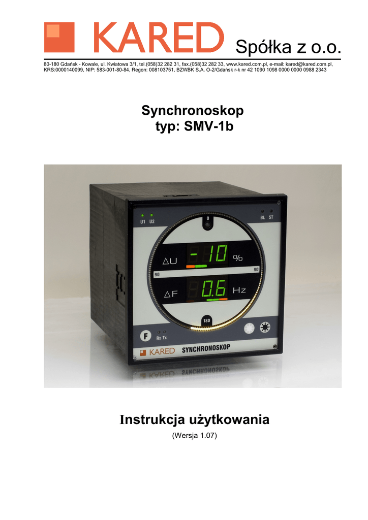 Spółka z o.o. 80-180 Gdańsk – Kowale, ul. Kwiatowa 3/1, tel.(058)32 282 31, fax.(058)32 282 33, www.kared.com.pl, e-mail: [email protected], KRS:0000140099, NIP: 583-001-80-84, Regon: 008103751, BZWBK S.A. O-2/Gdańsk r-k nr 42 1090 1098 0000 0000 0988 2343 Synchronoskop typ: SMV-1b Instrukcja użytkowania (Wersja 1.07) Synchronoskop SMV-1b – Instrukcja użytkowania PUP KARED zastrzega sobie prawo wprowadzania zmian w swoich produktach polegających na doskonaleniu ich cech technicznych. Zmiany te nie zawsze mogą być na bieżąco uwzględniane w dokumentacji. Marki i nazwy produktów wymienione w niniejszej instrukcji stanowią znaki towarowe lub zarejestrowane znaki towarowe, należące odpowiednio do ich właścicieli. Nasz adres: PUP KARED Sp. z o.o. 80-180 Kowale k. Gdańska, ul. Kwiatowa 3/1 telefon: +48-58-322 82 31 fax: +48-58-324 86 46 email: [email protected] www: http://www.kared.com.pl/ Copyright 2006 by PUP Kared. Wszelkie prawa zastrzeżone. PUP KARED Sp. z o.o. SMV-1_IU_107 wersja: 1.07 Strona 2 Synchronoskop SMV-1b – Instrukcja użytkowania Spis treści 1. Znaczenie instrukcji użytkowania................................................................................................5 2. Informacja o zgodności............................................................................................................... 6 3. Zastosowanie urządzenia SMV-1b..............................................................................................6 4. Zasady bezpieczeństwa.............................................................................................................. 8 4.1. Instalacja urządzenia ............................................................................................................... 8 4.2. Uruchomienie urządzenia.........................................................................................................8 4.3. Eksploatacja urządzania.......................................................................................................... 8 4.4. Otwieranie obudowy................................................................................................................. 8 4.5. Obsługa.................................................................................................................................... 8 4.6. Przeróbki i zmiany.................................................................................................................... 9 4.7. Zakłócenia................................................................................................................................ 9 4.8. Tabliczki znamionowe, informacyjne i naklejki.........................................................................9 4.9. Symbole................................................................................................................................... 9 5. Opis techniczny......................................................................................................................... 10 5.1. Opis ogólny............................................................................................................................ 10 6. Dane techniczne........................................................................................................................ 11 6.1. Warunki środowiskowe........................................................................................................... 11 6.2. Dane o kompletności.............................................................................................................. 11 6.3. Charakterystyka zasilania.......................................................................................................12 6.4. Charakterystyka ogólna wejść................................................................................................12 6.5. Dane wejść pomiarowych.......................................................................................................12 6.6. Dane wejść dwustanowych....................................................................................................12 6.7. Charakterystyka wyjść........................................................................................................... 13 7. Instalacja................................................................................................................................... 13 8. Obsługa..................................................................................................................................... 17 8.1. Obsługa bieżąca..................................................................................................................... 17 8.2. Ręczny odczyt nastaw............................................................................................................ 17 9. Algorytm SMV-1b...................................................................................................................... 17 9.1. Zastosowane symbole............................................................................................................17 9.1. Zastosowane symbole............................................................................................................17 9.2. Nastawy................................................................................................................................. 18 9.3. Definicje................................................................................................................................. 19 9.4. Algorytm działania urządzenia SMV-1b..................................................................................19 10. Komunikacja przez łącze szeregowe.......................................................................................22 10.1. Informacja podstawowe........................................................................................................22 PUP KARED Sp. z o.o. SMV-1_IU_107 wersja: 