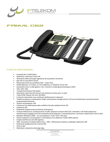 FANVIL C62 FUNKCJE PODSTAWOWE: Protokół SIP 2.0 (RFC3261) Możliwośd rejestracji 3 kont SIP. Możliwośd jednoczesnego logowania do wszystkich serwerów głos HD na wszystkich liniach Rejestracja konta po protokole IAX2 – jedna linia Kodeki głosowe: G.711A/u, G.7231 high/low, G.729a/b;G.722;G.726 Kasowanie echa: G.168 zgodne z LEC, również w trybie głośnomówiącym (AEC) VGS, VAD, CNG Tryb głośnomówiący full-duplex Możliwośd rejestracji SIP domain lub realizacji rozmów peer to peer Tryby DTMF inband, SIP info, RFC2833 9 różnych dzwonków oraz możliwośd definiowania 5 własnych Telefon przyjazny w użytkowaniu dzięki zastosowaniu dużego ekranu LCD oraz funkcjonalnie rozmieszczonych programowych klawiszy Zestaw słuchawkowy- RJ9 4 klawisze linii definiowane jako multiline lub jako odrębne konta SIP 8 klawiszy DSS Możliwośd programowania klawiszy funkcyjnych Funkcje telefoniczne: przekazywanie/ tranfer połączeo zarówno blind jak i attended / call-hold/ połączenia konferencyjne/ paging and intercom/parkowanie połączeo / przechwytywanie / ponowne wybieranie/ click to dial/ Blacklist/ Whitelist /DND – nie przeszkadzad / CLIR / CLIP / Dial plan Historia połączeo: przychodzące / wychodzące /nie odebrane. Każda 1000 wpisów. Książka telefoniczna do 500 wpisów; SMS ; Zewnętrzna książka telefoniczna - XML ; definiowanie klawiszy szybkiego wybierania; Blf Możliwośd podłączenia do 5 konsol DSS Click to dial Możliwośd ustawienia własnego logo FUNKCJE SIECIOWE: WAN/LAN: 10/100 porty Ethernet, port LAN w trybie Bridge lub Router PPPoE dla XDSL PoE (opcja) VLAN (głos/dane) 802.1 Wsparcie dla serwerów STUN DHCP klient na WAN DHCP serwerów na LAN DNS Relay, SNTP, Firewall,DMZ VPN (L2TP) QoS Narzędzia sieciowe po telnet: ping, trace route. ZARZĄDZANIE TELEFONEM: Zarządzanie przez WWW, Telnet oraz bezpośrednio z telefonu Tworzenie użytkowników z różnymi prawami dostępu do zarządzania telefonem Aktualizacja przez HTTP, FTP lub TFTP Auto provisioning/dhcp option66/HTTPS/FTPS Zarządzanie przez Telnet SPECYFIKACJA TECHNICZNA: Model C62 Zasilanie Input: 100-240V Output: 5V/1A WAN 10/100Base-T RJ-45 LAN 10/100Base-T RJ-45 Porty Zapotrzebowanie na moc Idle: 2.5W / Active: 2.8W Ekran LCD 53.5 x 70 mm Chipset Broadcom SDRAM 128 Mbits Pamięd flash 32MB Waga 0.99 kg