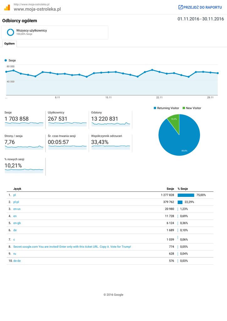 http://www.moja-ostroleka.pl PRZEJDŹ DO RAPORTU www.moja-ostroleka.pl 01.11.2016 - 30.11.2016 Odbiorcy ogółem Wszyscy użytkownicy 100,00% Sesje Ogółem Sesje 80 000 40 000 … 8.11 15.11 22.11 29.11 Returning Visitor Sesje Użytkownicy Odsłony 1 703 858 267 531 13 220 831 Strony / sesja Śr. czas trwania sesji Współczynnik odrzuceń 7,76 00:05:57 33,43% New Visitor 10,2% 89,8% % nowych sesji 10,21% Język Sesje 1. pl % Sesje 1 277 828 75,00% 2. pl-pl 379 762 3. en-us 20 980 1,23% 4. en 11 728 0,69% 5. en-gb 6 124 0,36% 6. de 1 689 0,10% 7. c 1 039 0,06% 8. Secret.ɢoogle.com You are invited! Enter only with this ticket URL. Copy it. Vote for Trump! 774 0,05% 9. ru 628 0,04% 10. de-de 576 0,03% © 2016 Google 22,29%
