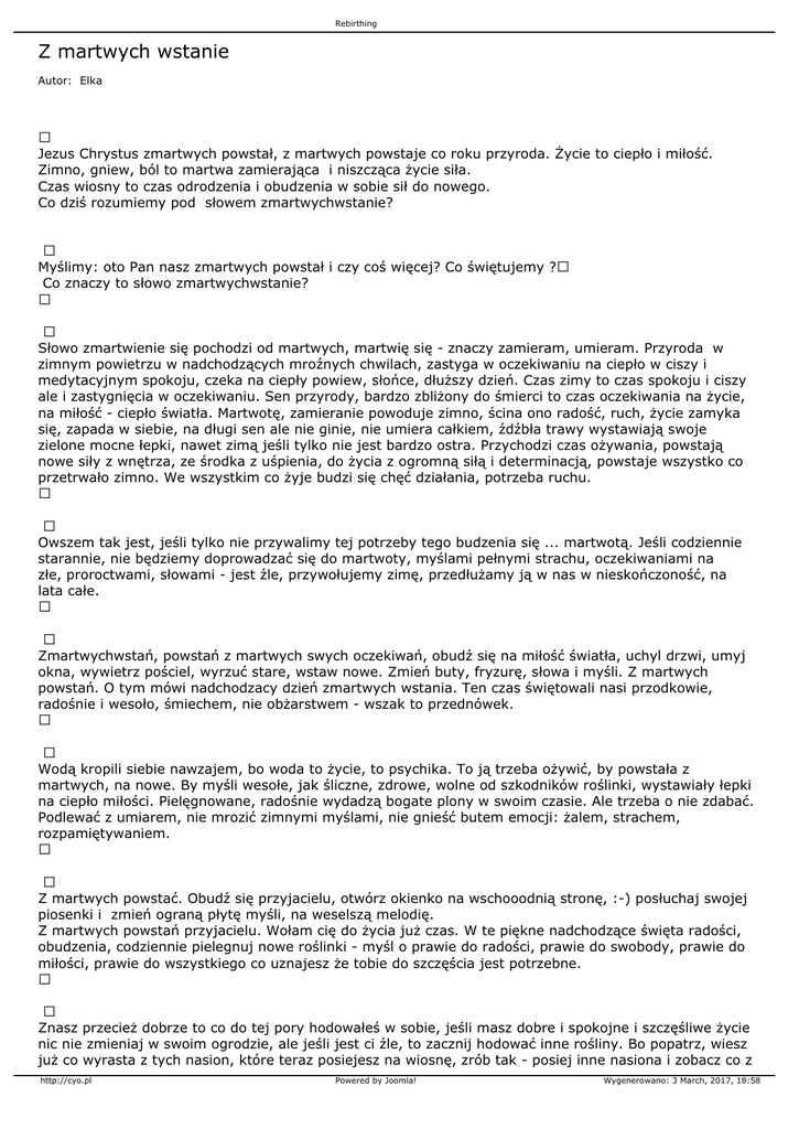 Rebirthing Z martwych wstanie Autor: Elka Jezus Chrystus zmartwych powstał, z martwych powstaje co roku przyroda. Życie to ciepło i miłość. Zimno, gniew, ból to martwa zamierająca i niszcząca życie siła. Czas wiosny to czas odrodzenia i obudzenia w sobie sił do nowego. Co dziś rozumiemy pod słowem zmartwychwstanie? Myślimy: oto Pan nasz zmartwych powstał i czy coś więcej? Co świętujemy ? Co znaczy to słowo zmartwychwstanie? Słowo zmartwienie się pochodzi od martwych, martwię się - znaczy zamieram, umieram. Przyroda w zimnym powietrzu w nadchodzących mroźnych chwilach, zastyga w oczekiwaniu na ciepło w ciszy i medytacyjnym spokoju, czeka na ciepły powiew, słońce, dłuższy dzień. Czas zimy to czas spokoju i ciszy ale i zastygnięcia w oczekiwaniu. Sen przyrody, bardzo zbliżony do śmierci to czas oczekiwania na życie, na miłość - ciepło światła. Martwotę, zamieranie powoduje zimno, ścina ono radość, ruch, życie zamyka się, zapada w siebie, na długi sen ale nie ginie, nie umiera całkiem, źdźbła trawy wystawiają swoje zielone mocne łepki, nawet zimą jeśli tylko nie jest bardzo ostra. Przychodzi czas ożywania, powstają nowe siły z wnętrza, ze środka z uśpienia, do życia z ogromną siłą i determinacją, powstaje wszystko co przetrwało zimno. We wszystkim co żyje budzi się chęć działania, potrzeba ruchu. Owszem tak jest, jeśli tylko nie przywalimy tej potrzeby tego budzenia się ... martwotą. Jeśli codziennie starannie, nie będziemy doprowadzać się do martwoty, myślami pełnymi strachu, oczekiwaniami na złe, proroctwami, słowami - jest źle, przywołujemy zimę, przedłużamy ją w nas w nieskończoność, na lata całe. Zmartwychwstań, powstań z martwych swych oczekiwań, obudź się na miłość światła, uchyl drzwi, umyj okna, wywietrz pościel, wyrzuć stare, wstaw nowe. Zmień buty, fryzurę, słowa i myśli. Z martwych powstań. O tym mówi nadchodzacy dzień zmartwych wstania. Ten czas świętowali nasi przodkowie, radośnie i wesoło, śmiechem, nie obżarstwem - wszak to przednówek. Wodą kropili siebie nawzajem, bo woda to życie, to psychika. To ją trzeba ożywić, by powstała z martwych, na nowe. By myśli wesołe, jak śliczne, zdrowe, wolne od szkodników roślinki, wystawiały łepki na ciepło miłości. Pielęgnowane, radośnie wydadzą bogate plony w swoim czasie. Ale trzeba o nie zdabać. Podlewać z umiarem, nie mrozić zimnymi myślami, nie gnieść butem emocji: żalem, strachem, rozpamiętywaniem. Z martwych powstać. Obudź się przyjacielu, otwórz okienko na wschooodnią stronę, :-) posłuchaj swojej piosenki i zmień ograną płytę myśli, na weselszą melodię. Z martwych powstań przyjacielu. Wołam cię do życia już czas. W te piękne nadchodzące święta radości, obudzenia, codziennie pielegnuj nowe roślinki - myśl o prawie do radości, prawie do swobody, prawie do miłości, prawie do wszystkiego co uznajesz że tobie do szczęścia jest potrzebne. Znasz przecież dobrze to co do tej pory hodowałeś w sobie, jeśli masz dobre i spokojne i szczęśliwe życie nic nie zmieniaj w swoim ogrodzie, ale jeśli jest ci źle, to zacznij hodować inne rośliny. Bo popatrz, wiesz już co wyrasta z tych nasion, które teraz posiejesz na wiosnę, zrób tak - posiej inne nasiona i zobacz co z http://cyo.pl Powered by Joomla! Wygenerowano: 3 March, 2017, 18:58 Rebirthing nich wyrośnie. Pielęgnuj je uważnie i chwasty wyrywaj - chciwość, nienawiść, zazdrość, usuń ze swojego ogrodu. Wiosna, już czas na obudzenie się. Czas na światło, radość, miłość, szczęście. Z martwych czas powstać! http://cyo.pl Powered by Joomla! Wygenerowano: 3 March, 2017, 18:58