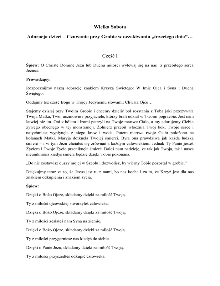 Wielka Sobota Adoracja dzieci – Czuwanie przy Grobie w oczekiwaniu „trzeciego dnia”… Część I Śpiew: O Christe Domine Jezu lub Duchu miłości wylewaj się na nas z przebitego serca Jezusa. Prowadzący: Rozpocznijmy naszą adorację znakiem Krzyża Świętego: W Imię Ojca i Syna i Ducha Świętego. Oddajmy też cześć Bogu w Trójcy Jedynemu słowami: Chwała Ojcu… Stajemy dzisiaj przy Twoim Grobie i chcemy dzielić ból rozstania z Tobą jaki przeżywała Twoja Matka, Twoi uczniowie i przyjaciele, którzy brali udział w Twoim pogrzebie. Jest nam łatwiej niż im. Oni z bólem i łzami patrzyli na Twoje martwe Ciało, a my adorujemy Ciebie żywego obecnego w tej monstrancji. Żołnierz przebił włócznią Twój bok, Twoje serce i natychmiast wypłynęła z niego krew i woda. Potem martwe twoje Ciało położono na kolanach Matki. Maryja dotknęła Twojej śmierci. Była ona prawdziwa jak każda ludzka śmierć – i w tym Jezu chciałeś się zrównać z każdym człowiekiem. Jednak Ty Panie jesteś Życiem i Twoje Życie przeniknęła śmierć. Dałeś nam nadzieję, że tak jak Twoja, tak i nasza nieunikniona kiedyś śmierć będzie dzięki Tobie pokonana. „Bo nie zostawisz duszy mojej w Szeolu i dozwolisz, by wierny Tobie pozostał w grobie.” Dziękujmy teraz za to, że Jezus jest tu z nami, bo nas kocha i za to, że Krzyż jest dla nas znakiem odkupienia i znakiem życia. Śpiew: Dzięki o Bożo Ojcze, składamy dzięki za miłość Twoją. Ty z miłości ojcowskiej stworzyłeś człowieka. Dzięki o Bożo Ojcze, składamy dzięki za miłość Twoją. Ty z miłości zesłałeś nam Syna na ziemię. Dzięki o Bożo Ojcze, składamy dzięki za miłość Twoją. Ty z miłości przygarniesz nas kiedyś do siebie. Dzięki o Panie Jezu, składamy dzięki za miłość Twoją. Ty z miłości przyszedłeś odkupić człowieka. Dzięki o Panie Jezu, składamy dzięki za miłość Twoją. Ty z miłości przyjąłeś swój Krzyż i cierpienie. Dzięki o Panie Jezu, składamy dzięki za miłość Twoją. Ty oddałeś nas wszystkich swej Matce. Dzięki o Duchu Święty, składamy dzięki za miłość Twoją. Ty z miłości przez dar swoich łask mieszkasz w sercach. Dzięki o Duchu Święty, składamy dzięki za miłość Twoją. Ty z miłością wciąż uczysz człowieka świętości. Dzięki o Duchu Święty, składamy dzięki za miłość Twoją. Ty przychodzisz, by ziemię odnowić miłością. Dzięki o Trójco Święta, składamy dzięki za miłość Twoją. Część II Prowadzący: Panie! Spojrzyj miłosiernie na słabości nasze i przyjdź nam z pomocą, bo jej bardzo potrzebujemy. Modlitwy dzieci: 1. O to, aby śmierć, którą poniosłeś dla naszego zbawienia, nie była dla nas daremna – prosimy Cię Panie. 2. O nawrócenie tych, którzy odeszli od Ciebie - prosimy Cię Panie. 3. O wiarę dla niewierzących - prosimy Cię Panie. 4. O dary Ducha Świętego dla całego Kościoła - prosimy Cię Panie. 5. O pokój na świecie - prosimy Cię Panie. 6. O zgodę i miłość w naszych rodzinach - prosimy Cię Panie. 7. O to, aby wszyscy sprawujący władzę byli wierni Twojemu Prawu - prosimy Cię Panie. 8. O siły do dobrego wypełniania naszych zadań - prosimy Cię Panie. 9. O wierność Tobie, abyśmy nie zeszli z Twojej drogi - prosimy Cię Panie. 10. O siły do zwalczania pokus - prosimy Cię Panie. 11. O uzdrowienie i wytrwałość w cierpieniach dla chorych - prosimy Cię Panie. 12. Za wszystkich bezdomnych, bezrobotnych - prosimy Cię Panie. 13. Za rodziny biedne, za głodne dzieci - prosimy Cię Panie. 14. Abyś uchronił naszą Ojczyznę od wojny, niezgody i wszelkiego zła - prosimy Cię Panie. 15. Za sieroty, ludzi samotnych, opuszczonych i smutnych - prosimy Cię Panie. 16. … Chwila ciszy Śpiew: Zbawienie przyszło przez Krzyż (1 zwrotka) Prowadzący: Patrząc na Twój Grób Panie Jezu myślimy o tym, że kiedyś i my umrzemy. Prosimy Cię, abyś nas wtedy ocalił i przyjął do siebie. Prosimy Cię tez Panie za wszystkich zmarłych, szczególnie za naszych bliskich i drogich, którzy przeszli już przez śmierć. Przez wstawiennictwo Twojej Matki daj im Panie wieczny odpoczynek. Módlmy się: Modlitwy dzieci: 1. 2. 3. 4. 5. 6. 7. 8. 9. Za dusze naszych krewnych - prosimy Cię Panie. Za dusze oczekujące naszej modlitwy - prosimy Cię Panie. Za dusze zmarłych w obozach i więzieniach - prosimy Cię Panie. Za poległych na wojnach - prosimy Cię Panie. Za ofiary wypadków - prosimy Cię Panie. Za ofiary ataków terrorystycznych - prosimy Cię Panie. Za tych, co nagle umarli - prosimy Cię Panie. Za dusze tych, którzy w tej chwili umierają - prosimy Cię Panie. Za męczenników naszych czasów, którzy woleli umrzeć, niż wyprzeć się Ciebie prosimy Cię Panie. Prowadzący: W miłosierdziu swoim o dobry Jezu wprowadź ich do domu Ojca, aby wielbiąc Ciebie z całym Niebem mogli obchodzić pamiątkę Twojego Zmartwychwstania. Śpiew: Zbawienie przyszło przez Krzyż (2 zwrotka) Część III Prowadzący: Klęczymy przed Tobą obecnym z nami w Najświętszym Sakramencie z wdzięcznością, miłością i uwielbieniem. Modlitwa dzieci: 1. Miłość Twoją, która przepełniała Twe serce, gdy spod korony cierniowej broczyła krew po Twojej Świętej Twarzy – wszyscy: uwielbiam i wysławiam – z pomocą Twej łaski płynącej z Krzyża pragnę z szacunkiem odnosić się do drugiego człowieka. 2. Miłość Twoją, która przepełniała Twe serce, gdy gwoździe naszych grzechów przybijały do Krzyża Twoje ręce i nogi – wszyscy: uwielbiam i wysławiam – ufam, że Twoja łaska płynąca z Krzyża pogodzi mnie z każdym cierpieniem jakie mnie czeka. 3. Miłość Twoją, która przepełniała Twoje serce, gdy cierpiąc na Krzyżu prosiłeś Ojca o przebaczenie moich grzechów – wszyscy: uwielbiam i wysławiam – z pomocą Twej łaski płynącej z Krzyża pragnę, aby moje serce było gotowe zawsze przebaczać. 4. Miłość Twoją, która przepełn