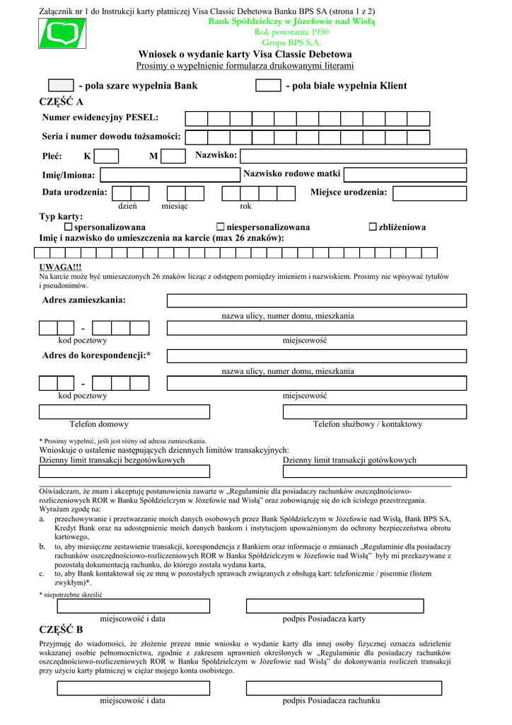 Załącznik nr 1 do Instrukcji karty płatniczej Visa Classic Debetowa Banku BPS SA (strona 1 z 2) Bank Spółdzielczy w Józefowie nad Wisłą Rok powstania 1950 Grupa BPS S.A. Wniosek o wydanie karty Visa Classic Debetowa Prosimy o wypełnienie formularza drukowanymi literami - pola szare wypełnia Bank - pola białe wypełnia Klient CZĘŚĆ A Numer ewidencyjny PESEL: Seria i numer dowodu tożsamości: Płeć: K Nazwisko: M Nazwisko rodowe matki Imię/Imiona: Data urodzenia: Miejsce urodzenia: dzień miesiąc rok Typ karty: spersonalizowana niespersonalizowana Imię i nazwisko do umieszczenia na karcie (max 26 znaków): zbliżeniowa UWAGA!!! Na karcie może być umieszczonych 26 znaków licząc z odstępem pomiędzy imieniem i nazwiskiem. Prosimy nie wpisywać tytułów i pseudonimów. Adres zamieszkania: nazwa ulicy, numer domu, mieszkania kod pocztowy miejscowość Adres do korespondencji:* nazwa ulicy, numer domu, mieszkania kod pocztowy Telefon domowy miejscowość Telefon służbowy / kontaktowy * Prosimy wypełnić, jeśli jest różny od adresu zamieszkania. Wnioskuje o ustalenie następujących dziennych limitów transakcyjnych: Dzienny limit transakcji bezgotówkowych Dzienny limit transakcji gotówkowych Oświadczam, że znam i akceptuję postanowienia zawarte w „Regulaminie dla posiadaczy rachunków oszczędnościoworozliczeniowych ROR w Banku Spółdzielczym w Józefowie nad Wisłą” oraz zobowiązuję się do ich ścisłego przestrzegania. Wyrażam zgodę na: a. przechowywanie i przetwarzanie moich danych osobowych przez Bank Spółdzielczym w Józefowie nad Wisłą, Bank BPS SA, Kredyt Bank oraz na udostępnienie moich danych bankom i instytucjom upoważnionym do ochrony bezpieczeństwa obrotu kartowego, b. to, aby miesięczne zestawienie transakcji, korespondencja z Bankiem oraz informacje o zmianach „Regulaminie dla posiadaczy rachunków oszczędnościowo-rozliczeniowych ROR w Banku Spółdzielczym w Józefowie nad Wisłą” były mi przekazywane z pozostałą dokumentacją rachunku, do którego została wydana karta, c. to, aby Bank kontaktował się ze mną w pozostałych sprawach związanych z obsługą kart: telefonicznie / pisemnie (listem zwykłym)*. * niepotrzebne skreślić miejscowość i data podpis Posiadacza karty CZĘŚĆ B Przyjmuję do wiadomości, że złożenie przeze mnie wniosku o wydanie karty dla innej osoby fizycznej oznacza udzielenie wskazanej osobie pełnomocnictwa, zgodnie z zakresem uprawnień określonych w „Regulaminie dla posiadaczy rachunków oszczędnościowo-rozliczeniowych ROR w Banku Spółdzielczym w Józefowie nad Wisłą” do dokonywania rozliczeń transakcji przy użyciu karty płatniczej w ciężar mojego konta osobistego. miejscowość i data podpis Posiadacza rachunku Załącznik nr 1 do Instrukcji karty płatniczej Visa Classic Debetowa Banku BPS SA (strona 2 z 2) WYPEŁNIA PLACÓWKA SPRZEDAŻOWA BANKU Data przyjęcia wniosku stempel dzienny i podpis pracownika przyjmującego wniosek Karta wydana do rachunku (pełny numer) Nr karty Decyzja banku ...................................................................................................................................................................... ...................................................................................................................................................................... ...................................................................................................................................................................... ...................................................................................................................................................................... ..................................................................................................................................................................... miejscowość i data podpis i stempel /pieczątka imienna upoważnionego pracownika Adnotacje ...................................................................................................................................................................... ...................................................................................................................................................................... ...................................................................................................................................................................... ...................................................................................................................................................................... ......................................................................................................................................................................