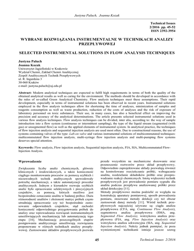 Justyna Paluch, Joanna Kozak Technical Issues 2/2016 pp. 45-52 ISSN 2392-3954 WYBRANE ROZWIĄZANIA INSTRUMENTALNE W TECHNIKACH ANALIZY PRZEPŁYWOWEJ SELECTED INSTRUMENTAL SOLUTIONS IN FLOW ANALYSIS TECHNIQUES Justyna Paluch Joanna Kozak Uniwersytet Jagielloński w Krakowie Wydział Chemii, Zakład Chemii Analitycznej Zespół Analitycznych Technik Przepływowych ul. R. Ingardena 3 30-060 Kraków e-mail: [email protected] Abstract: Modern analytical techniques are expected to fulfil high requirements in terms of both the quality of the obtained analytical results as well as caring for the environment. The methods should be developed in accordance with the rules of so-called Green Analytical Chemistry. Flow analysis techniques meet these assumptions. Their rapid development, especially in terms of instrumental solutions has been observed in recent years. Instrumental solutions employed in the flow analysis techniques allow for shortening the time of analyses, minimization of samples and reagents consumption as well as waste production, reduction of the costs of analyses and the risk of exposure of laboratory personnel on toxic substances. Their use, in many cases, has also a beneficial effect on improving the precision and accuracy of the analytical determinations. The article presents selected instrumental solutions used in various flow analysis techniques. Flow analysis techniques can be divided, inter alia, according to: the way of sample introduction into a flow system (continuous or intermittent sampling), the type of the liquid stream (segmented (with gas) or unsegmented flow) as well as the applied elements of instrumental system. In analytical practice, the techniques of flow injection analysis and sequential injection analysis are used most often. Due to constructional reasons, the use of systems containing valves of the type: Lab-on valve and various instrumental solutions of multicommutated techniques: multicommutated flow injection analysis, multi-syringe flow injection analysis and multi-pumping flow systems deserves special attention. Keywords: Flow analysis, Flow injection analysis, Sequential injection analysis, FIA, SIA, Multicommutated FlowInjection Analysis. przede wszystkim na mechaniczne dozowanie oraz przenoszenie roztworów przez układ przepływowy. Odpowiednio zaprojektowane układy pozwalają również na kontrolowane rozcieńczanie próbki, wzbogacanie analitu, rozdzielanie składników próbki oraz przeprowadzanie reakcji chemicznych. Istotą większości technik przepływowych jest prowadzenie pomiaru sygnału dla analitu podczas przepływu analizowanej próbki przez układ detekcyjny [11]. Metody przepływowe można podzielić ze względu na konstrukcję aparatury pomiarowej, sposób prowadzenia pomiaru, stosowane metody detekcji czy też obszar zastosowań danej metody [11]. Wśród technik przepływowych najczęściej używane są: ciągła analiza przepływowa (CFA, ang. Continuous Flow Analysis), segmentowa analiza przepływowa (SMA, ang. Segmented Flow Analysis), wstrzykowa analiza przepływowa (FIA, ang. Flow Injection Analysis) oraz wstrzykowa analiza sekwencyjna (SIA, ang. Sequential Injection Analysis). Należy jednak pamiętać, że poza wymienionymi technikami istnieje jeszcze szereg Wprowadzenie Zwiększenie liczby analiz chemicznych, głównie klinicznych i środowiskowych, a także konieczność ciągłego monitorowania procesów za pomocą szybkich i niezawodnych technik analitycznych spowodowały potrzebę mechanizacji, a także automatyzacji procedur analitycznych. Jednym z kierunków rozwoju szybkich analiz było opracowanie selektywnych i precyzyjnych czujników, za pomocą, których możliwe jest bezpośrednie oznaczanie analitu w badanej próbce. Duża różnorodność analitów i złożoność matryc próbek często utrudniają opracowanie czy też bezpośrednie zastosowanie odpowiednich czujników, stąd zachodzi konieczność odpowiedniego przygotowania próbek do analizy oraz wprowadzania rozwiązań instrumentalnych umożliwiających mechanizację lub automatyzację tego etapu [16]. Mechanizację poszczególnych etapów postępowania analitycznego umożliwiają rozwiązania proponowane w różnych technikach analizy przepływowej. Zastosowanie układów przepływowych pozwala 45 Technical Issues 2/2016 WYBRANE ROZWIĄZANIA INSTRUMENTALNE W TECHNIKACH ANALIZY PRZEPŁYWOWEJ innych, które również zaliczane są do technik analizy przepływowej. Pierwszej klasyfikacji metod przepływowych, ze względu na sposób wprowadzania próbki (ciągły lub periodyczny) oraz ze względu na charakter płynącego strumienia cieczy (z i bez segmentowania strumienia cieczy gazem, zazwyczaj powietrzem) dokonał Van der Linden [16], a następnie opisał Zagatto [19]. W roku 2012 podział ten został rozszerzony przez Diniz [2] o metodę bezpośredniego wstrzyknięcia do detektora (BIA, ang. Batch Injection Analysis). Podział ten przedstawiono na rys. 1. Metody, w których próbka pobierana jest w sposób ciągły stosuje się najczęściej w analizie procesowej, umożliwiając tym samym ciągły monitoring stężenia analitu. W skali laboratoryjnej zdecydowanie częściej stosowane są metody z próbkowaniem periodycznym. W metodach ciągłych z segmentowaniem strumienia cieczy, w celu ograniczenia dyspersji próbki w trakcie przepływu, do przewodów wprowadza się pęcherzyki powietrza. Metoda wstrzykowej analizy przepływowej polega na wstrzykiwaniu określonej objętości próbki do nośnika, który płynie przez układ w sposób ciągły, natomiast we wstrzykowej analizie sekwencyjnej do układu wprowadzane są kolejno strefy próbki i odczynników, które podczas wprowadzania oraz po zmianie kierunku przepływu I skierowaniu segmentu do układu detekcyjnego ulegają mieszaniu, umożliwiając tym samym zajście reakcji chemicznej pozwalającej na przeprowadzenie pomiaru sygnału dla analitu. Metoda bezpośredniego wstrzyknięcia do detektora poleg