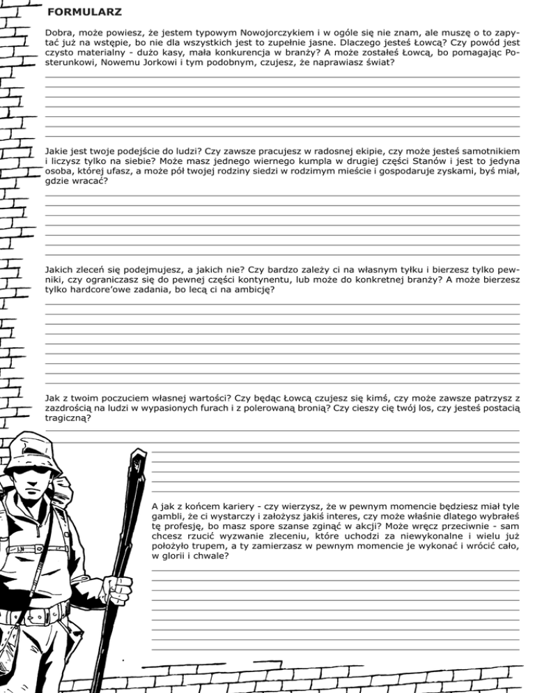 FORMULARZ Dobra, może powiesz, że jestem typowym Nowojorczykiem i w ogóle się nie znam, ale muszę o to zapytać już na wstępie, bo nie dla wszystkich jest to zupełnie jasne. Dlaczego jesteś Łowcą? Czy powód jest czysto materialny - dużo kasy, mała konkurencja w branży? A może zostałeś Łowcą, bo pomagając Posterunkowi, Nowemu Jorkowi i tym podobnym, czujesz, że naprawiasz świat? Jakie jest twoje podejście do ludzi? Czy zawsze pracujesz w radosnej ekipie, czy może jesteś samotnikiem i liczysz tylko na siebie? Może masz jednego wiernego kumpla w drugiej części Stanów i jest to jedyna osoba, której ufasz, a może pół twojej rodziny siedzi w rodzimym mieście i gospodaruje zyskami, byś miał, gdzie wracać? Jakich zleceń się podejmujesz, a jakich nie? Czy bardzo zależy ci na własnym tyłku i bierzesz tylko pewniki, czy ograniczasz się do pewnej części kontynentu, lub może do konkretnej branży? A może bierzesz tylko hardcore’owe zadania, bo lecą ci na ambicję? Jak z twoim poczuciem własnej wartości? Czy będąc Łowcą czujesz się kimś, czy może zawsze patrzysz z zazdrością na ludzi w wypasionych furach i z polerowaną bronią? Czy cieszy cię twój los, czy jesteś postacią tragiczną? A jak z końcem kariery - czy wierzysz, że w pewnym momencie będziesz miał tyle gambli, że ci wystarczy i założysz jakiś interes, czy może właśnie dlatego wybrałeś tę profesję, bo masz spore szanse zginąć w akcji? Może wręcz przeciwnie - sam chcesz rzucić wyzwanie zleceniu, które uchodzi za niewykonalne i wielu już położyło trupem, a ty zamierzasz w pewnym momencie je wykonać i wrócić cało, w glorii i chwale?
