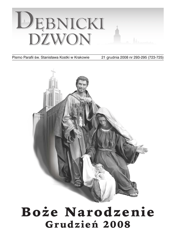 Pismo Parafii św. Stanisława Kostki w Krakowie 21 grudnia 2008 nr 293-295 (723-725) Boże Narodzenie G r udzi eń 2 008 Boże Narodzenie Boże Narodzenie to misterium radości. Z miłości do człowieka Syn Boży przyszedł na świat. Świętujemy Jego urodziny. Chcemy napatrzyć się na Jezusa i ponieść Jego światło w nasz zwyczajny dzień. Czy słyszysz śpiewy anielskie? Czy dostrzegasz Jego Gwiazdę? Nie zobaczysz jeśli jej nie będziesz wypatrywał, nie usłyszysz śpiewania anielskiego, jeśli go nie będziesz nasłuchiwał, nie odnajdziesz gwiazdy zbawienia jeśli jej nie będziesz szukał, nie dosłyszysz słów prawdy jeśli ich nie będziesz pragnął. Tylko tak można spotkać Boga ze złotem, kadzidłem, mirrą. Ze złotem miłości aż do zupełnego poświęcenia się, z kadzidłem zachwytu, z mirrą zamyślenia. Nieustannie się rodzę mówi Bóg i przychodzę w nagim ciele niemowlaka, z płaczem bezsilności, łaknący ramion drugiego człowieka, przychodzę bezbronny i otwieram umysły na prawdy światełko, serca na pokój niebiański dłonie na dary natury oczy na świata cudowność życie na innych wędrówkę Nieustannie się rodzę i szukam Zacheuszów, zabłąkanych owiec i czekam na kroki powrotu na splecione dłonie na łzy przebaczenia i chęć zapomnienia na miłość bez warunków. Nieustannie się rodzę i pragnę: oczu Miłości we Mnie wpatrzonych, ramion otwartych – bezpiecznej przystani uścisku dłoni- radości spotkania ciepłego serca – ochrony przed zimnem uśmiechu szczęścia – świadectwa istnienia. 2 Życzenia Drodzy Czytelnicy Dębnickiego Dzwonu Życzymy: Aby przy Żłóbku rozbudziła się tęsknota za świętością, wzajemną życzliwością i dobrocią, aby Światło Betlejemskiej Gwiazdy zwiastującej narodziny Zbawiciela przepełniało codzienność nadzieją, pokojem i otwierało serca na drugiego człowieka. Maryja Matka Jezusa niech wskazuje drogę do Nieba ucząc prostoty i pokory oraz mądrości w poszukiwaniu tego co się Bogu podoba. Niech w każdym z nas dokona się cud tej Świętej Nocy, w naszym sercu, w naszym domu niech narodzi się Bóg! Nowy Rok 2009 niech będzie okazją do świadczenia o miłości Boga, aby Jego Imię było wielbione na całej ziemi. Redakcja 3 Słowo Dla Życia Słowo Dla Życia (21.12.2008) Bóg posłał anioła Gabryjela do miasta w Galilei, zwanego Nazaret, do Dziewicy poślubionej mężowi, imieniem Józef, z rodu Dawida; a Dziewicy było na imię Maryja. Anioł wszedł do Niej i rzekł: „Bądź pozdrowiona, pełna łaski, Pan z Tobą”. Ona zmieszała się na te słowa i rozważała, co miałoby znaczyć to pozdrowienie. Lecz anioł rzekł do Niej: „Nie bój się Maryjo, znalazłaś łaskę u Boga. Oto poczniesz i porodzisz Syna, któremu nadasz imię Jezus. Będzie On wielki i będzie nazwany Synem Najwyższego, a Pan da Mu tron Jego ojca, Dawida. Będzie panował nad domem Jakuba na wieki a Jego panowaniu nie będzie końca”. Na to Maryja rzekła do anioła: „Jakże się to stanie, skoro nie znam męża”. Anioł Jej odpowiedział: „Duch Święty zstąpi na Ciebie i moc Najwyższego osłoni Cię, dlatego też Święte, które się narodzi, będzie nazwane Synem Bożym. A oto również krewna Twoja, Elżbieta, poczęła w swej starości syna i jest już w szóstym miesiącu ta, która uchodzi za niepłodną. Dla Boga bowiem nie ma nic niemożliwego”. Na to rzekła Maryja: „Oto ja służebnica Pańska niech mi się stanie według twego słowa”. Wtedy odszedł od niej anioł. Z Ewangelii według św. Łukasza 1,26-38 (28.12.2008) Na początku było Słowo, a Słowo było u Boga i Bogiem było Słowo. Ono było na początku u Boga. Wszystko przez Nie się stało, a bez Niego nic się nie stało. W Nim było życie, a życie było światłością ludzi, a światłość w ciemności świeci i ciemność jej nie ogarnęła. Pojawił się człowiek posłany przez Boga, Jan mu było na imię. Przyszedł on na świadectwo, aby zaświadczyć o światłości. Była Światłość prawdziwa, która oświeca każdego człowieka, gdy na świat przychodzi. Na świecie było Słowo, a świat stał się przez Nie, lecz świat Go nie poznał. Przyszło do swojej własności, a swoi Go nie przyjęli. Wszystkim tym jednak, którzy je przyjęli, dało moc, aby stali się dziećmi Bożymi. Tym, którzy wierzą w imię Jego, którzy ani z krwi, ani z rządzy ciała, ani z woli męża, ale z Boga się narodzili. Słowo stało się ciałem i zamieszkało między nami. I oglądaliśmy Jego chwałę, jaką Jednorodzony otrzymuje od Ojca, pełen łaski i prawdy. Jan daje o Nim świadectwo i głośno wola w słowach: „Ten był, o którym powiedziałem: Ten, który po mnie idzie, przewyższył mnie godnością gdyż był wcześniej ode mnie”. Z Jego pełności wszyscyśmy otrzymali laskę po łasce. Podczas gdy prawo zostało nadane przez Mojżesza, łaska i prawda przyszły przez Jezusa Chrystusa. Boga nikt nigdy nie widział, Jednorodzony Bóg, który jest w łonie Ojca, o nim pouczył. Z ewangelii według św. Jana 1,1-18 Św. Łukasz wprowadza nas w ostatni okres przed przyjściem Chrystusa. Maryja i Józef rozmawiają z Bogiem. Pytają Boga w jaki sposób ma się dokonać cud poczęcia Mesjasza i jak oni wobec tego niezwykłego wydarzenia mają się zachować. Anioł kieruje do nich zdecydowane wezwanie „Nie lękajcie się”, bo to jest Boża sprawa. Pojawienie się „życia” w rodzinie jest czymś wyjątkowym, jest to wyzwanie, które może wzbudzać lęk, czy jesteśmy gotowi, aby zatroszczyć się o pojawiającego się nowego człowieka. Małżonkowie przyjmują życie jako dar od Boga i Jego błogosławieństwo, aby wypełnić swoją misję Matki i Ojca. „Płodność jest darem, celem małżeństwa, ponieważ miłość małżeńska ze swej natury zmierza do tego, aby być płodną. Dziecko nie przychodzi z zewnątrz jako dodane do wzajemnej miłości małżonków; wyłania się 