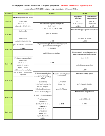 I rok Logopedii - studia stacjonarne II stopnia, specjalność - wczesna interwencja logopedyczna semestr letni 2014/2015, zajęcia rozpoczynają się 12 marca 2015 r. Godzina Wtorek Poniedziałek Środa Dysfunkcje narządu żucia 8:00-9:30 8:00-10:30 16, 23. 03. 15 r. zaliczenie - 27. 03. 15 r. Przedmiot medyczny do wyboru 8:45-11:15 17, 24, 31. 03.; 21, 28. 04. 15 r. ćwiczenia Gr. II dr B. Kamińska s. 101a prof. E. Czaplewska s. 105 Przedmiot logopedyczny do wyboru lek. stom. B. Siebert 10:45-12:15 16, 23, 30. 03.; 13. 04. 15 r. s. 102 s. 102 prof. M. Prośba-Mackiewicz Diagnoza i terapia dziecka z mózgowym porażeniem dziecięcym s. 101b 11:30-14:00 dr K. Kaczorowska-Bray Wspomaganie rozwoju mowy przy wczesnym uszkodzeniu mózgu 12:15-14:45 Podstawy neonatologii 13:15-15:45 13:15-14:45 Seminarium magisterskie prof. T. Wierzba 9:45-11:15 11:30-13:00 Logopedia medialna s. 105 23, 30. 03. 15 r. dr K. Kaczorowska-Bray 13, 20, 27. 04. 15 r. Szpital, Gdańsk s. 105 ul. Kliniczna 1a, sala C, II p. doc. dr med. I. DomżalskaPopadiuk 15:00-16:30 Wybrane zagadnienia z neuroanatomii, neurofizjologii i patologii mowy Badanie neurologiczne noworodka 15:00-17:15 15:00-19:00 17, 24, 31. 03.; 14. 04. 15 r. 28. 04. 15 r. dr A. Walencik-Topiłko prof. E. Pilarska s. 102 Metodyka emisji głosu GUMed, budynek Collegium Biomedicum, Seminarium magisterskie Zakład Anatomii, I piętro dr med. J. Dziewiątkowski 16:45-18:15 21. 04.; 5, 19. 05. 15 r. 16:45-19:15 12, 26. 05. 15 r. 18:30-20:00 prof. S. Milewski Psychoterapia 15:00-17:30 17:30-20:00 14. 04. 15 r. mgr L. Lewińska s. 101a s. 101b s. 101a I rok Logopedii - studia stacjonarne II stopnia, specjalność - wczesna interwencja logopedyczna semestr letni 2014/2015, zajęcia rozpoczynają się 12 marca 2015 r. Czwartek Godzina 8:00-9:30 9:45-11:15 11:30-13:00 Piątek Zaburzenia głosu diagnoza i terapia Ćwiczenia głosowe 26. 03.; 9. 04. 15 r. 7, 14, 21, 28. 05. 15 r. dr G. Kołodziej s. 105 dr G. Kołodziej s. 105 Logopedia medialna Gr. I Seminarium magisterskie 12, 19. 03.; 2, 16, 23, 30. 04.; 12, 19. 03.; 2, 16, 23. 04.; Neurpsychologiczny, socjologiczny, rehabilitacyjny kontekst zaburzeń mowy dr B. Kamińska 30. 04.; 7, 21, 28. 05. 15 r. dr B. Łukaszewska s. 101a prof. E. Łuczyński s. 101b Zaburzenia głosu diagnoza i terapia Seminarium magisterskie 11:30-14:00 26. 03.; 9. 04.; 12, 19. 03.; 2, 16, 23, 14. 05. 15 r. 2, 16, 23, 30. 04. 15 r. 7, 28. 05. 15 r. 30. 04.; 7, 21. 05. 15 r. 11:30-13:00 prof. E. Łuczyński Seminarium magisterskie 28. 05. 15 r. 13:15-14:45 dr G. Kołodziej s. 105 prof. M. Rocławska-Daniluk s. 104 15:00-16:30 Wybrane zagadnienia z neuroanatomii, neurofizjologii i patologii mowy Seminarium magisterskie GUMed, budynek Collegium Biomedicum 15:00-17:15 sala seminaryjna A1 konieczne fartuchy (mogą być jednorazowe), wskazane rękawiczki jednorazowe lateksowe prof. J. Kuczkowski dr med. S. Wójcik 16:45-18:15 18:30-20:00 Gr. W1 Gr. W2 15:30-17.00, 9. 04. 15 r. 17:15-18:45, 9. 04. 15 r. 17:15-18:45, 16. 04. 15 r. 15:30-17:00, 16. 04. 15 r. s. 101b