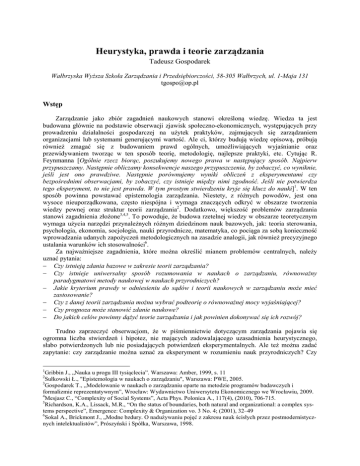 Heurystyka, prawda i teorie zarządzania Tadeusz Gospodarek Wałbrzyska Wyższa Szkoła Zarządzania i Przedsiębiorczości, 58-305 Wałbrzych, ul. 1-Maja 131 [email protected] Wstęp Zarządzanie jako zbiór zagadnień naukowych stanowi określoną wiedzę. Wiedza ta jest budowana głównie na podstawie obserwacji zjawisk społeczno-ekonomicznych, występujących przy prowadzeniu działalności gospodarczej na użytek praktyków, zajmujących się zarządzaniem organizacjami lub systemami generującymi wartość. Ale ci, którzy budują wiedzę opisową, próbują również zmagać się z budowaniem prawd ogólnych, umożliwiających wyjaśnianie oraz przewidywaniem tworząc w ten sposób teorię, metodologię, najlepsze praktyki, etc. Cytując R. Feynmanna [Ogólnie rzecz biorąc, poszukujemy nowego prawa w następujący sposób. Najpierw przypuszczamy. Następnie obliczamy konsekwencje naszego przypuszczenia, by zobaczyć, co wyniknie, jeśli jest ono prawdziwe. Następnie porównujemy wyniki obliczeń z eksperymentami czy bezpośrednimi obserwacjami, by zobaczyć, czy istnieje między nimi zgodność. Jeśli nie potwierdza tego eksperyment, to nie jest prawda. W tym prostym stwierdzeniu kryje się klucz do nauki]1. W ten sposób powinna powstawać epistemologia zarządzania. Niestety, z różnych powodów, jest ona wysoce nieuporządkowana, często niespójna i wymaga znaczących odkryć w obszarze tworzenia wiedzy pewnej oraz struktur teorii zarządzania2. Dodatkowo, większość problemów zarządzania stanowi zagadnienia złożone3,4,5. To powoduje, że budowa rzetelnej wiedzy w obszarze teoretycznym wymaga użycia narzędzi przynależnych różnym dziedzinom nauk bazowych, jak: teoria sterowania, psychologia, ekonomia, socjologia, nauki przyrodnicze, matematyka, co pociąga za sobą konieczność wprowadzania udanych zapożyczeń metodologicznych na zasadzie analogii, jak również precyzyjnego ustalania warunków ich stosowalności6. Za najważniejsze zagadnienia, które można określić mianem problemów centralnych, należy uznać pytania: − Czy istnieją zdania bazowe w zakresie teorii zarządzania? − Czy istnieje uniwersalny sposób rozumowania w naukach o zarządzaniu, równoważny paradygmatowi metody naukowej w naukach przyrodniczych? − Jakie kryterium prawdy w odniesieniu do sądów i teorii naukowych w zarządzaniu może mieć zastosowanie? − Czy z danej teorii zarządzania można wybrać podteorię o równoważnej mocy wyjaśniającej? − Czy prognoza może stanowić zdanie naukowe? − Do jakich celów powinny dążyć teorie zarządzania i jak powinien dokonywać się ich rozwój? Trudno zaprzeczyć obserwacjom, że w piśmiennictwie dotyczącym zarządzania pojawia się ogromna liczba stwierdzeń i hipotez, nie mających zadowalającego uzasadnienia heurystycznego, słabo potwierdzonych lub nie posiadających potwierdzeń eksperymentalnych. Ale też można zadać zapytanie: czy zarządzanie można uznać za eksperyment w rozumieniu nauk przyrodniczych? Czy 1 Gribbin J., „Nauka u progu III tysiąclecia”. Warszawa: Amber, 1999, s. 11 Sułkowski Ł., "Epistemologia w naukach o zarządzaniu", Warszawa: PWE, 2005. 3 Gospodarek T., „Modelowanie w naukach o zarządzaniu oparte na metodzie programów badawczych i formalizmie reprezentatywnym”, Wrocław: Wydawnictwo Uniwersytetu Ekonomicznego we Wrocławiu, 2009. 4 Mesjasz C., “Complexity of Social Systems”, Acta Phys. Polonica A., 117(4), (2010), 706-715. 5 Richardson, K.A., Lissack, M.R., “On the status of boundaries, both natural and organizational: a complex systems perspective”, Emergence: Complexity & Organization vo. 3 No. 4; (2001), 32–49 6 Sokal A., Brickmont J., „Modne bzdury. O nadużywaniu pojęć z zakresu nauk ścisłych przez postmodernistycznych intelektualistów”, Prószyński i Spółka, Warszawa, 1998. 2 Prace Naukowe Wałbrzyskiej Wyższej Szkoły Zarządzania i Przedsiębiorczości – Seria Zarządzanie, 2012 eksperymentem jest nieodwracalne wywołanie skutku w czasie przyszłym w nieokreślonym w sposób kompletny otoczeniu, zwłaszcza podejmowanie decyzji w niepewności? W dodatku rozdzielenie podmiotu od przedmiotu poznania nie jest zawsze możliwe, co znacząco komplikuje odpowiedzi na postawione kwestie2,7,8. A ponieważ problemów o nieustalonej kwalifikacji ontycznej lub epistemologii w teorii zarządzania występuje znacznie więcej, stąd powrót do dyskusji na poziomie podstaw filozofii nauki wydaje się być konieczny, choćby dla uporządkowania dalszego rozwoju nauk o zarządzaniu. Obserwacyjną przesłanką pozostaje fakt, że ostatni kryzys mocno nadszarpnął reputację wiedzy oferowanej przez różne teorie i koncepcje ekonomiczne ale szczególnie mocno uderzył w zarządzanie strategiczne2,8,9,10 Niniejsza praca ma na celu przedstawienie wybranych zagadnień centralnych budowania wiedzy wysokoprawdopodobnej oraz formułowania sądów naukowych w zakresie problematyki zarządzania z pozycji epistemologa, dopuszczającego wnioskowanie rozmyte i pragmatyczne kryterium prawdy jako fundamentu spójnej teorii. Szerzej na temat struktury nauk o zarządzaniu, wywodzącej się z koncepcji ontologicznych i epistemologii pozostającej w relacji do bytów abstrakcyjnych, prowadzącej do spójności sądów napisałem w pracy „Aspekty złożoności i filozofii nauki w zarządzaniu”. Sądy o faktach w teorii zarządzania J. Watkins, w swojej książce „Nauka a sceptycyzm” zaproponował układ pięciu poziomów sądów o faktach, które w odniesieniu do teorii zarządzania należy uzupełnić o dodatkową, związaną z prognozowaniem11. Układ ten można przedstawić następująco: − Poziom 0 – komunikaty postrzeżeniowe, wypowiadane w pierwszej osobie, typu „tu i teraz”, np. „Mam przed sobą projekt budżetu na rok 2012”, „Właśnie przyszedł dyrektor oddziału”. − Poziom 1 – jednostkowe sądy o obserwowalnych przedmiotach lub zdarzeniach,
