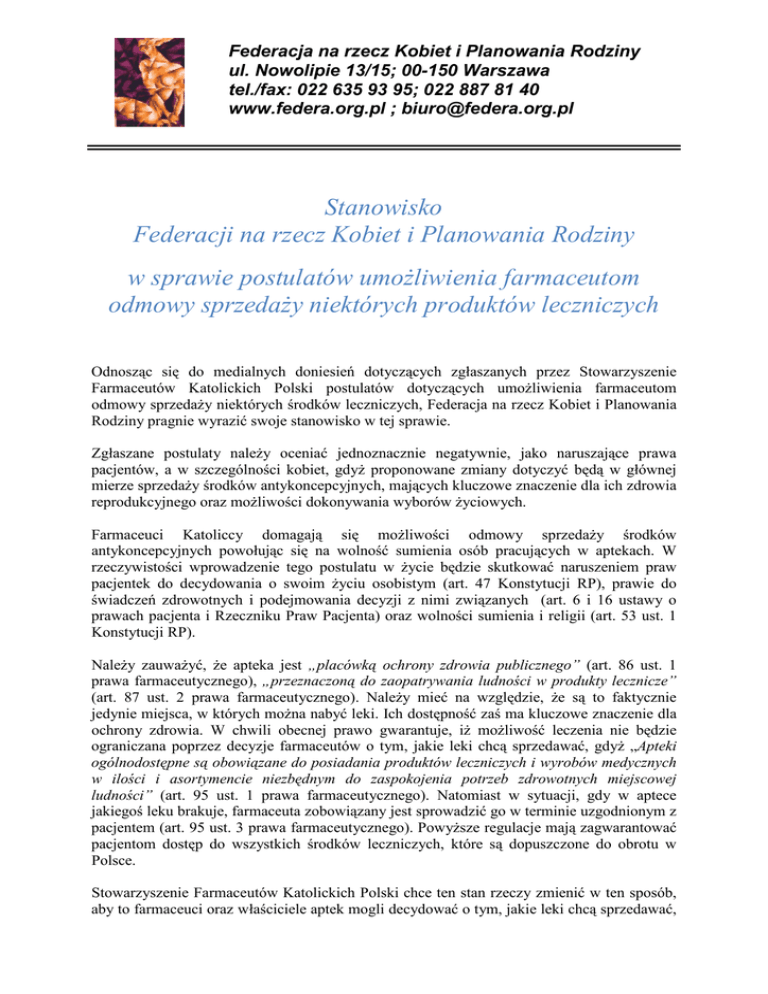 Federacja na rzecz Kobiet i Planowania Rodziny ul. Nowolipie 13/15; 00-150 Warszawa tel./fax: 022 635 93 95; 022 887 81 40 www.federa.org.pl ; [email protected] Stanowisko Federacji na rzecz Kobiet i Planowania Rodziny w sprawie postulatów umoŜliwienia farmaceutom odmowy sprzedaŜy niektórych produktów leczniczych Odnosząc się do medialnych doniesień dotyczących zgłaszanych przez Stowarzyszenie Farmaceutów Katolickich Polski postulatów dotyczących umoŜliwienia farmaceutom odmowy sprzedaŜy niektórych środków leczniczych, Federacja na rzecz Kobiet i Planowania Rodziny pragnie wyrazić swoje stanowisko w tej sprawie. Zgłaszane postulaty naleŜy oceniać jednoznacznie negatywnie, jako naruszające prawa pacjentów, a w szczególności kobiet, gdyŜ proponowane zmiany dotyczyć będą w głównej mierze sprzedaŜy środków antykoncepcyjnych, mających kluczowe znaczenie dla ich zdrowia reprodukcyjnego oraz moŜliwości dokonywania wyborów Ŝyciowych. Farmaceuci Katoliccy domagają się moŜliwości odmowy sprzedaŜy środków antykoncepcyjnych powołując się na wolność sumienia osób pracujących w aptekach. W rzeczywistości wprowadzenie tego postulatu w Ŝycie będzie skutkować naruszeniem praw pacjentek do decydowania o swoim Ŝyciu osobistym (art. 47 Konstytucji RP), prawie do świadczeń zdrowotnych i podejmowania decyzji z nimi związanych (art. 6 i 16 ustawy o prawach pacjenta i Rzeczniku Praw Pacjenta) oraz wolności sumienia i religii (art. 53 ust. 1 Konstytucji RP). NaleŜy zauwaŜyć, Ŝe apteka jest „placówką ochrony zdrowia publicznego” (art. 86 ust. 1 prawa farmaceutycznego), „przeznaczoną do zaopatrywania ludności w produkty lecznicze” (art. 87 ust. 2 prawa farmaceutycznego). NaleŜy mieć na względzie, Ŝe są to faktycznie jedynie miejsca, w których moŜna nabyć leki. Ich dostępność zaś ma kluczowe znaczenie dla ochrony zdrowia. W chwili obecnej prawo gwarantuje, iŜ moŜliwość leczenia nie będzie ograniczana poprzez decyzje farmaceutów o tym, jakie leki chcą sprzedawać, gdyŜ „Apteki ogólnodostępne są obowiązane do posiadania produktów leczniczych i wyrobów medycznych w ilości i asortymencie niezbędnym do zaspokojenia potrzeb zdrowotnych miejscowej ludności” (art. 95 ust. 1 prawa farmaceutycznego). Natomiast w sytuacji, gdy w aptece jakiegoś leku brakuje, farmaceuta zobowiązany jest sprowadzić go w terminie uzgodnionym z pacjentem (art. 95 ust. 3 prawa farmaceutycznego). PowyŜsze regulacje mają zagwarantować pacjentom dostęp do wszystkich środków leczniczych, które są dopuszczone do obrotu w Polsce. Stowarzyszenie Farmaceutów Katolickich Polski chce ten stan rzeczy zmienić w ten sposób, aby to farmaceuci oraz właściciele aptek mogli decydować o tym, jakie leki chcą sprzedawać, a co za tym idzie, jakie leki będą mogli kupować pacjenci. W sposób szczególny ograniczenie to będzie godzić w pacjentki, gdyŜ to ich w największym stopniu dotyczą postulowane zmiany w dostępie do środków antykoncepcyjnych. Byłaby to sytuacja niedopuszczalna, w której farmaceuci wykorzystywaliby swoją pozycję monopolistów w zakresie sprzedaŜy detalicznej leków w celu narzucenia kobietom własnych poglądów religijnych. Postulaty farmaceutów są wynikiem postawienia na swoistej szali ich konstytucyjnej wolności sumienia i religii (która miałaby być chroniona poprzez niezmuszanie ich do działań sprzecznych z sumieniem) oraz prawa pacjentów do uzyskania środków leczniczych przepisanych przez lekarza w powiązaniu z ich konstytucyjnym prawami do decydowania o własnym Ŝyciu, do poszanowania ich Ŝycia prywatnego oraz do swobody dokonywania wyborów w Ŝyciu osobistym. Wszystkie powyŜsze prawa wynikają z Konstytucji RP i są prawami człowieka i obywatela. Projektowane zmiany stawiają jedno konstytucyjne prawo ponad innymi. Gdyby postulowane zmiany zostały wprowadzone oznaczałoby to, Ŝe wolność sumienia farmaceutów jest chroniona kosztem praw innych obywateli. Fakt przynaleŜności do określonej grupy zawodowej jest rezultatem pewnego wyboru – w tym takŜe poddania się odpowiednim restrykcjom wynikającym z określonych przepisów (tu: prawa farmaceutycznego). Niedopuszczalne jest chronienie części określonej grupy zawodowej w tak szerokim zakresie, jeśli niesie to za sobą tak istotne ograniczenie konstytucyjnych praw ogółu społeczeństwa. W sytuacjach swoistego konfliktu praw naleŜy zwrócić uwagę na zasadę proporcjonalności, która poprzez wprowadzenie postulowanych zmian zostałaby naruszona. Ten sam tok rozumowania moŜna przeprowadzić na gruncie obowiązywania Europejskiej Konwencji o Ochronie Praw Człowieka i Podstawowych Wolności. W wyroku w sprawie Pichon and Sajous p-ko Francji dotyczącej farmaceutów, którzy odmówili sprzedaŜy tabletek hormonalnych, Europejski Trybunał Praw Człowieka uznał, iŜ ich zachowanie nie podlega ochronie na podstawie art. 9 Europejskiej Konwencji o Ochronie Praw Człowieka i Podstawowych Wolności (wolność myśli, sumienia i wyznania). Takie stanowisko Trybunału jest ugruntowane w innym orzecznictwie. W jego świetle naleŜy stwierdzić, Ŝe Trybunał konsekwentnie stoi na stanowisku, Ŝe nie kaŜde zachowanie motywowane przekonaniami znajduje się pod ochroną wolności myśli, sumienia i wyznania. Szczególnie dotyczy to sytuacji, w których ochrona tej wolności stoi w sprzeczności z ochroną praw innych osób równieŜ wynikających z Konwencji (np. prawa do poszanowania Ŝycia rodzinnego i prywatnego wyraŜonego w art. 8). NaleŜy równieŜ krytycznie odnieść się do argumentów dotyczących drugiego elementu wolności sumienia i religii. Mając na względzie, Ŝe obejmuje ona „wyznawanie lub przyjmowanie religii według własnego wyboru oraz uzewnętrznianie indywidualnie lub z innymi, publicznie lub prywatnie, swojej religii przez uprawianie kultu, modlitwę, uczestniczenie w obrzędach, praktykowanie i naucza