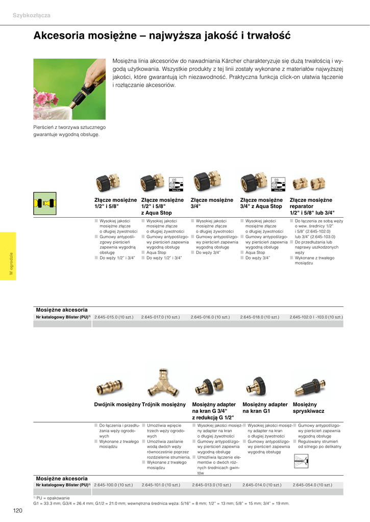Szybkozłącza Akcesoria mosiężne – najwyższa jakość i trwałość Mosiężna linia akcesoriów do nawadniania Kärcher charakteryzuje się dużą trwałością i wygodą użytkowania. Wszystkie produkty z tej linii zostały wykonane z materiałów najwyższej jakości, które gwarantują ich niezawodność. Praktyczna funkcja click-on ułatwia łączenie i rozłączanie akcesoriów. Pierścień z tworzywa sztucznego gwarantuje wygodną obsługę. Złącze mosiężne Złącze mosiężne 1/2" i 5/8" 1/2" i 5/8" z Aqua Stop Złącze mosiężne 3/4" W ogrodzie Wysokiej jakości Złącze mosiężne 3/4" z Aqua Stop Wysokiej jakości Wysokiej jakości mosiężne złącze mosiężne złącze mosiężne złącze o długiej żywotności o długiej żywotności o długiej żywotności Gumowy antypośli- Gumowy antypoślizgo- Gumowy antypoślizgozgowy pierścień wy pierścień zapewnia wy pierścień zapewnia zapewnia wygodną wygodną obsługę wygodną obsługę Aqua Stop Do węży 3/4” obsługę Do węży 1/2” i 3/4” Do węży 1/2” i 3/4” Wysokiej jakości 2.645-015.0 (10 szt.) 2.645-018.0 (10 szt.) Złącze mosiężne reparator 1/2" i 5/8" lub 3/4" Do łączenia ze sobą węży mosiężne złącze o wew. średnicy 1/2” o długiej żywotności i 5/8” (2.645-102.0) Gumowy antypoślizgolub 3/4” (2.645-103.0) wy pierścień zapewnia Do przedłużania lub naprawy uszkodzonych wygodną obsługę Aqua Stop węży Do węży 3/4” Wykonane z trwałego mosiądzu Mosiężne akcesoria Nr katalogowy Blister (PU)1) 2.645-017.0 (10 szt.) Dwójnik mosiężny Trójnik mosiężny 2.645-016.0 (10 szt.) Mosiężny adapter na kran G 3/4" z redukcją G 1/2" 2.645-102.0 I -103.0 (10 szt.) Mosiężny adapter Mosiężny na kran G1 spryskiwacz Do łączenia i przedłu- Umożliwia wpięcie Mosiężne akcesoria Wysokiej jakości mosięż- Wysokiej jakości mosięż- Gumowy antypoślizgożania węży ogrodotrzech węży ogrodony adapter na kran ny adapter na kran wy pierścień zapewnia wych wych o długiej żywotności o długiej żywotności wygodną obsługę Wykonane z trwałego Umożliwia zasilanie Gumowy antypoślizgo- Gumowy antypoślizgo- Regulowany strumień mosiądzu wodą dwóch węży wy pierścień zapewnia wy pierścień zapewnia od silnego po delikatny równocześnie poprzez wygodną obsługę wygodną obsługę rozdzielenie strumienia. Umożliwia łączenie ele Wykonane z trwałego mentów o dwóch różmosiądzu nych średnicach gwintów Nr katalogowy Blister (PU)1) 2.645-100.0 (10 szt.) 2.645-101.0 (10 szt.) 2.645-013.0 (10 szt.) 2.645-014.0 (10 szt.) PU = opakowanie G1 = 33.3 mm; G3/4 = 26.4 mm; G1/2 = 21.0 mm; wewnętrzna średnica węża: 5/16” = 8 mm; 1/2” = 13 mm; 5/8” = 15 mm; 3/4” = 19 mm. 1) 120 2.645-054.0 (10 szt.)