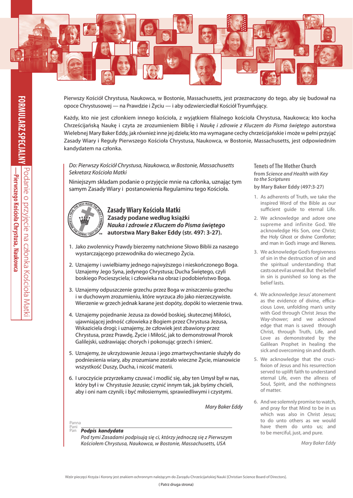FORMULARZ SPECJALNY Pierwszy Kościół Chrystusa, Naukowca, w Bostonie, Massachusetts, jest przeznaczony do tego, aby się budował na opoce Chrystusowej — na Prawdzie i Życiu — i aby odzwierciedlał Kościół Tryumfujący. Każdy, kto nie jest członkiem innego kościoła, z wyjątkiem filialnego kościoła Chrystusa, Naukowca; kto kocha Chrześcijańską Naukę i czyta ze zrozumieniem Biblię i Naukę i zdrowie z Kluczem do Pisma świętego autorstwa Wielebnej Mary Baker Eddy, jak również inne jej dzieła; kto ma wymagane cechy chrześcijańskie i może w pełni przyjąć Zasady Wiary i Reguły Pierwszego Kościoła Chrystusa, Naukowca, w Bostonie, Massachusetts, jest odpowiednim kandydatem na członka. Podanie o przyjęcie na członka Kościoła Matki —Pierwszego Kościoła Chrystusa, Naukowca Do: Pierwszy Kościół Chrystusa, Naukowca, w Bostonie, Massachusetts Sekretarz Kościoła Matki Niniejszym składam podanie o przyjęcie mnie na członka, uznając tym samym Zasady Wiary i postanowienia Regulaminu tego Kościoła. Zasady podane według książki Nauka i zdrowie z Kluczem do Pisma świętego autorstwa Mary Baker Eddy (str. 497: 3-27). 1. Jako zwolennicy Prawdy bierzemy natchnione Słowo Biblii za naszego wystarczającego przewodnika do wiecznego Życia. 2. Uznajemy i uwielbiamy jednego najwyższego i nieskończonego Boga. Uznajemy Jego Syna, jedynego Chrystusa; Ducha Świętego, czyli boskiego Pocieszyciela; i człowieka na obraz i podobieństwo Boga. 3. Uznajemy odpuszczenie grzechu przez Boga w zniszczeniu grzechu i w duchowym zrozumieniu, które wyrzuca zło jako nierzeczywiste. Wierzenie w grzech jednak karane jest dopóty, dopóki to wierzenie trwa. Uznajemy pojednanie Jezusa za dowód boskiej, skutecznej Miłości, ujawniającej jedność człowieka z Bogiem przez Chrystusa Jezusa, Wskaziciela drogi; i uznajemy, że człowiek jest zbawiony przez Chrystusa, przez Prawdę, Życie i Miłość, jak to demonstrował Prorok Galilejski, uzdrawiając chorych i pokonując grzech i śmierć. 5. Uznajemy, że ukrzyżowanie Jezusa i jego zmartwychwstanie służyły do podniesienia wiary, aby zrozumiane zostało wieczne Życie, mianowicie wszystkość Duszy, Ducha, i nicość materii. 6. I uroczyście przyrzekamy czuwać i modlić się, aby ten Umysł był w nas, który był i w Chrystusie Jezusie; czynić innym tak, jak byśmy chcieli, aby i oni nam czynili; i być miłosiernymi, sprawiedliwymi i czystymi. Mary Baker Eddy Panna Pani Pan Podpis from Science and Health with Key to the Scriptures by Mary Baker Eddy (497:3-27) 1. As adherents of Truth, we take the inspired Word of the Bible as our sufficient guide to eternal Life. Zasady Wiary Kościoła Matki 4. Tenets of The Mother Church kandydata Pod tymi Zasadami podpisują się ci, którzy jednoczą się z Pierwszym Kościołem Chrystusa, Naukowca, w Bostonie, Massachusetts, USA 2. We acknowledge and adore one supreme and infinite God. We acknowledge His Son, one Christ; the Holy Ghost or divine Comforter; and man in God’s image and likeness. 3. We acknowledge God’s forgiveness of sin in the destruction of sin and the spiritual understanding that casts out evil as unreal. But the belief in sin is punished so long as the belief lasts. 4. We acknowledge Jesus’ atonement as the evidence of divine, effica cious Love, unfolding man’s unity with God through Christ Jesus the Way-shower; and we acknowl edge that man is saved through Christ, through Truth, Life, and Love as demonstrated by the Galilean Prophet in healing the sick and overcoming sin and death. 5.We acknowledge that the cruci fixion of Jesus and his resurrection served to uplift faith to understand eternal Life, even the allness of Soul, Spirit, and the nothingness of matter. 6. And we solemnly promise to watch, and pray for that Mind to be in us which was also in Christ Jesus; to do unto others as we would have them do unto us; and to be merciful, just, and pure. Wzór pieczęci Krzyża i Korony jest znakiem ochronnym należącym do Zarządu Chrześcijańskiej Nauki [Christian Science Board of Directors]. ( Patrz druga strona) Mary Baker Eddy FORMULARZ SPECJALNY Do kandydata: Twoje imię i nazwisko oraz adres będą używane zarówno przez Sekretarza jak i Skarbnika Kościoła Matki. Jeśli ponownie składasz podanie o członkostwo a twoje nazwisko się zmieniło, prosimy o podanie poprzedniego nazwiska. Prosimy o czytelne wpisy. Imię i nazwisko Panna Pani Pan Panna Poprzednie nazwisko Pani Pan Podanie o przyjęcie na członka Kościoła Matki —Pierwszego Kościoła Chrystusa, Naukowca Adres pocztowy (ulica z numerem domu i mieszkania lub skrytka pocztowa) Miasto lub miejscowość Stan lub prowincja Kraj Numer kodu pocztowego Telefon E-mail Moim nauczycielem Chrześcijańskiej Nauki był Panna Pani Pan Status nauczyciela Nie jestem członkiem żadnego kościoła, z wyjątkiem Naukowca w (imię i nazwisko nauczyciela) Kościoła Chrystusa, . Poprzednio byłem/am wyznania , ale definitywnie od niego odszedłem/odeszłam. Do kandydata i rekomendujących go/ją członków Kościoła Matki: Prosimy o uważne przejrzenie tej części Statutu Kościoła Matki autorstwa Mary Baker Eddy, która omawia „Członkostwo w Kościele” i zawiera instrukcje w jaki sposób wypełnić formularze podań (str. 34-39 i 109-112). Rozpatrywane będą tylko te podania, które zostały prawidłowo wypełnione. W przypadku, gdy kandydat jest niepełnoletni, wymagana jest zgoda jednego z rodziców lub opiekuna prawnego. My, niżej podpisani członkowie Kościoła Matki, rekomendujemy tego kandydata. Data Panna Pani Pan Podpis osoby popierającej kandydata Panna Pani Pan Imię i nazwisko osoby popierającej kandydata — Panna Pani Pan Podpis osoby popierającej kandydata Panna Pani Pan Imię i nazwisko osoby popierającej kandydata — Panna Pani Pan Podpis osoby popierającej kandydata Panna Pani Pan Imię i nazwisko osoby popierającej kandydata — czytelnie czytelnie czytel
