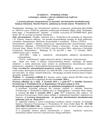 STAROSTA WODZISŁAWSKI wykonujący zadanie z zakresu administracji rządowej ogłasza I przetarg pisemny nieograniczony na sprzedaż nieruchomości niezabudowanej będącej własnością Skarbu Państwa położonej na terenie miasta Wodzisławia Śl. Przedmiotem przetargu jest nieruchomość gruntowa oznaczona geodezyjnie jako działka nr 2904/332 o pow. 0.0245 ha, jednostka ewidencyjna Wodzisław Śląski, obręb Wodzisław, karta mapy 3, niezabudowana zapisana w księdze wieczystej GL1W/00005786/9, gdzie działy III i IV są wolne od wpisów (obciążeń). Opis nieruchomości : Działka, położona jest w Wodzisławiu Śl. pomiędzy ul. Minorytów i ul. Wałową. Stanowi enklawę, nie posiada bezpośredniego dostępu do drogi publicznej, o kształcie nieregularnym zbliżonym do prostokąta o wymiarach 8,00 m x 25,00 m. Nieruchomość zgodnie z planem miejscowym zagospodarowania przestrzennego miasta Wodzisławia Śląskiego - CENTRUM Stare Miasto z obrzeżami - II etap, zatwierdzonym Uchwalą Rady Miasta Nr XXV/315/2001 z dnia 30 stycznia 2001r. ogłoszoną w Dzienniku Urzędowym Województwa Śląskiego Nr 20 poz.450 z dnia 11 kwietnia 2001r. zlokalizowana jest w terenach: - 45UC/MW - usług w zabudowie staromiejskiej, zabudowy mieszkaniowej wielorodzinnej; - 176 KX - wydzielonych ciągów pieszych i placów o dominacji ruchu pieszego. oraz objęta jest strefą A ochrony konserwatorskiej obszaru wpisanego do rejestru zabytków, a zatem planowane prace ziemne na przedmiotowej nieruchomosci należy każdorazowo uzgadniać z Wojewódzkim Konserwatorem Zabytków. Cena wywoławcza nieruchomości gruntowej wynosi 38.923,00 zł (słownie: trzydzieści osiem tysięcy dziewięćset dwadzieścia trzy złote 00/100). Cena wywoławcza nieruchomości jest ceną netto, do której zostanie doliczony, obwiązujący na dzień zawarcia umowy kupnasprzedaży, podatek VAT. Wadium w wysokości 4.000,00 zł ( słownie: cztery tysiące złotych 00/100) winno być wpłacone w pieniądzu PLN najpóźniej do dnia 5 września 2016 r. Przetarg odbędzie się w dniu 9 września 2016 r. o godz.10.00 w siedzibie Starostwa Powiatowego w Wodzisławiu Śl. ul. Bogumińska 2 (II piętro pokój nr 214). Do przetargu mogą przystąpić oferenci po spełnieniu następujących warunków: 1) przesłanie przesyłką poleconą lub złożenie osobiste w siedzibie Starostwa Powiatowego w Wodzisławiu Śląskim przy ul. Bogumińskiej 2 pisemnej oferty kupna, w terminie do dnia 6 września 2016 r. godz. 13.00 (ostateczna data wpływu do Starostwa Powiatowego). Oferty należy składać w zamkniętych kopertach z dopiskiem na kopercie: „I przetarg nieograniczony na sprzedaż nieruchomości niezabudowanej położonej przy ul. Minorytów”, 2) wpłacenie wadium w wyżej wymienionej wysokości, formie i terminie na rachunek bankowy Starostwa Powiatowego w Wodzisławiu Śl. Getin Noble Bank Nr 60 1560 1094 0000 9250 0000 1368, z zaznaczeniem tytułu wpłaty. Za dzień wpłaty uznaje się dzień wpływu należności na ww. rachunek, 3) w przypadku zamiaru nabycia nieruchomości w ramach wspólności ustawowej małżeńskiej wadium winno być wniesione przez obojga małżonków. Oferta powinna zawierać: 1) imię, nazwisko i adres oferenta albo nazwę lub firmę wraz z siedzibą, jeżeli oferentem jest osoba prawna, a w przypadku cudzoziemców zgody MSWiA na nabycie nieruchomości, 2) datę sporządzenia oferty, 3) oferowaną cenę (wyższą od ceny wywoławczej) i sposób jej zapłaty, 4) kopię dowodu wniesienia wadium lub dowodu stanowiącego podstawę do zwolnienia z tego obowiązku, w przypadku osób wymienionych w §5 Rozporządzenia Rady Ministrów z dnia 14 września 2004 r. w sprawie sposobu i trybu przeprowadzania przetargów oraz rokowań na zbycie nieruchomości (Dz.U. Nr 207, poz. 2108, ze zm.), 5) numer rachunku bankowego oferenta, 6) podpis oferenta: - w przypadku osoby będącej w małżeńskiej wspólności majątkowej podpisy obydwu małżonków, - w przypadku osób prawnych podpisy osób reprezentujących, zgodnie z wpisem do właściwego rejestru, 7) zobowiązanie do pokrycia wszelkich opłat notarialnych i sądowych związanych z przeniesieniem prawa własności nieruchomości oraz zobowiązanie do zapłaty zaoferowanej ceny, pomniejszonej o wpłacone wadium, najpóźniej do dnia zawarcia umowy, 8) proponowany sposób zagospodarowania nieruchomości, 9) oświadczenie, że oferent zapoznał się z warunkami przetargu w ogłoszeniu i przyjmuje je bez zastrzeżeń. Zasady przeprowadzenia przetargu: 1) część jawna przetargu odbędzie się w dniu 9 września 2016 r. o godz. 1000 w siedzibie Starostwa Powiatowego w Wodzisławiu Śl. przy ul. Bogumińskiej 2; o wyborze oferty lub zamknięciu przetargu bez dokonania wyboru oferty, uczestnicy zostaną powiadomieni w formie pisemnej, 2) oferty złożone po terminie lub brak w ofercie dowodu wpłaty wadium albo dowodu będącego podstawą do zwolnienia z tego obowiązku (zgodnie z zapisem pkt 4 zawartości oferty) nie będą rozpatrywane, 3) wadium przepada w razie uchylenia się oferenta, który przetarg wygrał, od zawarcia notarialnej umowy kupna na warunkach określonych w ofercie albo nie uiszczenia całości ceny przed zawarciem tejże umowy; wadium złożone przez oferentów, których oferty nie zostaną przyjęte, zostanie zwrócone w terminie 3 dni od dnia rozstrzygnięcia przetargu; oferentowi, którego oferta została przyjęta wadium zostanie zaliczone na poczet ceny nabycia. Miejsce wywieszenia i publikacji ogłoszenia: strona internetowa Starostwa www.powiatwodzislawski.pl; (ogłoszenia) i www.bip.powiatwodzislawski.pl (w zakładce komunikaty, ogłoszenia, obwieszczenia) oraz tablica ogłoszeń w siedzibie Starostwa Powiatowego w Wodzisławiu Śl. ul. Bogumińska 2 i Urzędu Miasta w Wodzisławiu Śl. Osoby zainteresowane mogą zapoznać się z informacjami o przedmiocie sprzedaży od poniedziałku do piątku w godz. od 8.00-14.00 osobiście w Wydziale Gospo