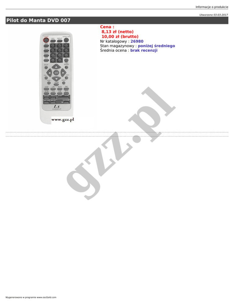 Informacje o produkcie Utworzono 03-03-2017 Pilot do Manta DVD 007 Cena : 8,13 zł (netto) 10,00 zł (brutto) gz z .p l Nr katalogowy : 26980 Stan magazynowy : poniżej średniego Średnia ocena : brak recenzji Wygenerowano w programie www.oscGold.com