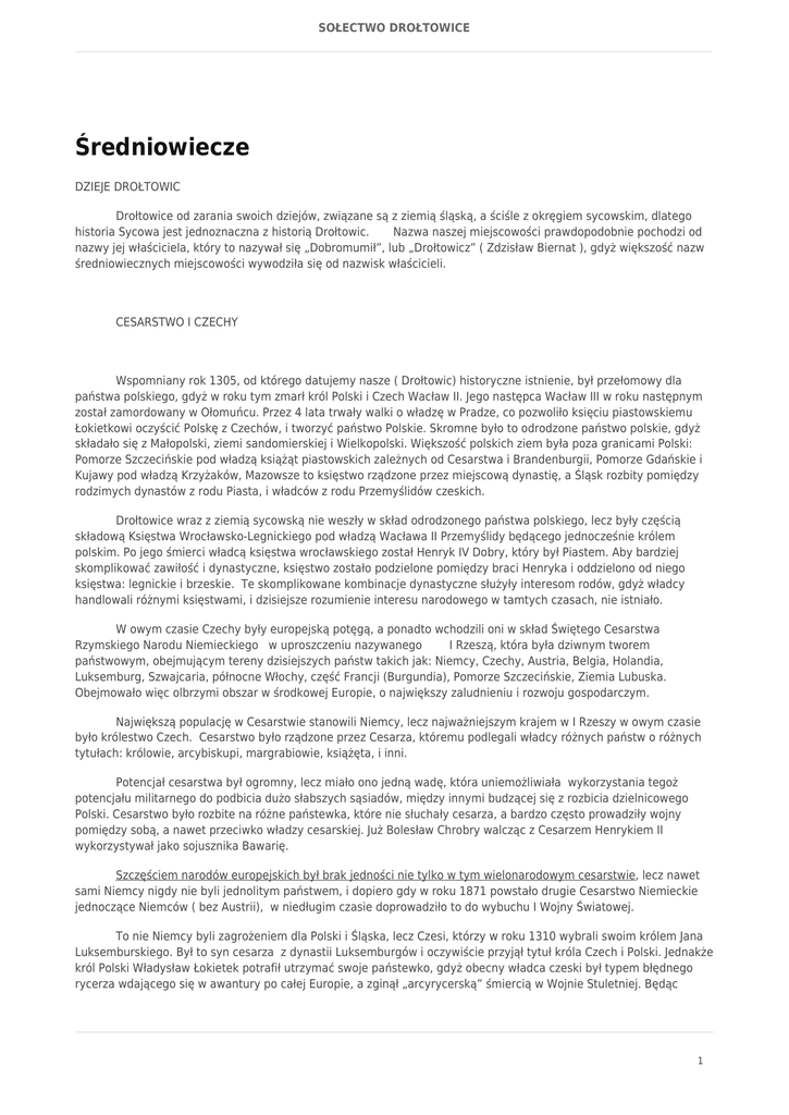 SOŁECTWO DROŁTOWICE Średniowiecze DZIEJE DROŁTOWIC Drołtowice od zarania swoich dziejów, związane są z ziemią śląską, a ściśle z okręgiem sycowskim, dlatego historia Sycowa jest jednoznaczna z historią Drołtowic. Nazwa naszej miejscowości prawdopodobnie pochodzi od nazwy jej właściciela, który to nazywał się „Dobromumił”, lub „Drołtowicz” ( Zdzisław Biernat ), gdyż większość nazw średniowiecznych miejscowości wywodziła się od nazwisk właścicieli. CESARSTWO I CZECHY Wspomniany rok 1305, od którego datujemy nasze ( Drołtowic) historyczne istnienie, był przełomowy dla państwa polskiego, gdyż w roku tym zmarł król Polski i Czech Wacław II. Jego następca Wacław III w roku następnym został zamordowany w Ołomuńcu. Przez 4 lata trwały walki o władzę w Pradze, co pozwoliło księciu piastowskiemu Łokietkowi oczyścić Polskę z Czechów, i tworzyć państwo Polskie. Skromne było to odrodzone państwo polskie, gdyż składało się z Małopolski, ziemi sandomierskiej i Wielkopolski. Większość polskich ziem była poza granicami Polski: Pomorze Szczecińskie pod władzą książąt piastowskich zależnych od Cesarstwa i Brandenburgii, Pomorze Gdańskie i Kujawy pod władzą Krzyżaków, Mazowsze to księstwo rządzone przez miejscową dynastię, a Śląsk rozbity pomiędzy rodzimych dynastów z rodu Piasta, i władców z rodu Przemyślidów czeskich. Drołtowice wraz z ziemią sycowską nie weszły w skład odrodzonego państwa polskiego, lecz były częścią składową Księstwa Wrocławsko-Legnickiego pod władzą Wacława II Przemyślidy będącego jednocześnie królem polskim. Po jego śmierci władcą księstwa wrocławskiego został Henryk IV Dobry, który był Piastem. Aby bardziej skomplikować zawiłość i dynastyczne, księstwo zostało podzielone pomiędzy braci Henryka i oddzielono od niego księstwa: legnickie i brzeskie. Te skomplikowane kombinacje dynastyczne służyły interesom rodów, gdyż władcy handlowali różnymi księstwami, i dzisiejsze rozumienie interesu narodowego w tamtych czasach, nie istniało. W owym czasie Czechy były europejską potęgą, a ponadto wchodzili oni w skład Świętego Cesarstwa Rzymskiego Narodu Niemieckiego w uproszczeniu nazywanego I Rzeszą, która była dziwnym tworem państwowym, obejmującym tereny dzisiejszych państw takich jak: Niemcy, Czechy, Austria, Belgia, Holandia, Luksemburg, Szwajcaria, północne Włochy, część Francji (Burgundia), Pomorze Szczecińskie, Ziemia Lubuska. Obejmowało więc olbrzymi obszar w środkowej Europie, o największy zaludnieniu i rozwoju gospodarczym. Największą populację w Cesarstwie stanowili Niemcy, lecz najważniejszym krajem w I Rzeszy w owym czasie było królestwo Czech. Cesarstwo było rządzone przez Cesarza, któremu podlegali władcy różnych państw o różnych tytułach: królowie, arcybiskupi, margrabiowie, książęta, i inni. Potencjał cesarstwa był ogromny, lecz miało ono jedną wadę, która uniemożliwiała wykorzystania tegoż potencjału militarnego do podbicia dużo słabszych sąsiadów, między innymi budzącej się z rozbicia dzielnicowego Polski. Cesarstwo było rozbite na różne państewka, które nie słuchały cesarza, a bardzo często prowadziły wojny pomiędzy sobą, a nawet przeciwko władzy cesarskiej. Już Bolesław Chrobry walcząc z Cesarzem Henrykiem II wykorzystywał jako sojusznika Bawarię. Szczęściem narodów europejskich był brak jedności nie tylko w tym wielonarodowym cesarstwie, lecz nawet sami Niemcy nigdy nie byli jednolitym państwem, i dopiero gdy w roku 1871 powstało drugie Cesarstwo Niemieckie jednoczące Niemców ( bez Austrii), w niedługim czasie doprowadziło to do wybuchu I Wojny Światowej. To nie Niemcy byli zagrożeniem dla Polski i Śląska, lecz Czesi, którzy w roku 1310 wybrali swoim królem Jana Luksemburskiego. Był to syn cesarza z dynastii Luksemburgów i oczywiście przyjął tytuł króla Czech i Polski. Jednakże król Polski Władysław Łokietek potrafił utrzymać swoje państewko, gdyż obecny władca czeski był typem błędnego rycerza wdającego się w awantury po całej Europie, a zginął „arcyrycerską” śmiercią w Wojnie Stuletniej. Będąc 1 SOŁECTWO DROŁTOWICE niewidomym, kazał się przywiązać do do konia i ruszył w stronę zwycięskich Anglików, krzycząc, że Król Czeski nie będzie uciekał z pola bitwy, jak to zrobili Francuzi. Prawdopodobnie, gdyby król Jan był władcą konsekwentnym, odzyskałby Polskę. Miał taką okazje w czasie wojny Łokietka z Krzyżakami, gdyż jako sojusznik Krzyżaków miał od południa zdobyć Wielkopolskę, lecz zmarudził chcąc zdobyć Świdnicę rządzoną przez Bolka II, który nie uląkł się potęgi króla Jana, i stawił mu opór. Być może ta dywersja księcia Świdnickiego, uratowała naszą Polskę od rozbioru przez Krzyżaków i Czechów. Dzięki wam Świdniczanie! Z wojny prowadzonej przeciwko dwóm potęgom, nie mogło wyniknąć niczego dobrego dla państwa polskiego, jednakże Krzyżacy poprzestali na zagarnięciu Kujaw i Ziemi Dobrzyńskiej, a król Jan nie dysponował wystarczającymi siłami, więc wycofał się spod Kalisza. Polacy wysyłali posłów do Awinionu (siedziba Papieży) i sądzili się z Krzyżakami. Papież nie wiele mógł zrobić, lecz rycerze zakonni nie wszczynali nowych wypraw na Polskę, chcąc zatrzeć negatywne wrażenie po przegranych procesach w Awinionie, a Polska tymczasem rosła w siłę, i 80 lat po wojnie z Krzyżakami i Janem Luksemburskim, w której obaj sojusznicy nie wykorzystali okazji do zniszczenia Polski, to Polacy ze swymi sojusznikami zwyciężyli po Grunwaldem. W bitwie tej po obu stronach walczyli najemnicy czescy, a późniejszy wielki wódz Husytów Czeskich Jan Źiźka z Trocnowa wsławił się walecznością po stronie polskiej. Jan Matejko uwiecznił go na swym obrazie „Bitwa po Grunwaldem”, jest to na pierwszym planie mąż wi