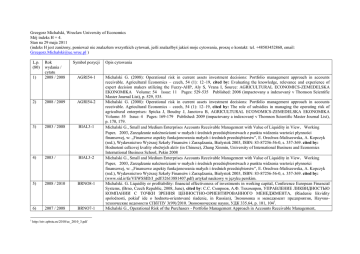 Grzegorz Michalski, Wroclaw University of Economics Mój indeks H = 4. Stan na 29 maja 2011 (indeks H jest zaniżony, ponieważ nie znalazłem wszystkich cytowań, jeśli znalazłbyś jakieś moje cytowania, proszę o kontakt: tel. +48503452860, email: [email protected] ) L.p. (80) 1 Symbol pozycji 1) Rok wydania / cytatu 2008 / 2008 2) 2008 / 2009 AGRI54-2 3) 2003 / 2008 BIAL3-1 4) 2003 / BIAL3-2 5) 2008 / 2010 BRNO8-1 6) 2007 / 2008 BRNO7-1 AGRI54-1 http://ntv.spbstu.ru/2010/ec_2010_3.pdf Opis cytowania Michalski G. (2008): Operational risk in current assets investment decisions: Portfolio management approach in accounts receivable. Agricultural Economics – czech, 54 (1): 12–19, cited by: Evaluating the knowledge, relevance and experience of expert decision makers utilizing the Fuzzy-AHP, Aly S, Vrana I, Source: AGRICULTURAL ECONOMICS-ZEMEDELSKA EKONOMIKA Volume: 54 Issue: 11 Pages: 529-535 Published: 2008 (impactovany a indexovaný v Thomson Scientific Master Journal List), p. 529, 535. Michalski G. (2008): Operational risk in current assets investment decisions: Portfolio management approach in accounts receivable. Agricultural Economics – czech, 54 (1): 12–19, cited by: The role of subsidies in managing the operating risk of agricultural enterprises: Spicka J, Boudny J, Janotova B, AGRICULTURAL ECONOMICS-ZEMEDELSKA EKONOMIKA Volume: 55 Issue: 4 Pages: 169-179 Published: 2009 (impactovany a indexovaný v Thomson Scientific Master Journal List), p. 170, 179. Michalski G., Small and Medium Enterprises Accounts Receivable Management with Value of Liquidity in View,Working Paper,2003, Zarządzanie należnościami w małych i średnich przedsiębiorstwach z punktu widzenia wartości płynności finansowej, w: „Finansowe aspekty funkcjonowania małych i średnich przedsiębiorstw”, E. Orechwa-Maliszewska, A. Kopczyk (red.), Wydawnictwo Wyższej Szkoły Finansów i Zarządzania, Białystok 2003, ISBN: 83-87256-56-0, s. 357-369. cited by: Hodnotení celkovej kvality obežných aktív (in Chinese), Zhang Xinmin, University of International Business and Economics International Business School, Pekin 2008 Michalski G., Small and Medium Enterprises Accounts Receivable Management with Value of Liquidity in View,Working Paper,2003, Zarządzanie należnościami w małych i średnich przedsiębiorstwach z punktu widzenia wartości płynności finansowej, w: „Finansowe aspekty funkcjonowania małych i średnich przedsiębiorstw”, E. Orechwa-Maliszewska, A. Kopczyk (red.), Wydawnictwo Wyższej Szkoły Finansów i Zarządzania, Białystok 2003, ISBN: 83-87256-56-0, s. 357-369. cited by: (www.sid.ir/fa/VEWSSID/J_pdf/32613881407.pdf) artykuł naukowy w języku perskim. Michalski. G. Liquidity or profitability: financial effectiveness of investments in working capital, Conference European Financial Systems, (Brno, Czech Republic, 2008, June), cited by: С.С. Смирнов, А.Ф. Тихомиров, УПРАВЛЕНИЕ ЛИКВИДНОСТЬЮ КОМПАНИИ С ТОЧКИ ЗРЕНИЯ ЦЕННОСТНО-ОРИЕНТИРОВАННОГО МЕНЕДЖМЕНТА, (Riadenie likvidity spoločnosti, pokiaľ ide o hodnotu-orientované riadenie, in Russian), Экономика и менеджмент предприятия, Научнотехнические ведомости СПбГПУ 3(99)/2010. Экономические науки, УДК 335.64, p. 101, 1041. Michalski G., Operational Risk of the Purchasers - Portfolio Management Approach in Accounts Receivable Management, 2 7) 2004 / 2005 CDW1-01 8) 2004 / 2007 CDW1-02 9) 2004 / 2006 CDW1-03 10) 2004 / 2009 CDW1-04 11) 2004 / 2008 CDW1-05 12) 2004 / 2010 CDW1-06 13) 2004 / 2007 CDW1-07 14) 2004 / 2009 CDW1-08 15) 2004 / 2006 CDW1-09 European Financial Systems, 2007, cited by: Hodnotení celkovej kvality obežných aktív (in Chinese), Zhang Xinmin, University of International Business and Economics International Business School, Pekin 2008. Michalski, G. 2004. Wartosc plynnosci w biezacym zarzadzaniu finansami, Warszawa: CeDeWu, 2004, ISBN 8387885533, cited by: Aleksander Kusak in: Weryfikacja wskazników plynnosci, Studia i Materiały – Wydział Zarządzania Uniwersytetu Warszawskiego, (2)/2005, p. 76-81, ISSN 1733-9758. Michalski G., Wartość płynności w bieżącym zarządzaniu finansami (Liquidity Value in Current Financial Management in Polish), CeDeWu, Warszawa 2004, ISBN: 9788387885533, Cited by: Prace Naukowe Instytutu Organizacji I Zarządzania Politechniki Wrocławskiej, nr 83, (25)/2007, Zastosowanie technik drążenia danych do prognozowania wpływu należności, Marcin Relich, p. 86, p. 89, ISSN: 0324-9468. Michalski G., Wartość płynności w bieżącym zarządzaniu finansami (Liquidity Value in Current Financial Management in Polish), CeDeWu, Warszawa 2004, ISBN: 9788387885533, Cited by: Czyżkowska Magdalena, Cash pooling jako zaawansowana metoda zarządzania zasobami finansowymi, „Studenckie Prace Prawnicze Administratywistyczne i Ekonomiczne, pod red. M. Winiarskiego (ISSN 1733-5779), T. 4, 2006, s. 9- 20, Magdalena Czyzkowska, w: Cash Polling jako zaawansowana metoda zarządzania zasobami finansowymi, p. 9, 12, 20. Michalski G., Wartość płynności w bieżącym zarządzaniu finansami (Liquidity Value in Current Financial Management in Polish), CeDeWu, Warszawa 2004, ISBN: 9788387885533, cited by: Marcin Musiałek, Długość cyklu obrotowego i finansowego a efektywność funkcjonowania firmy na przykładzie branży motoryzacyjnej, Politechnika Gdańska, Wydział Zarządzania i Ekonomii, Katedra Finansów, Gdańsk 2009, p. 60,61,2032. Michalski G., Wartość płynności w bieżącym zarządzaniu finansami (Liquidity Value in Current Financial Management in Polish), CeDeWu, Warszawa 2004, ISBN: 9788387885533, Cited by: Mirosław Wasilewski, Agnieszka Gałecka, Płynność finansowa gospodarstw rolniczych położonych w województwie lubelskim, Zeszyty naukowe Szkoły Głównej Gospodarstwa Wiejskiego w Warsz