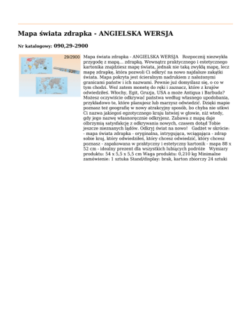 Mapa świata zdrapka - ANGIELSKA WERSJA Nr katalogowy: 090,29-2900 Mapa świata zdrapka - ANGIELSKA WERSJA Rozpocznij niezwykła przygodę z mapą… zdrapką. Wewnątrz praktycznego i estetycznego kartonika znajdziesz mapę świata, jednak nie taką zwykłą mapę, lecz mapę zdrapkę, która pozwoli Ci odkryć na nowo najdalsze zakątki świata. Mapa pokryta jest ścieralnym nadrukiem z nałożonymi granicami państw i ich nazwami. Pewnie już domyślasz się, o co w tym chodzi. Weź zatem monetę do ręki i zaznacz, które z krajów odwiedziłeś. Włochy, Egit, Gruzja, USA a może Antigua i Barbuda? Możesz oczywiście odkrywać państwa według własnego upodobania, przykładowo te, które planujesz lub marzysz odwiedzić. Dzięki mapie poznasz też geografię w nowy atrakcyjny sposób, bo chyba nie utkwi Ci nazwa jakiegoś egzotycznego kraju łatwiej w głowie, niż wtedy, gdy jego nazwę własnoręcznie odkryjesz. Zabawa z mapą daje olbrzymią satysfakcję z odkrywania nowych, czasem dotąd Tobie jeszcze nieznanych lądów. Odkryj świat na nowo! Gadżet w skrócie: - mapa świata zdrapka - oryginalna, intrygująca, wciągająca - zdrap sobie kraj, który odwiedziłeś, który chcesz odwiedzić, który chcesz poznasz - zapakowana w praktyczny i estetyczny kartonik - mapa 88 x 52 cm - idealny prezent dla wszystkich lubiących podróże Wymiary produktu: 54 x 5,5 x 5,5 cm Waga produktu: 0,210 kg Minimalne zamówienie: 1 sztuka Stand/display: brak, karton zbiorczy 24 sztuki