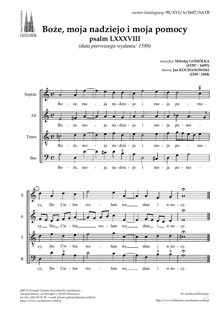 numer katalogowy: 98/XVI/A/0607/SATB BoŜe, moja nadziejo i moja pomocy psalm LXXXVIII (data pierwszego wydania: 1580) muzyka: Mikołaj GOMÓŁKA (1535? - 1609?) słowa: Jan KOCHANOWSKI (1530 - 1584) &c ˙ Sopran Bo &c ˙ Alt Bo V c #˙ Tenor Bo ?c ˙ Bas & œ S cy, A V œ cy, B Do Ŝe, - #œ œ Ŝe, mo - - Ŝe, mo œ - mo - œ - ? œ cy, Do mo œ œ Ŝe, œ Cie - bie & œ œ œ œ œ œ œ cy, T œ œ œ œ œ - œ Bo 5 œ œ wo Do œ Cie - bie wo ˙ Do Cie - bie wo œb œ na - dzie - jo ˙ 2007 © Związek Chórów Kościelnych Caecilianum Zarząd Główny: ul. Dewajtis 3 , 01-815 Warszawa tel./fax: (22) 561 01 38 , e-mail: [email protected] http://www.caecilianum.webd.pl i œ œ œ œ œ ˙ # œ œ ˙ mo - ja po - œ bœ œ œ œ œ œ œ œ œ. œ œ œ œ œ ˙ po - mo œ # œ œ œb i mo - ja po ja na - dzie - jo na - dzie - jo œ - œ ˙ łam wo - łam œ we œ œ we - łam œ we - łam we œ œ i œ œ dnie #œ mo - ja œ i - ˙ œ œ œ po - mo U w dnie i œb w no - cy. dnie i w no - cy. œ œ - w w no - cy. œ mo - U i œ œ - j œ w no - cy. œ œ œ œ œ œ dnie mo - œ mo - ja ja na - dzie - jo œ i ja œ œ œ œ œ œ œ ja ˙ Cie - bie œ - œ ˙ œ œb #U w U w Do uŜytku publicznego. http://www.biblioteka.caecilianum.webd.pl psalm LXXXVIII - Mikołaj GOMÓŁKA PSALM LXXXVIII Domine, Deus salutis meae 1. BoŜe, moja nadziejo i moja pomocy! Do Ciebie wołam we dnie i w nocy: 2. Niechaj miejsce u Ciebie mają prośby moje, Skłoń ku mnie ucho łaskawe swoje! 3. Nieszczęście duszę trapi, troski nie masz miary, śywot juŜ widzi prawie swe mary. 4. Ciało zgoła juŜ martwe, sił nie czuję w sobie, Myśl moja wszytka tylko o grobie, 5. LeŜę jako zabity, pod ziemię włoŜony, Od Ciebie i od świata wzgardzony. 6. Ponurzyłeś mię w srogiej otchłani podziemnej, Ponurzy łeś mię w przepaści ciemnej. 7. Zmocniły się nade mną Twe zapalczywości, Przywiodłeś na mię swe nawałności. 8. Odraziłeś ode mnie przyjacioły wszytki, Jestem w ich oczu na podziw brzydki, 9. Siedzę jako w okowach, wyszcia nie na j duję, Oczu prze zbytni swój płacz nie czuję. 10. Przedsię ja, Panie, dokąd świeci dzień na niebie, Wołam i ręce ściągam do Ciebie. 11. Czy umarłym cuda chcesz okazować? Czyli Umarli wstawszy będą Cię czcili? 12. Czy dobroć Twoja w grobiech będzie powiadana Albo pod ziemią prawda wyznana? 13. Czy Twoje sprawiedliwość i Twe sprawy dziwne Wspominać mogą kraje nieŜywne? 14. Ciebie ja przedsię wzywam, do Ciebie, mój Panie, Nigdy mej prośby głos nie ustanie. 15. BoŜe mój, przecz odrzucasz smętną duszę moję I twarz ode mnie odwracasz swoję? 16. Troski mię z lat namłodszych moich naszladują, Twoje mię cięŜkie strachy zejmują. 17. Twój mię gniew, zapalczywość Twoja mię ścisnęła I jako powódź zewsząd zamknęła. 18. Odstrychnąleś ode mnie krewne i znajome, Wszytkich okryły ćmy niewidome. -2- http://www.biblioteka.caecilianum.webd.pl